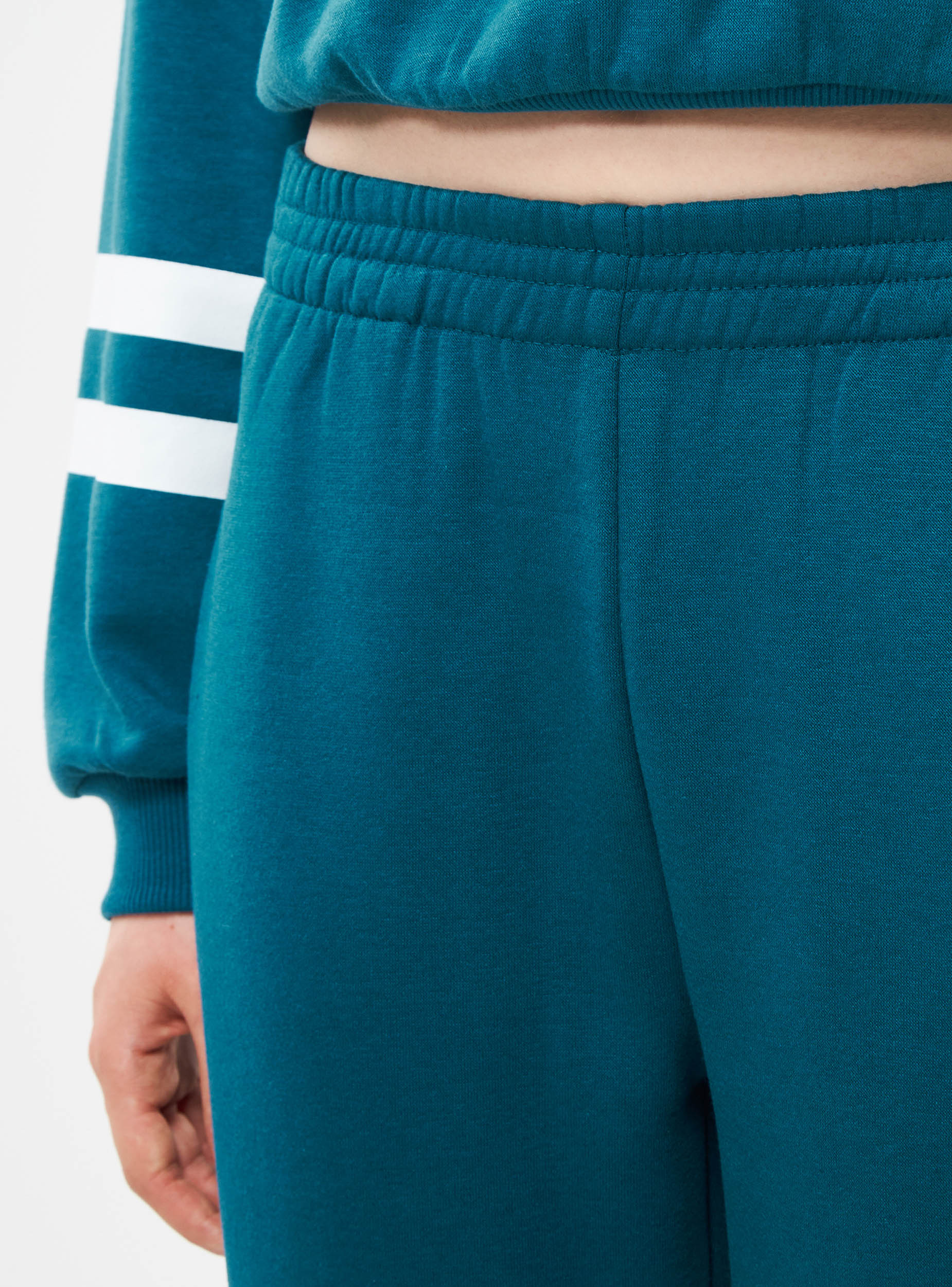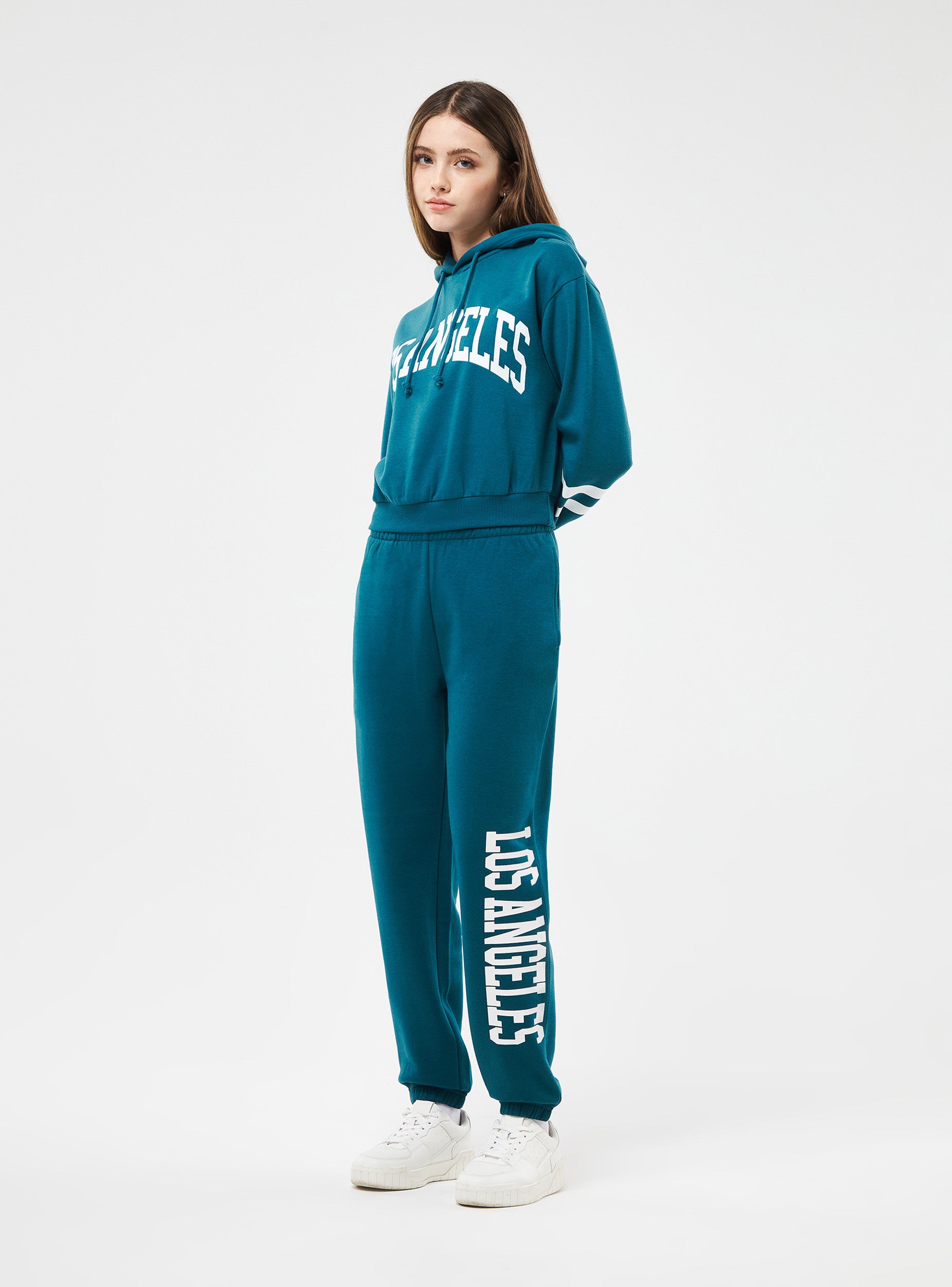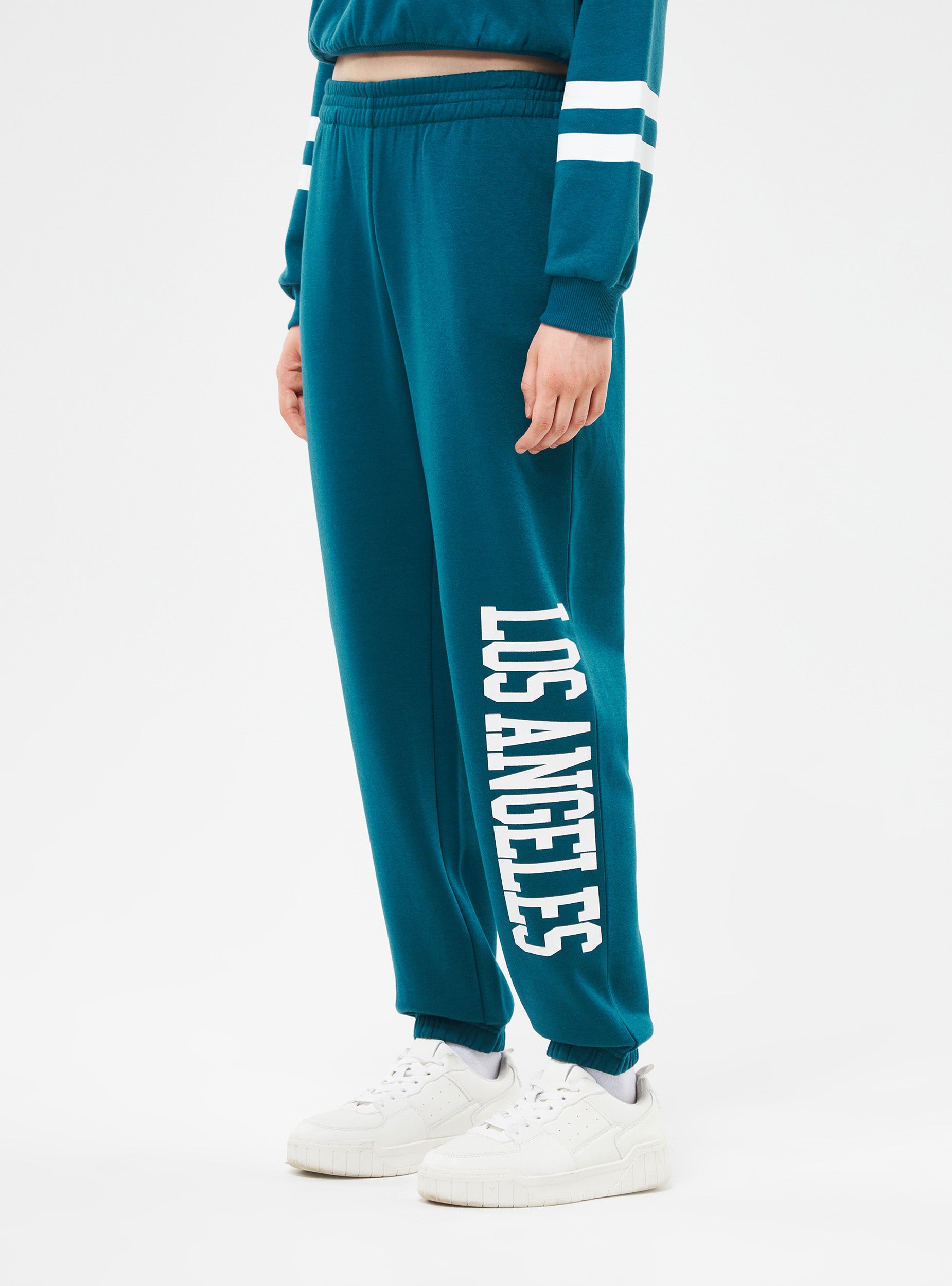 Pantaloni tuta lungo da donna. Vita alta con fascione elastico. Tasche laterali, polsino fondo con elastico. Tessuto pesante a tinta unita con stampa stile college, Vestibilità morbida.