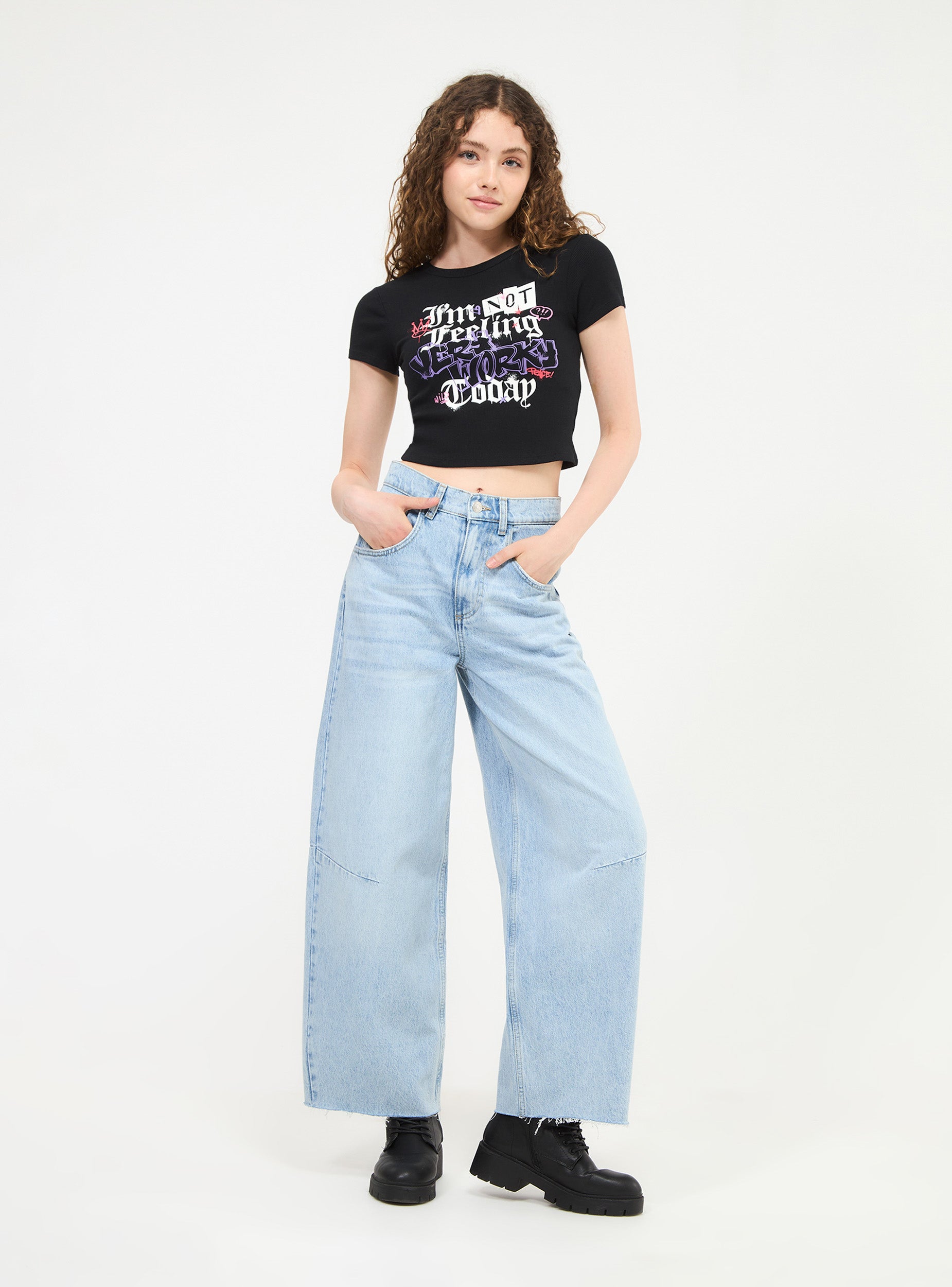 Maglietta da donna modello girocollo con stampa graffiti. Vestibilità crop.