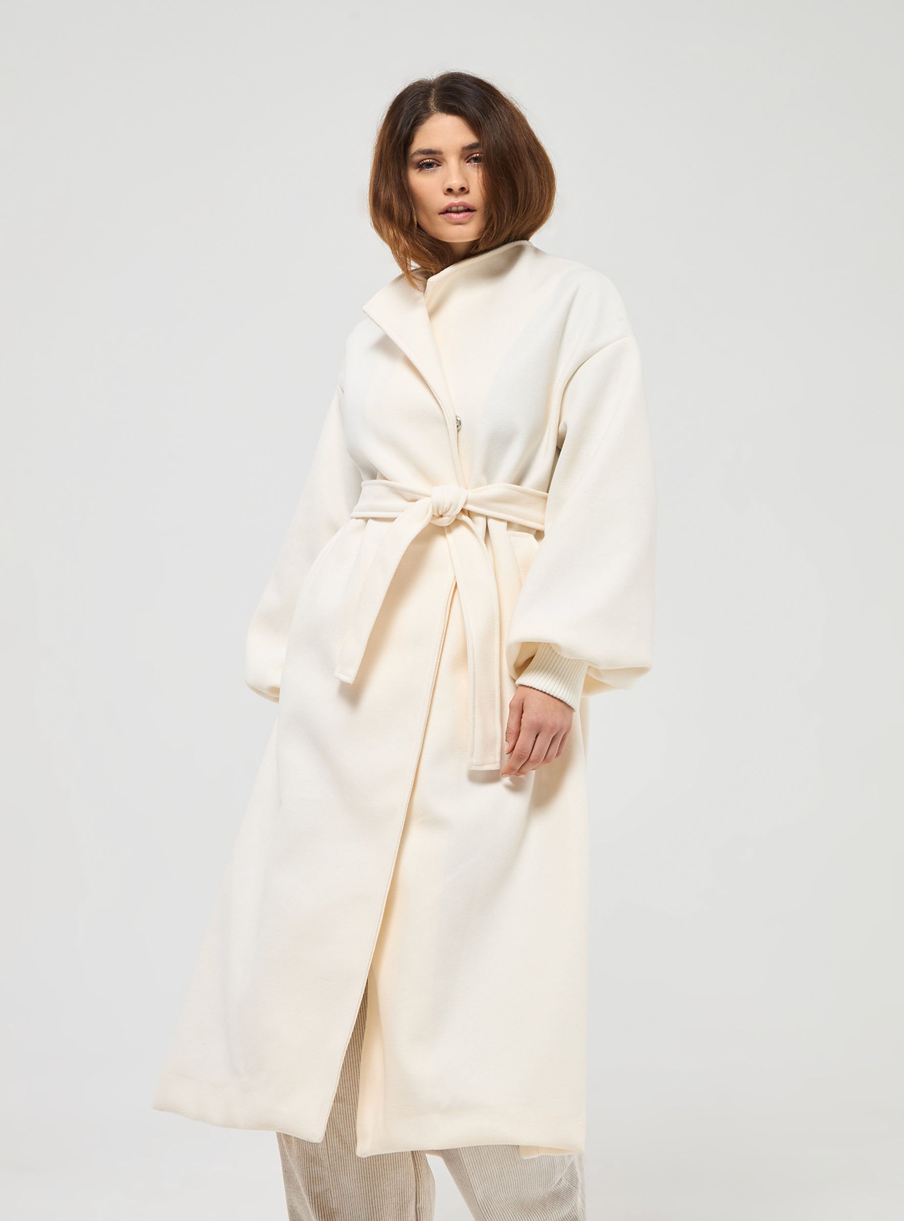 Cappotto lungo da donna in panno tinta unita , modello vestaglia con cintura , maniche ampie , tasche frontali