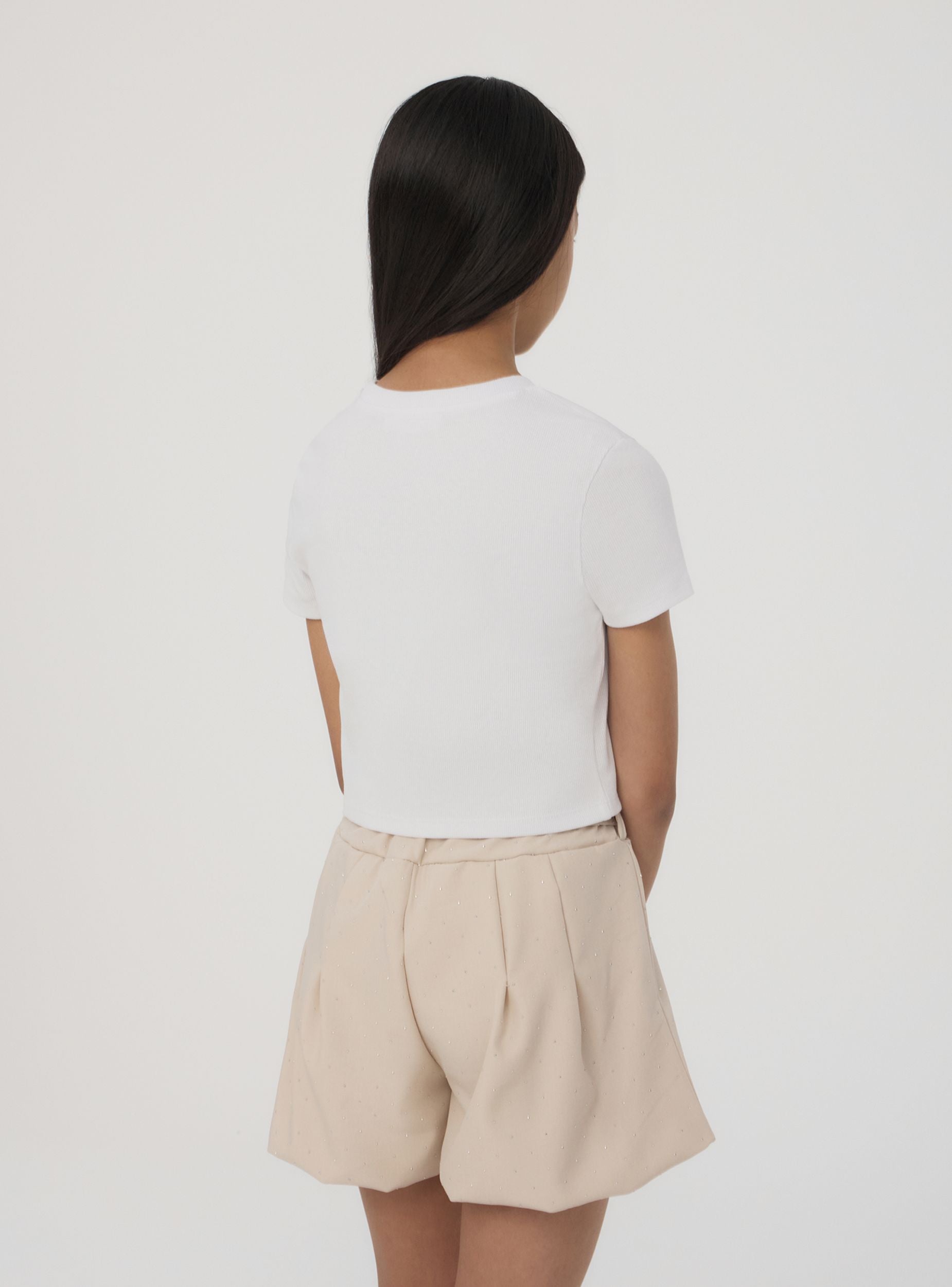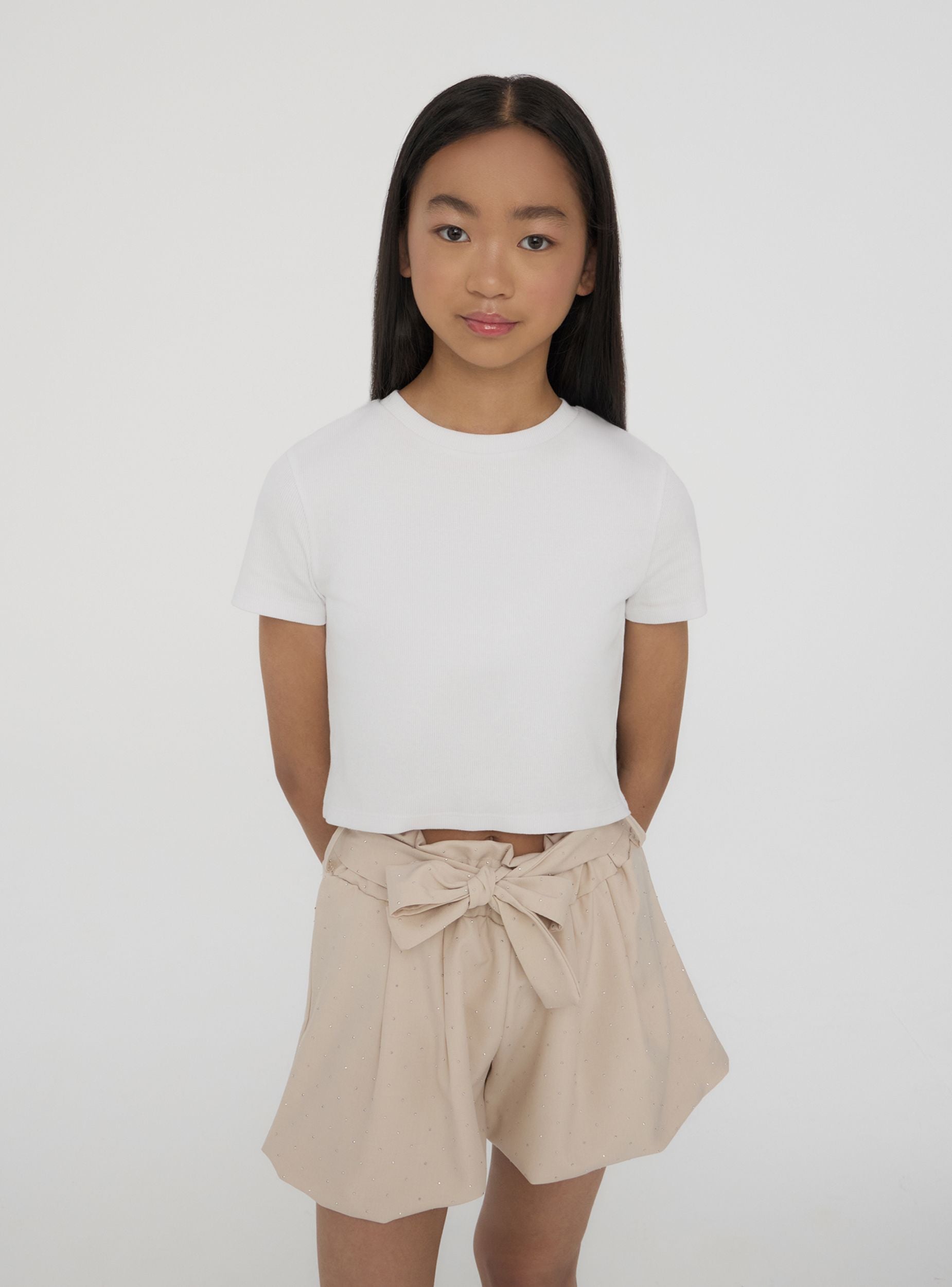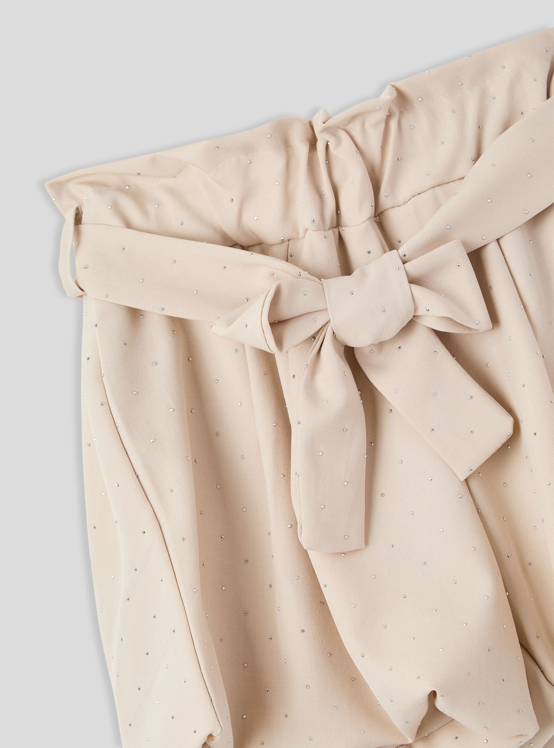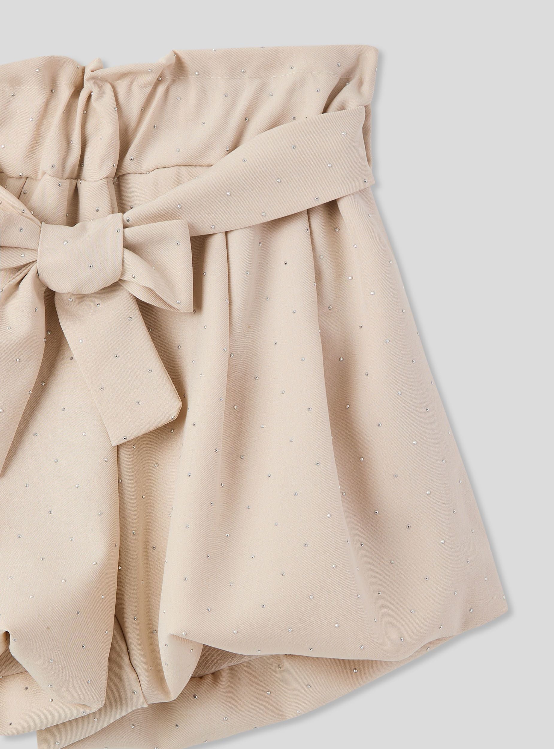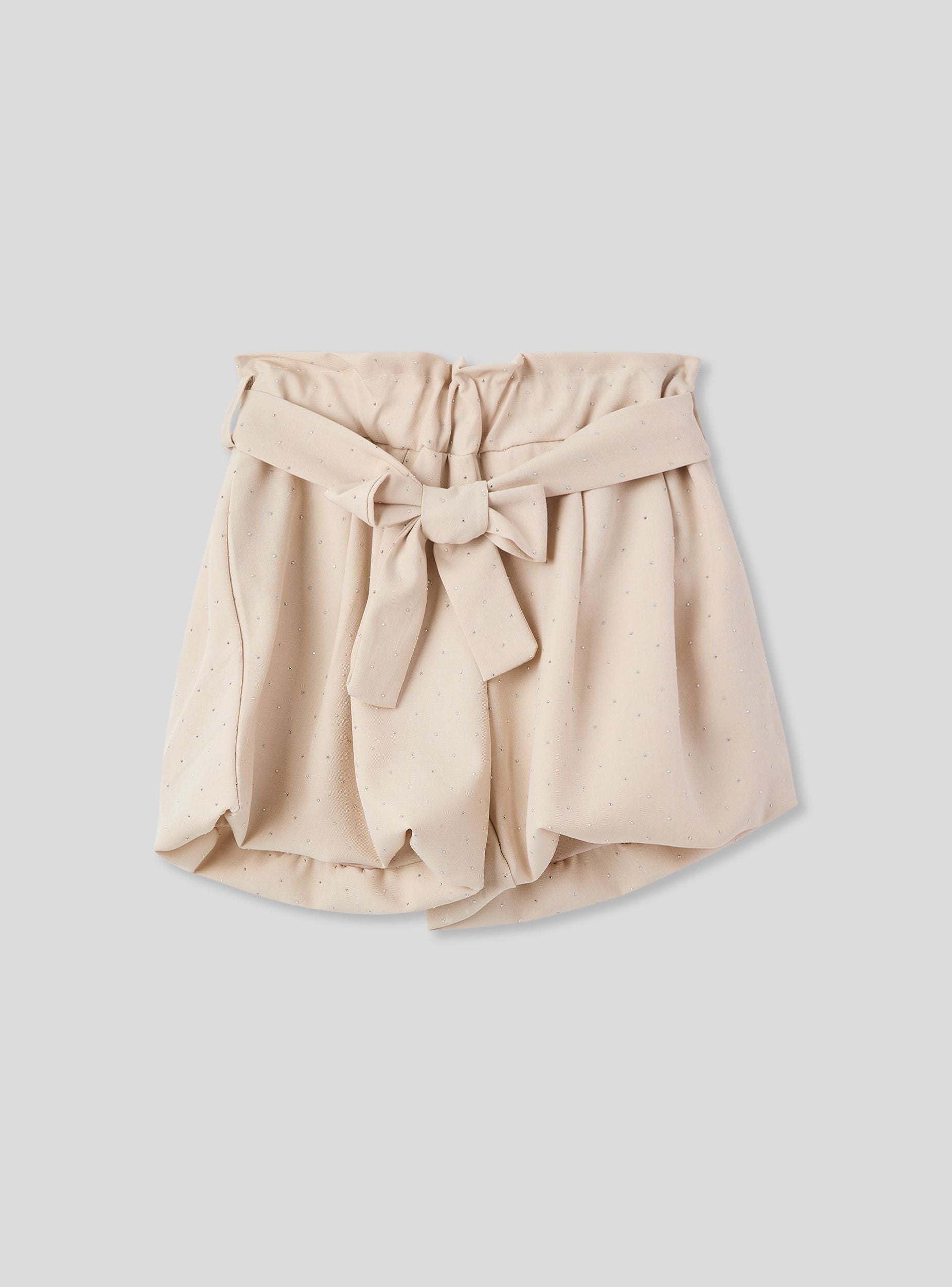 Pantaloncini da bambina ideali per un look trendy e alla moda, perfetti per il tempo libero o per occasioni casual. Caratterizzati da una fusciacca in vita chiudibile come fiocco decorativo e dettagli di strass, offrono una vestibilità regolare e un design versatile. Un capo pratico e stiloso per completare il guardaroba delle più piccole.Dettagli