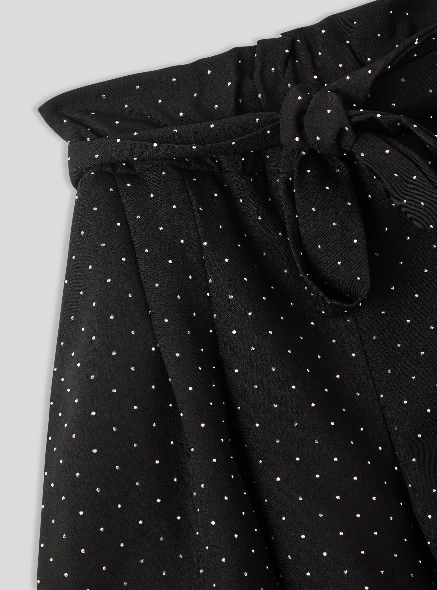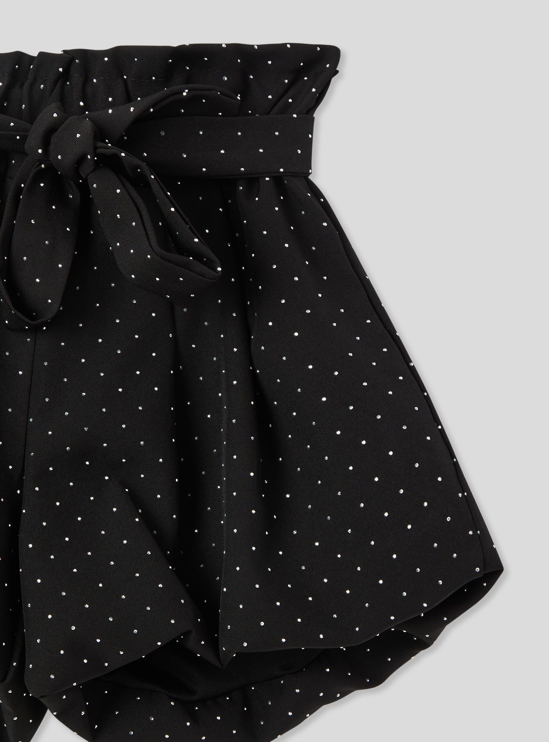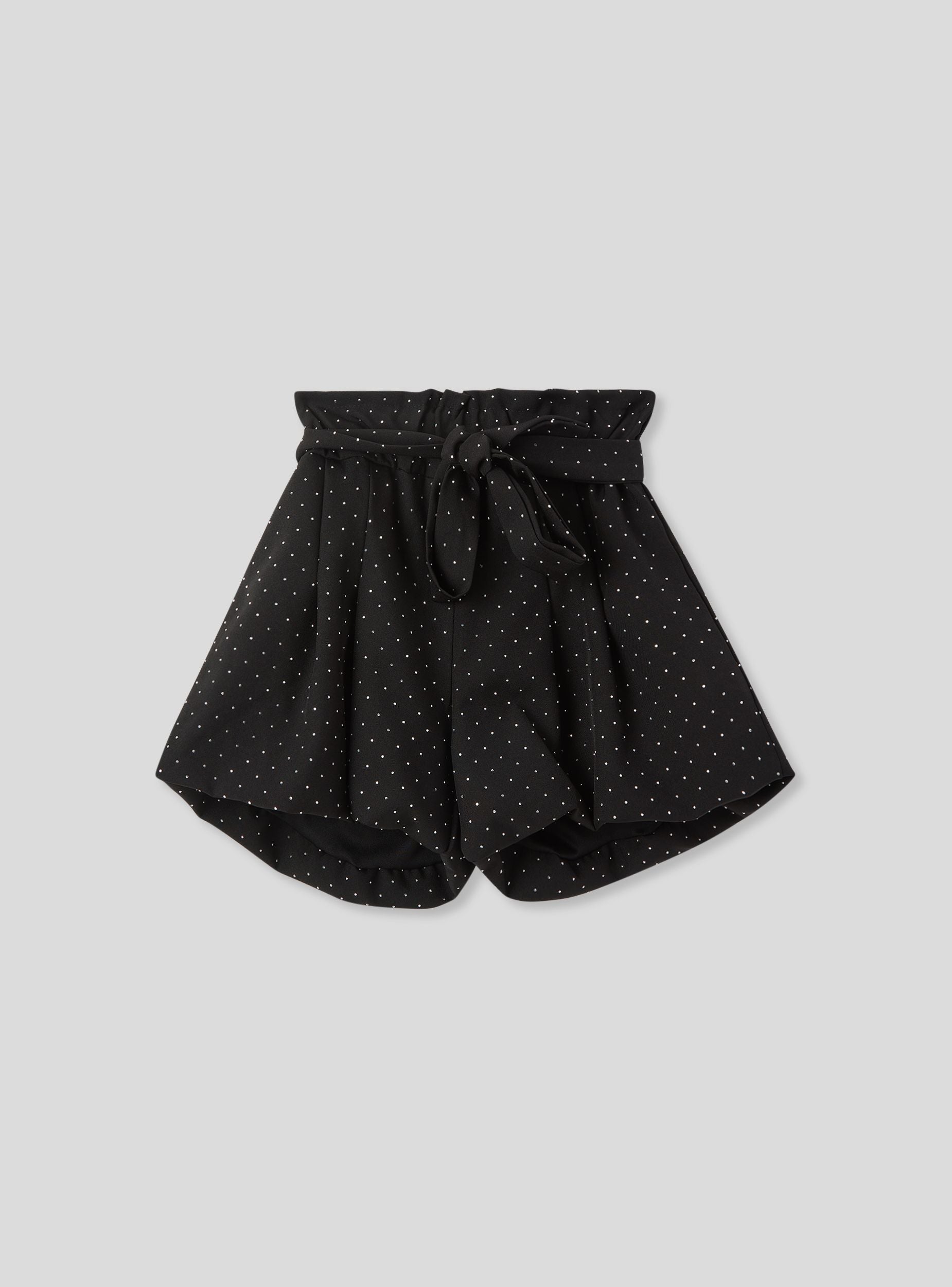 Pantaloncini da bambina ideali per un look trendy e alla moda, perfetti per il tempo libero o per occasioni casual. Caratterizzati da una fusciacca in vita chiudibile come fiocco decorativo e dettagli di strass, offrono una vestibilità regolare e un design versatile. Un capo pratico e stiloso per completare il guardaroba delle più piccole.