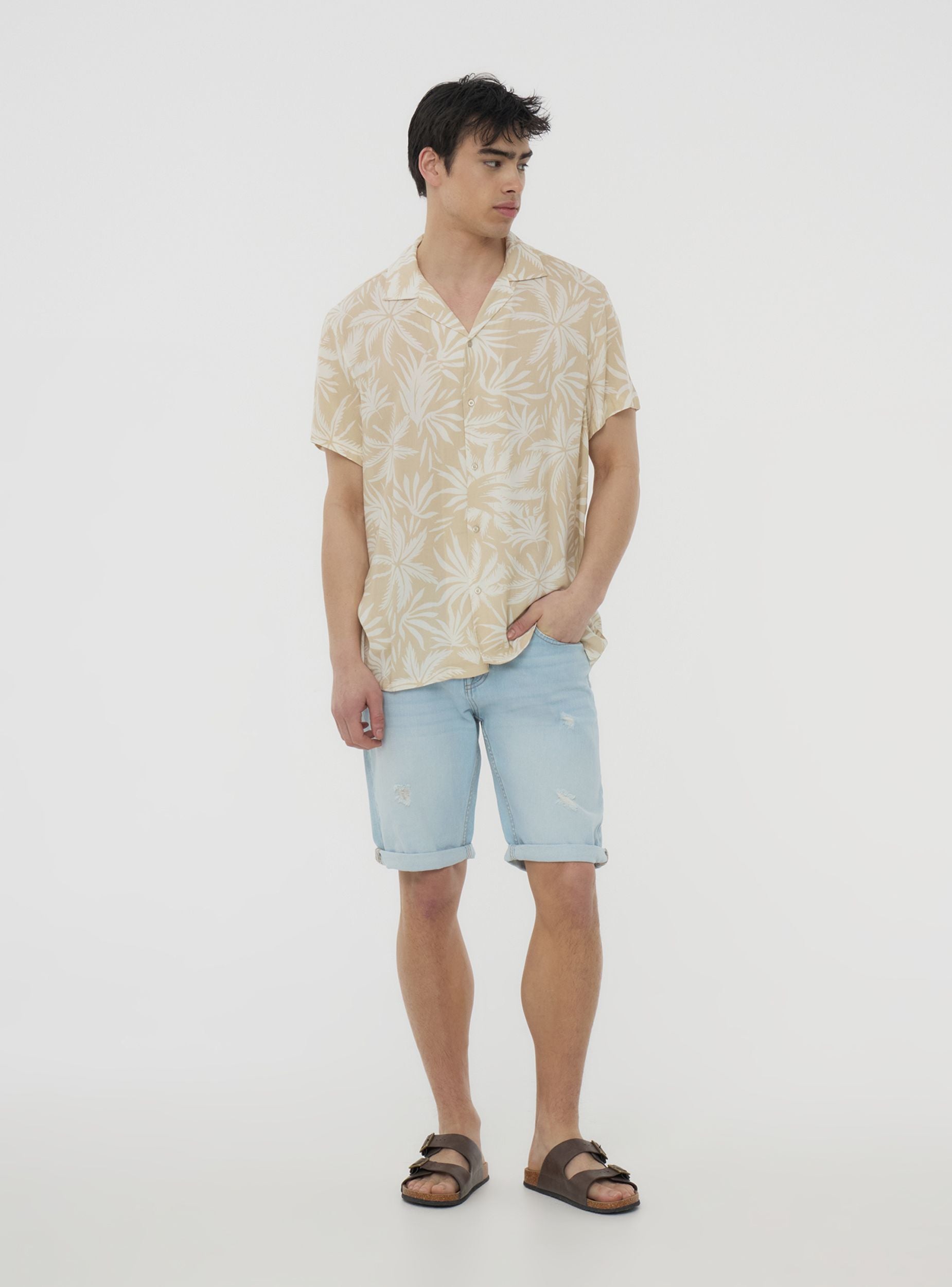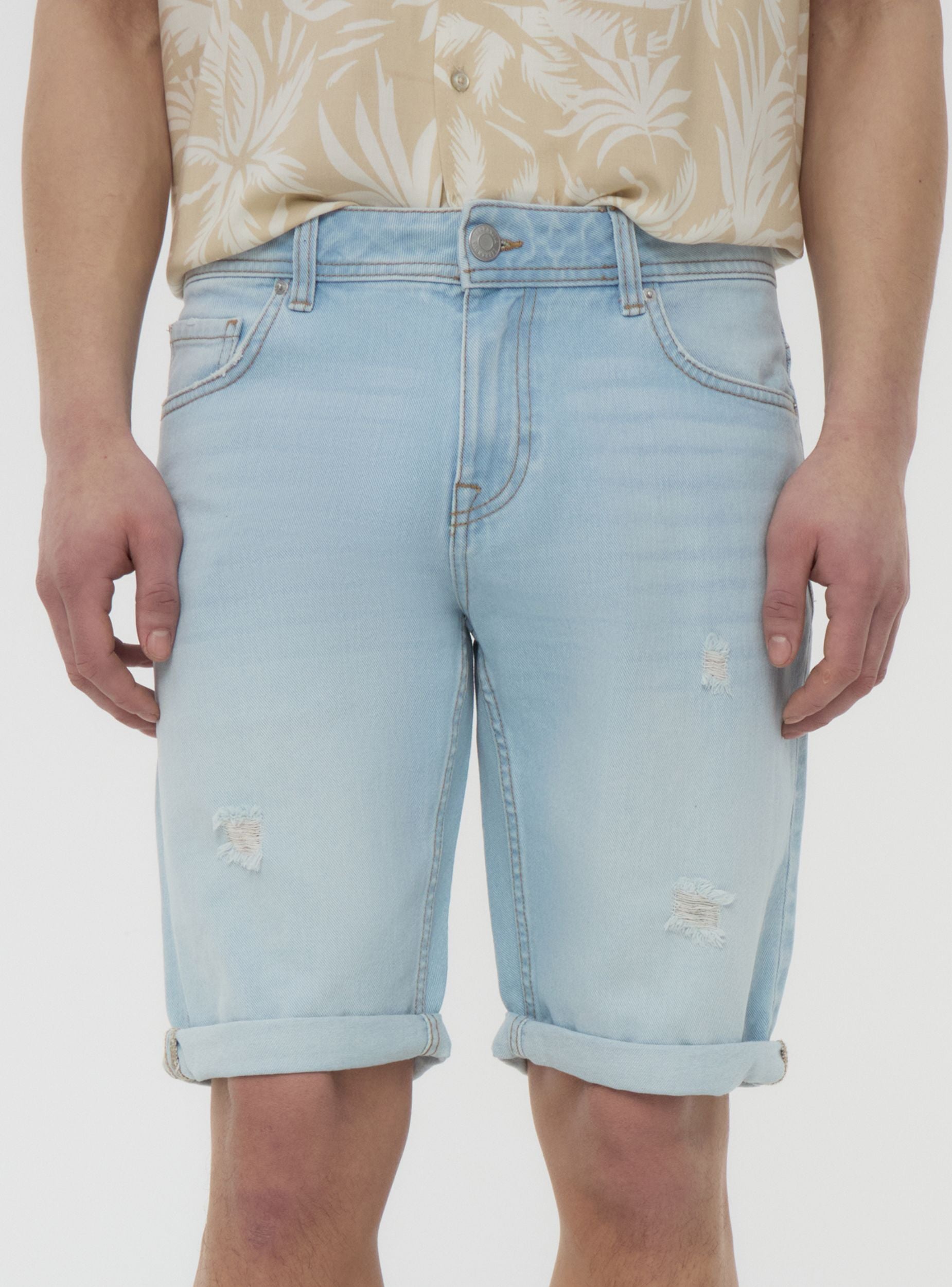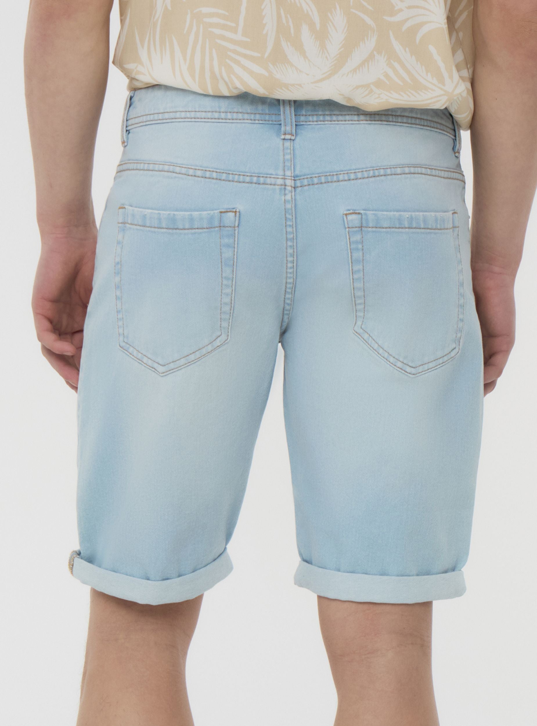 Pantaloncini da uomo in denim lavaggio chiaro ideali per un look casual e rilassato, perfetti per il tempo libero o per un outfit estivo. Caratterizzati da una vestibilità regolare, presentano dettagli strappati e un design a cinque tasche. Una scelta versatile per chi cerca comfort e stile in ogni occasione.