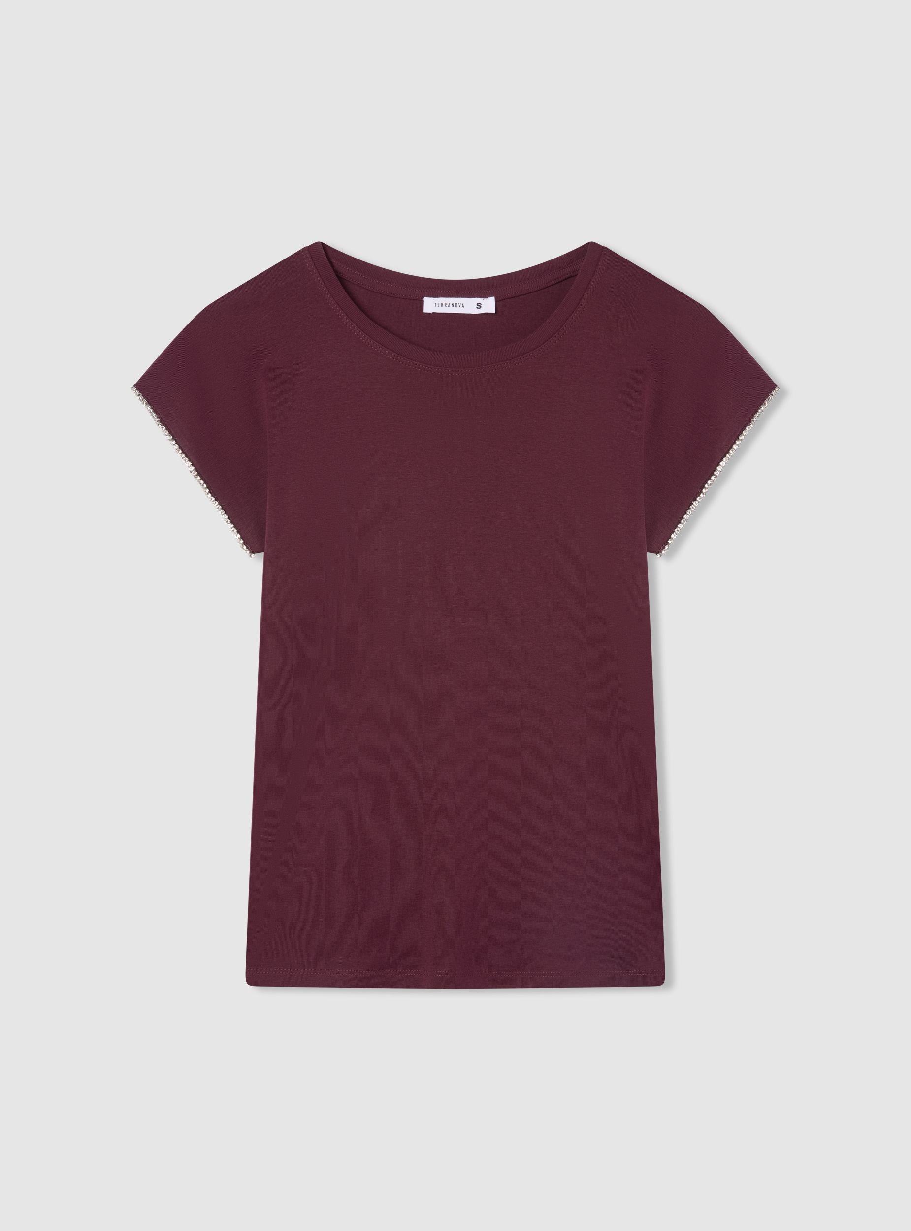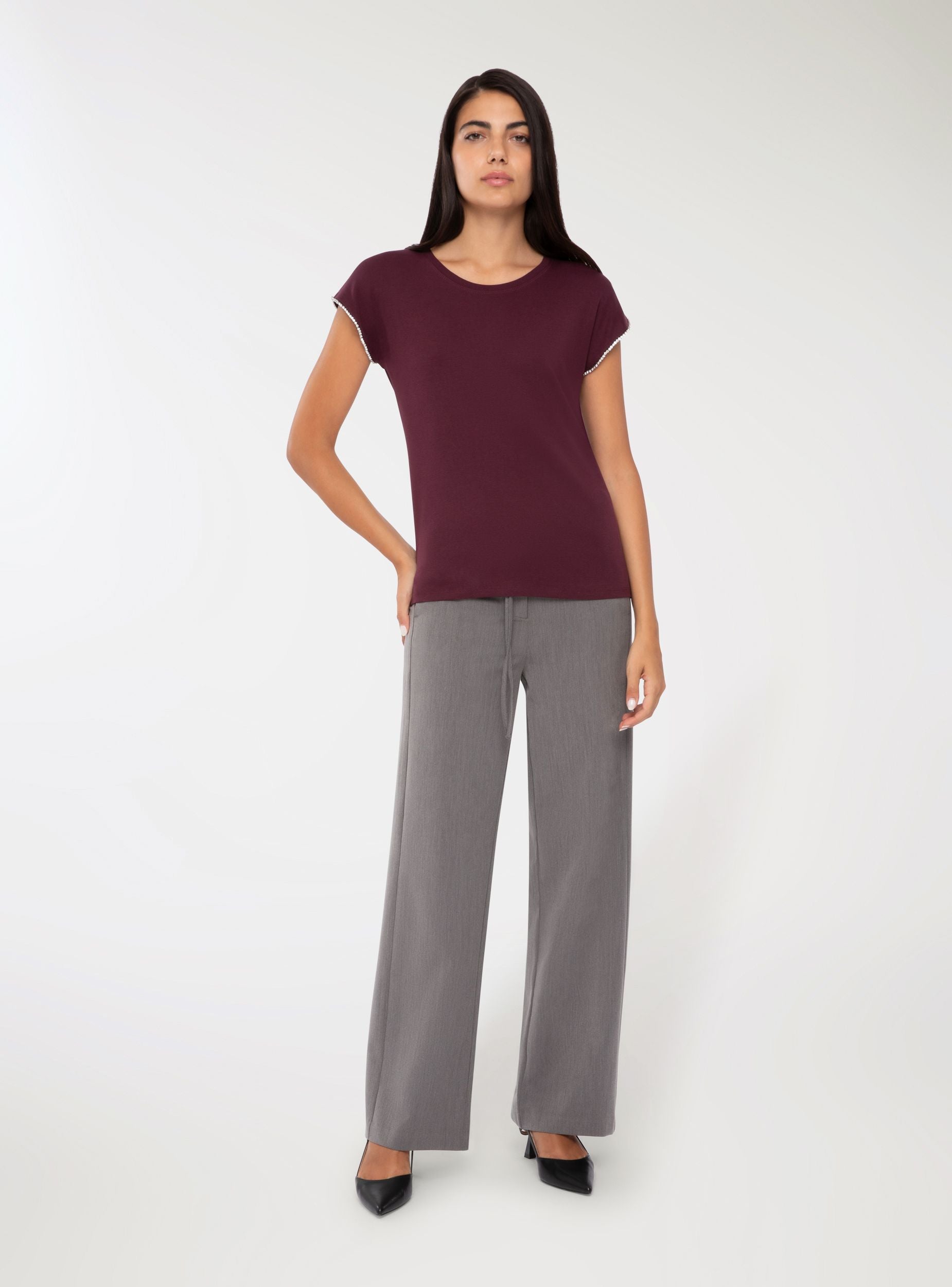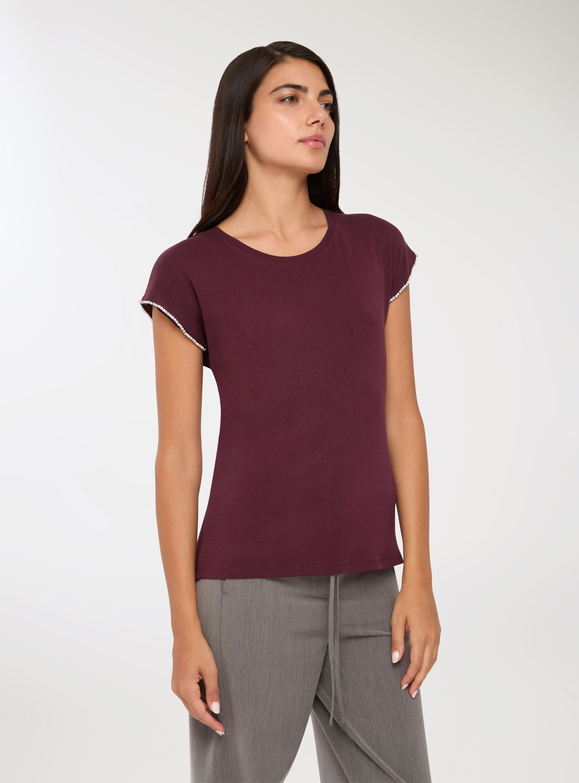 Maglietta da donna con applicazioni decorative sulle maniche. Ideale per un look casual e versatile, si abbina perfettamente a jeans o pantaloni per un outfit quotidiano. La vestibilità comoda e il design semplice la rendono adatta a diverse occasioni, dal tempo libero alle uscite informali. Perfetta per chi cerca un capo pratico e alla moda.