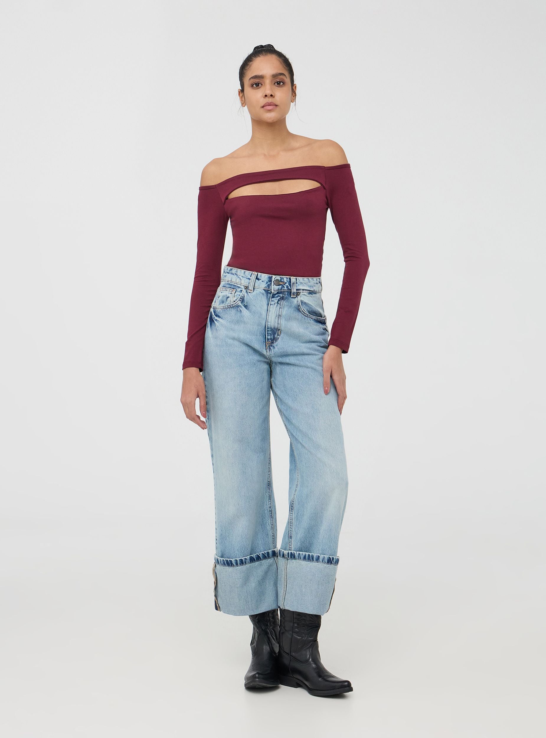 Maglia a maniche lunghe da donna a tinta unita con design elegante e moderno. Caratterizzata da uno scollo ampio con dettagli cut-out sul décolleté, che dona un tocco di stile e originalità. Perfetta per essere indossato in diverse occasioni, sia casual che più formali. La sua vestibilità mette in risalto la silhouette, mentre il taglio raffinato garantisce un look sofisticato ma contemporaneo.Dettagli