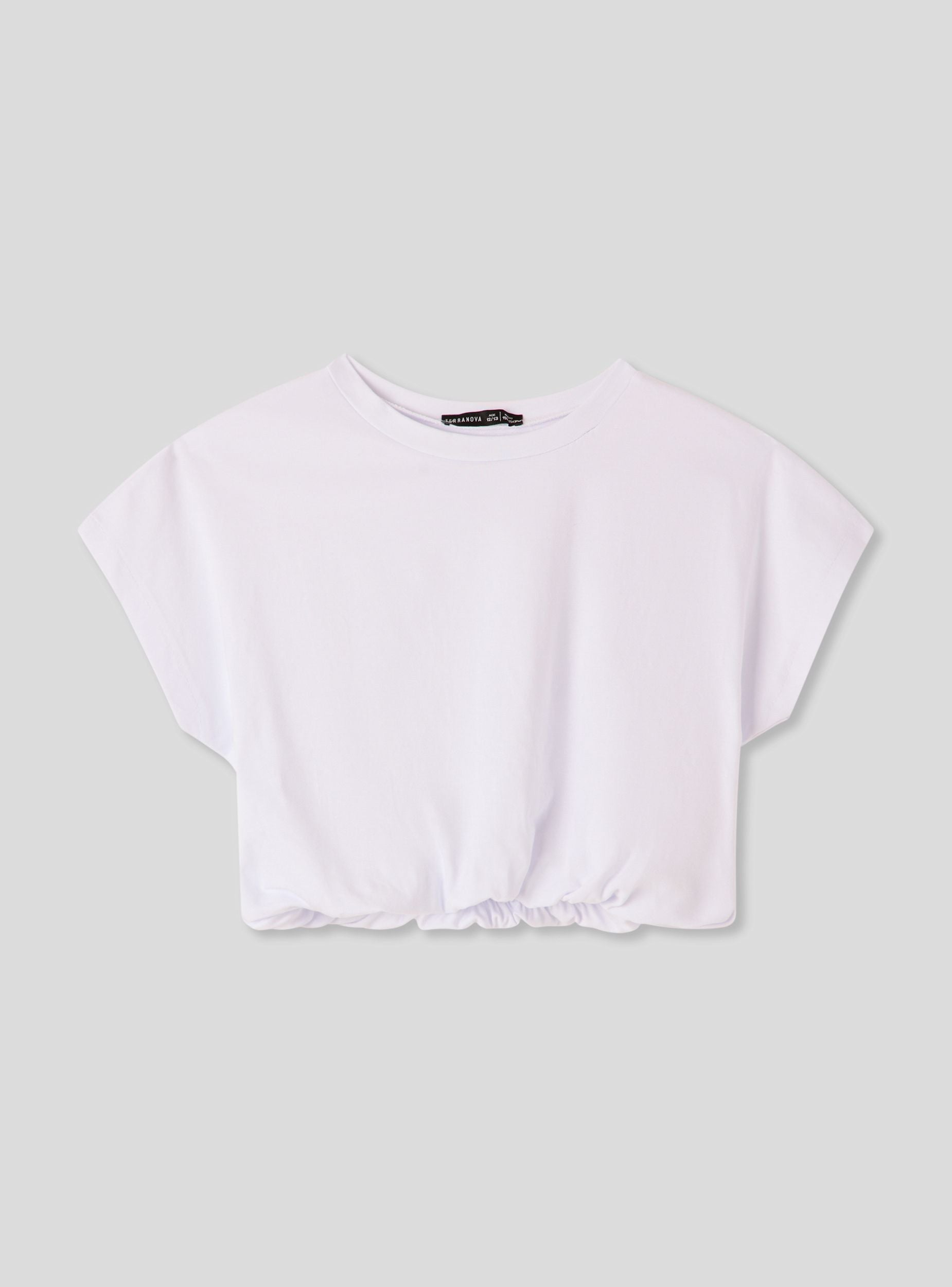 Maglietta da bambina dal taglio crop, ideale per look casual e versatili. Il fondo arricciato dona un tocco moderno e dinamico, perfetto per abbinamenti con jeans, shorts o gonne a vita alta. Le maniche corte e la vestibilità ampia assicurano comfort e libertà di movimento, rendendola adatta sia per la scuola che per il tempo libero. Design a tinta unita, facile da coordinare.
