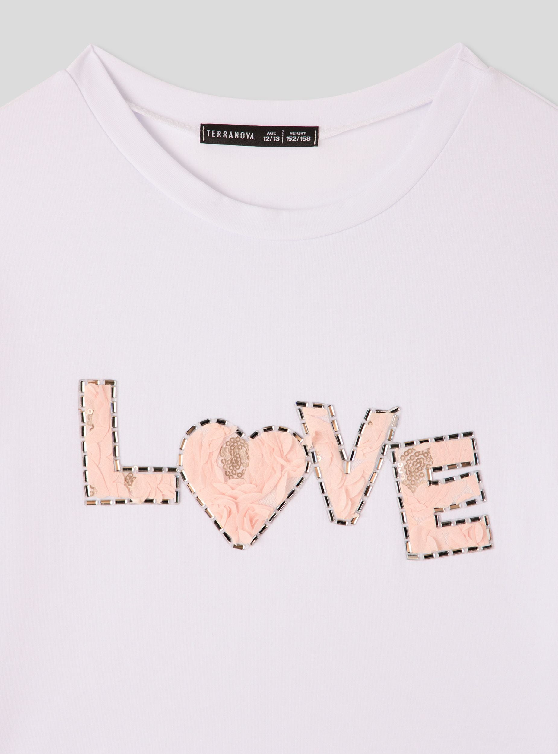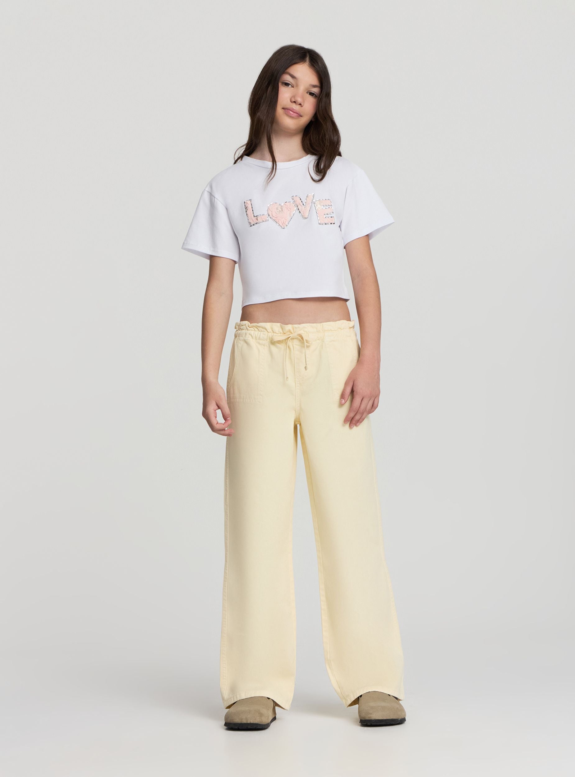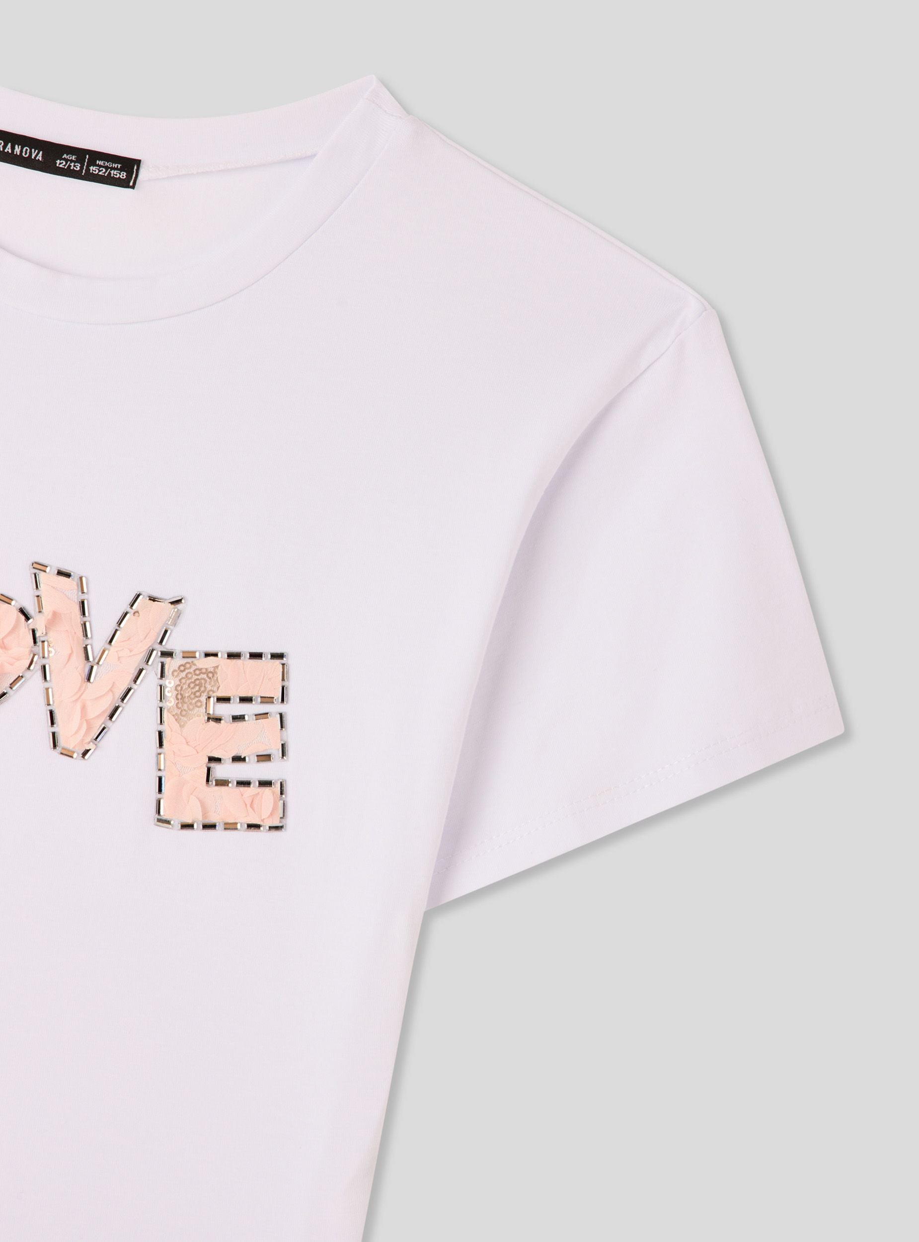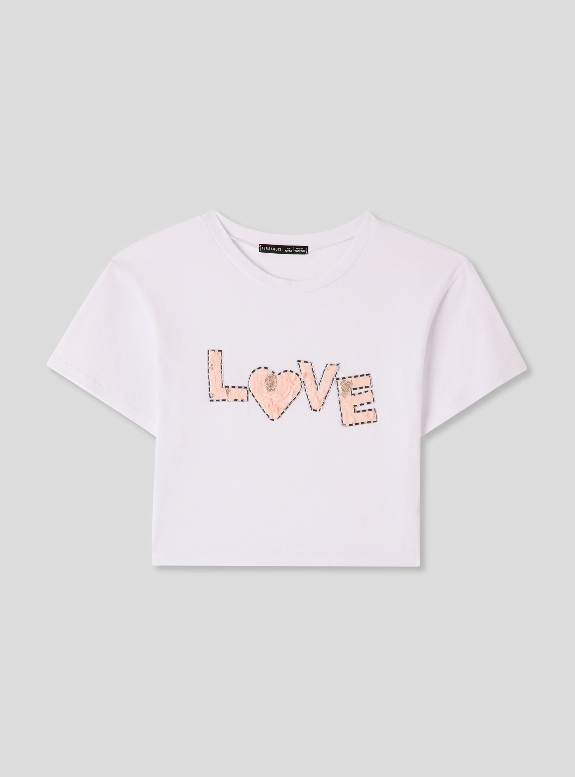 Maglietta da bambina crop a tinta unita, ideale per look casual e versatili. Presenta una scritta applicata sul davanti con dettagli decorativi effetto petali e paillettes che donano un tocco originale e giocoso. Il taglio corto la rende perfetta da abbinare a jeans o gonne a vita alta. Girocollo e maniche corte completano il design, offrendo comfort e libertà di movimento per ogni occasione.