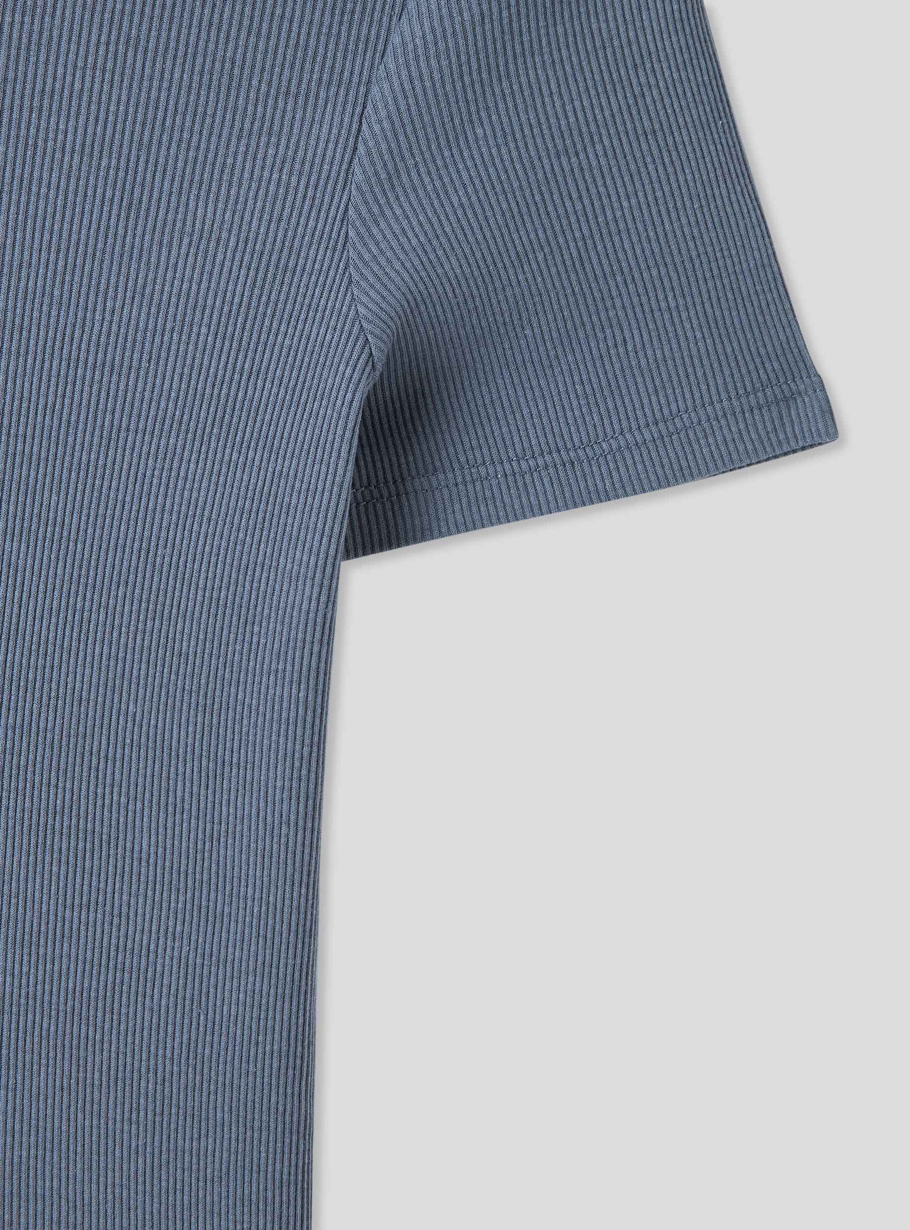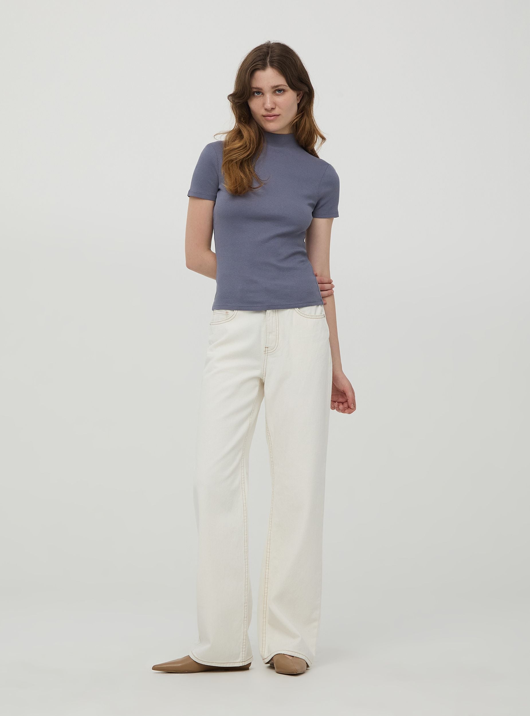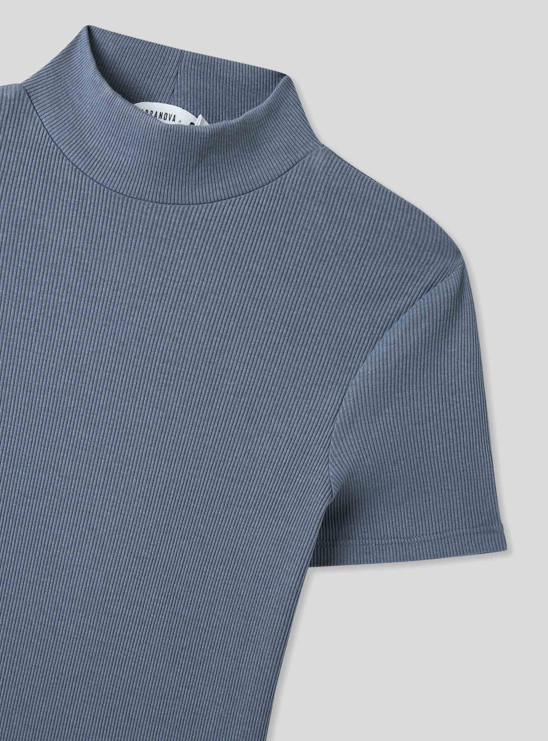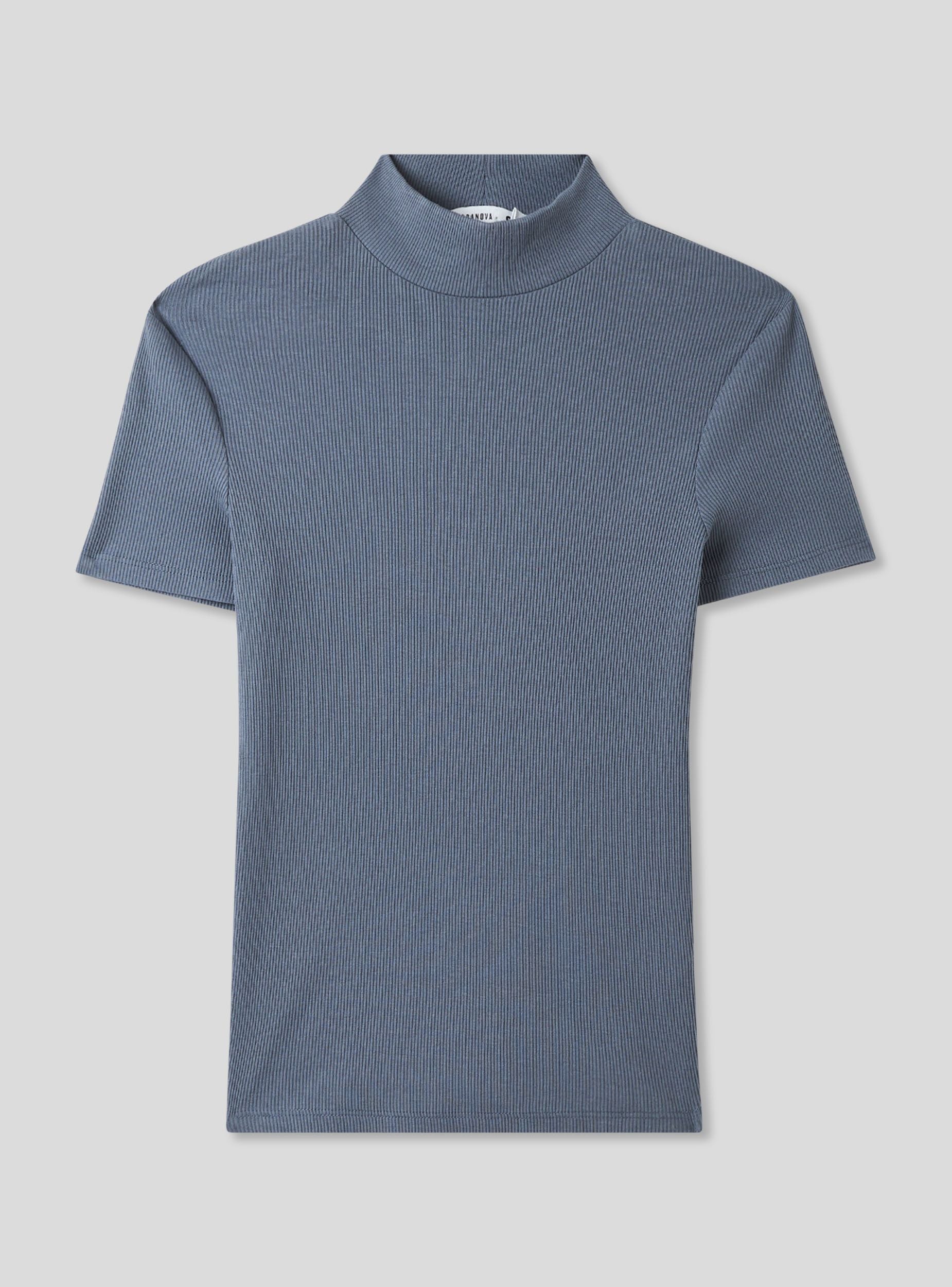 Maglietta da donna a costine con collo a lupetto e maniche corte. Tessuto a tinta unita. Vestibilità aderente.