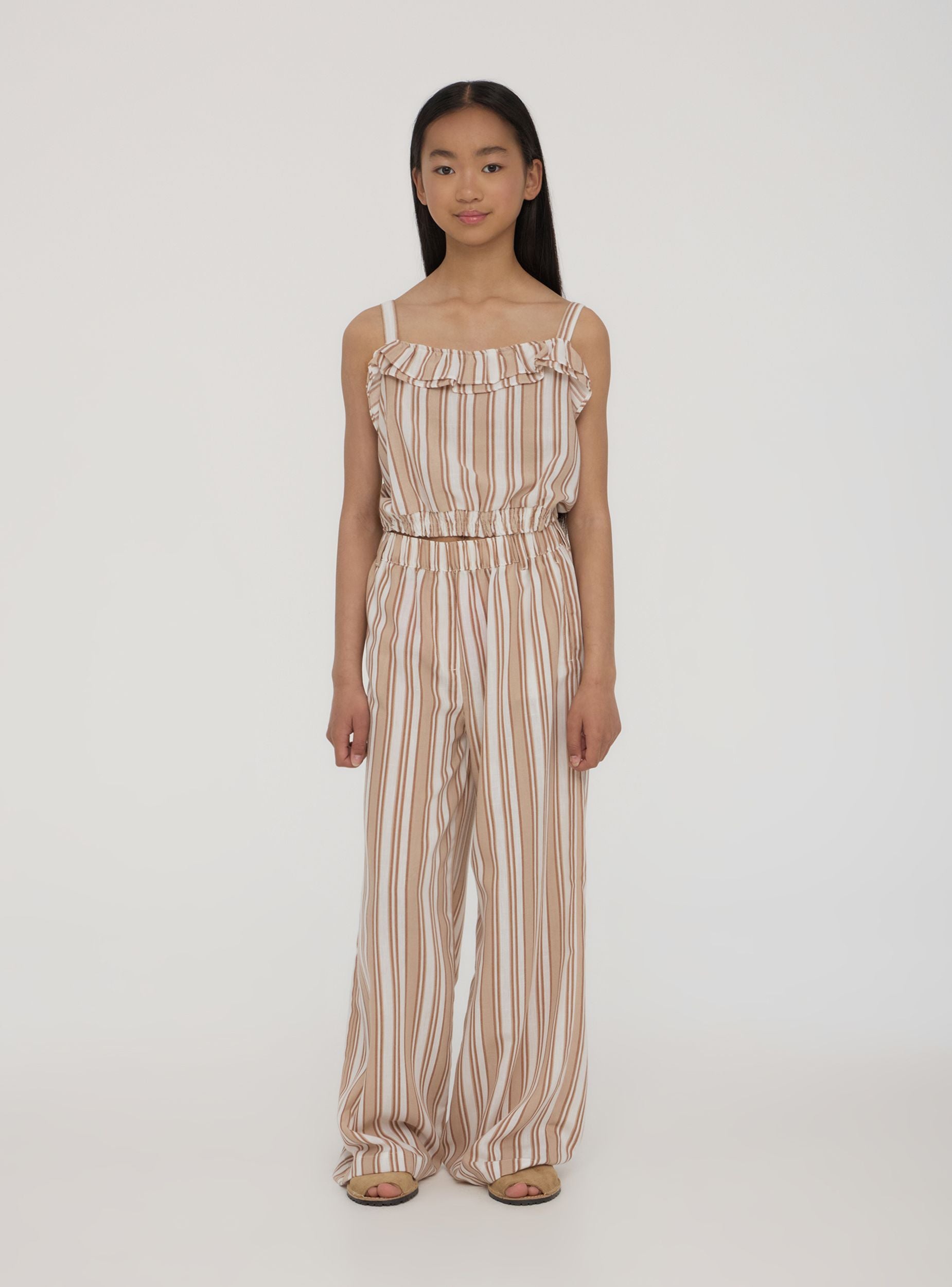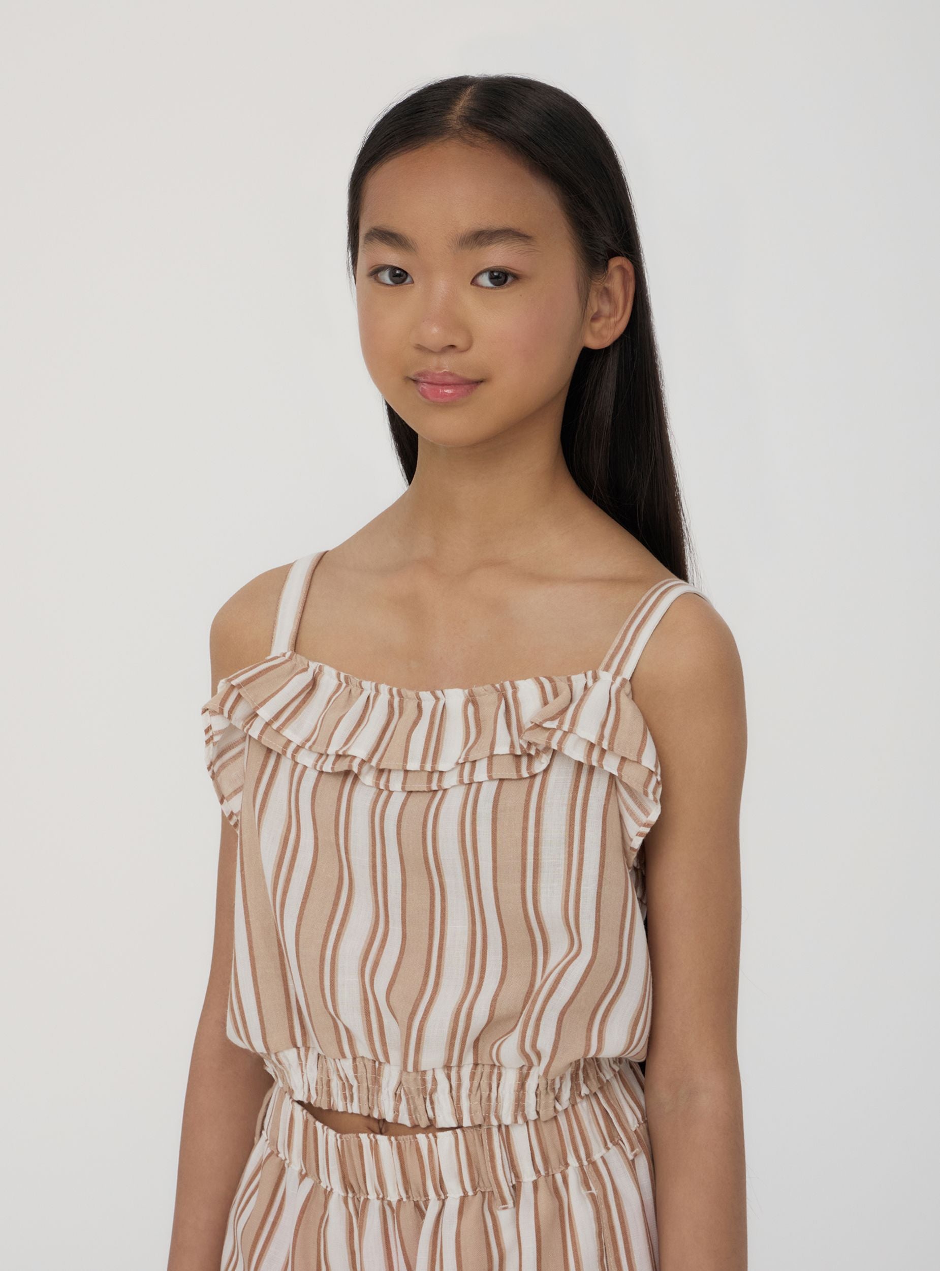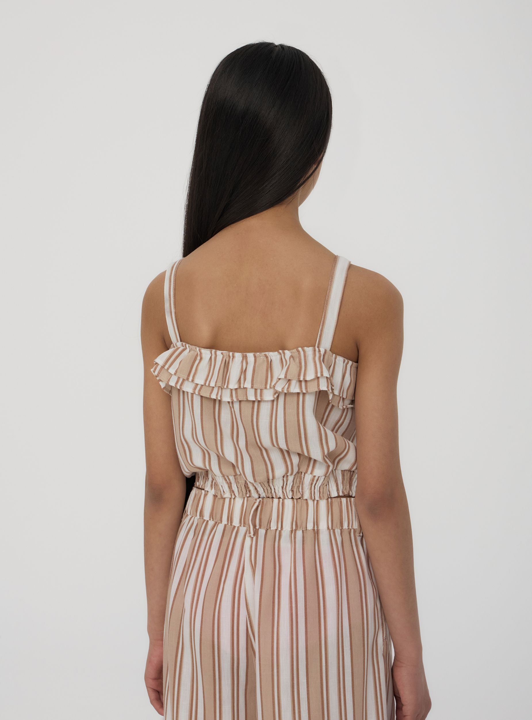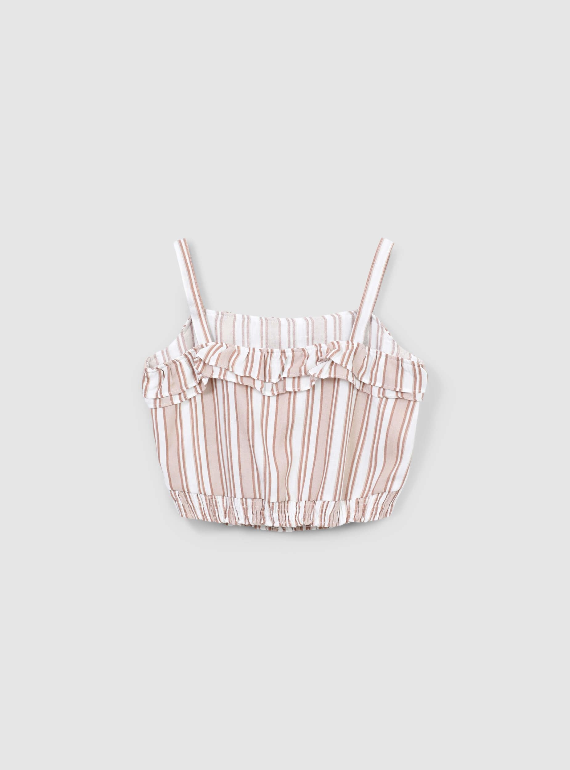 Top da bambina a righe con spalline e volant, ideale per l’estate e le giornate all’aperto. Perfetto per vacanze, passeggiate o eventi informali, si abbina facilmente a gonne, pantaloni o shorts per creare look freschi e allegri.