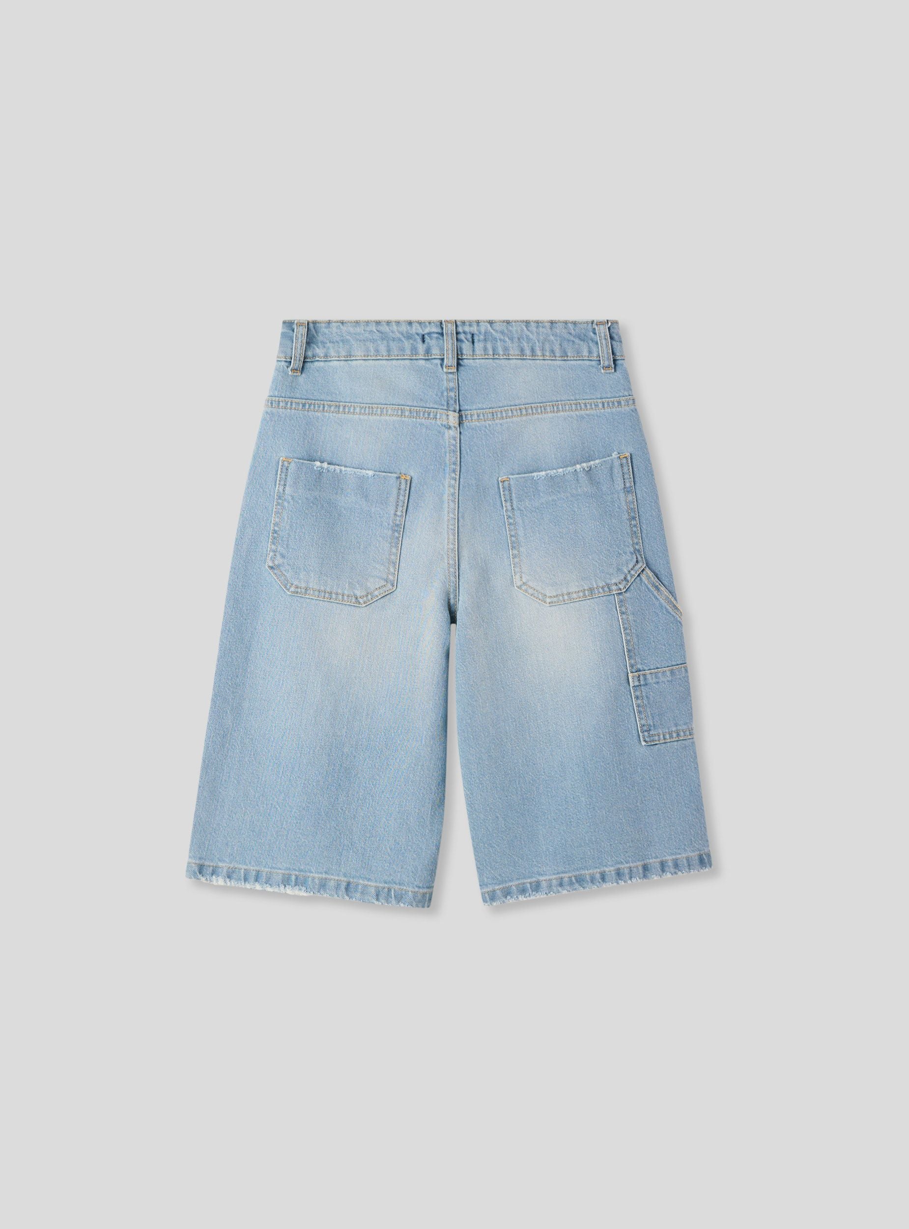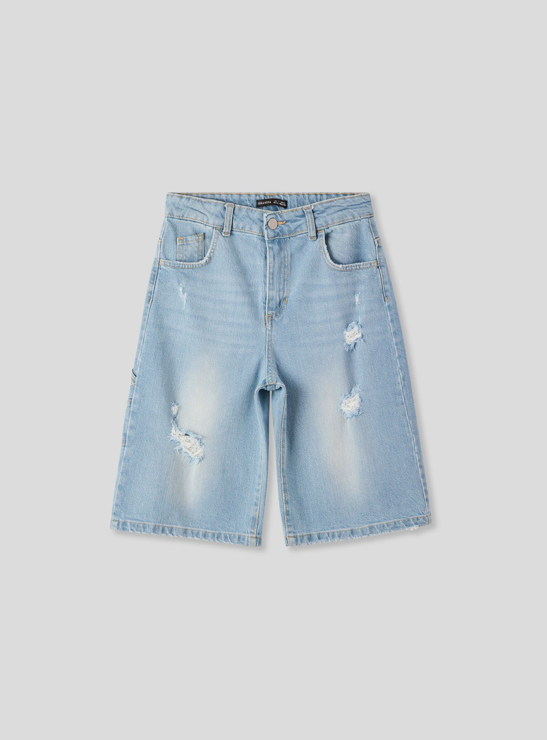 Bermuda jeans da bambino dallo stile casual, ideali per il tempo libero e le giornate estive. Presentano una vestibilità regular, chiusura con bottone e zip e dettagli con strappi per un look moderno. Perfetti da abbinare a t-shirt e sneakers per outfit pratici e di tendenza. Design a tinta unita con effetto vissuto.Dettagli