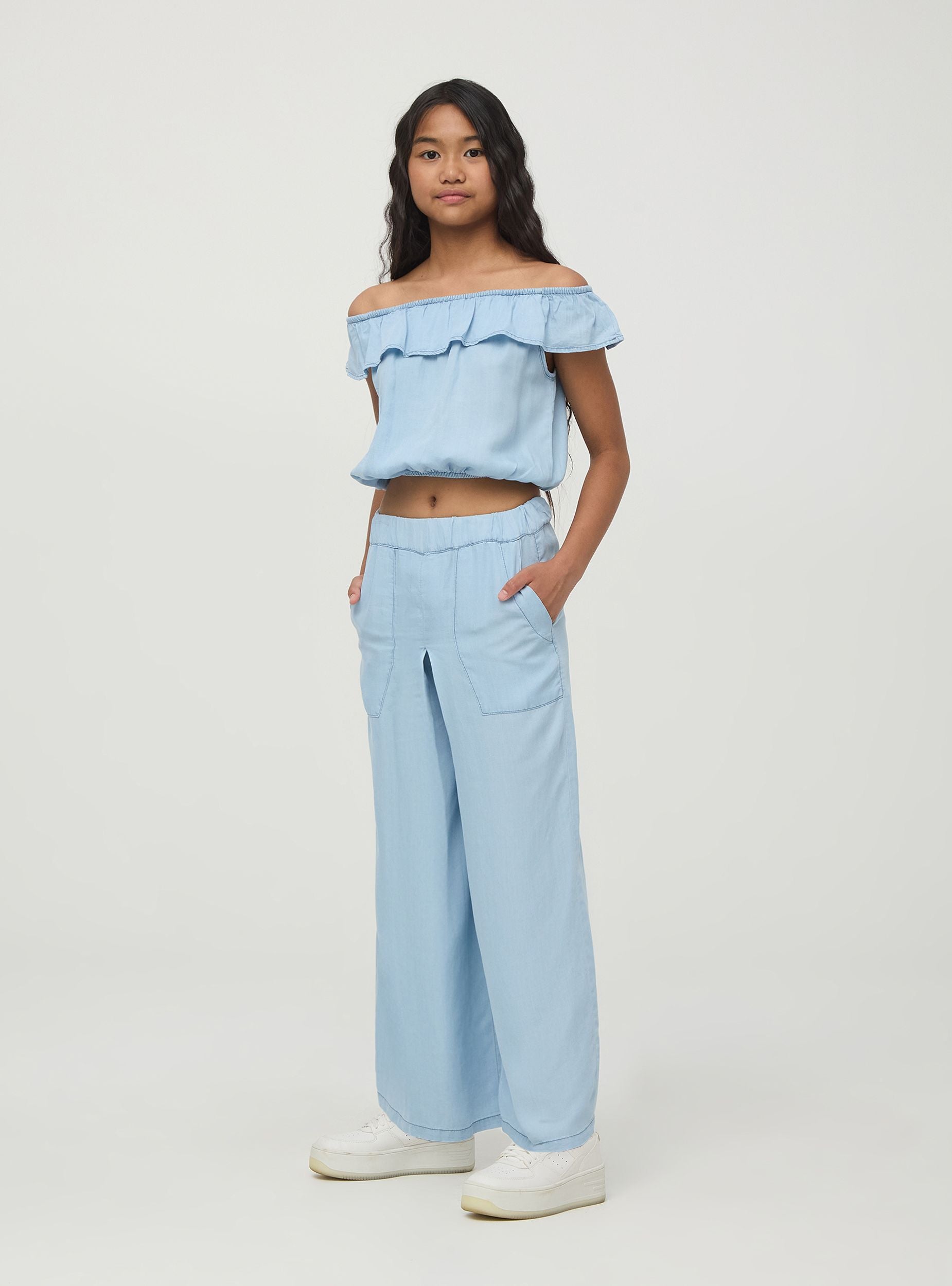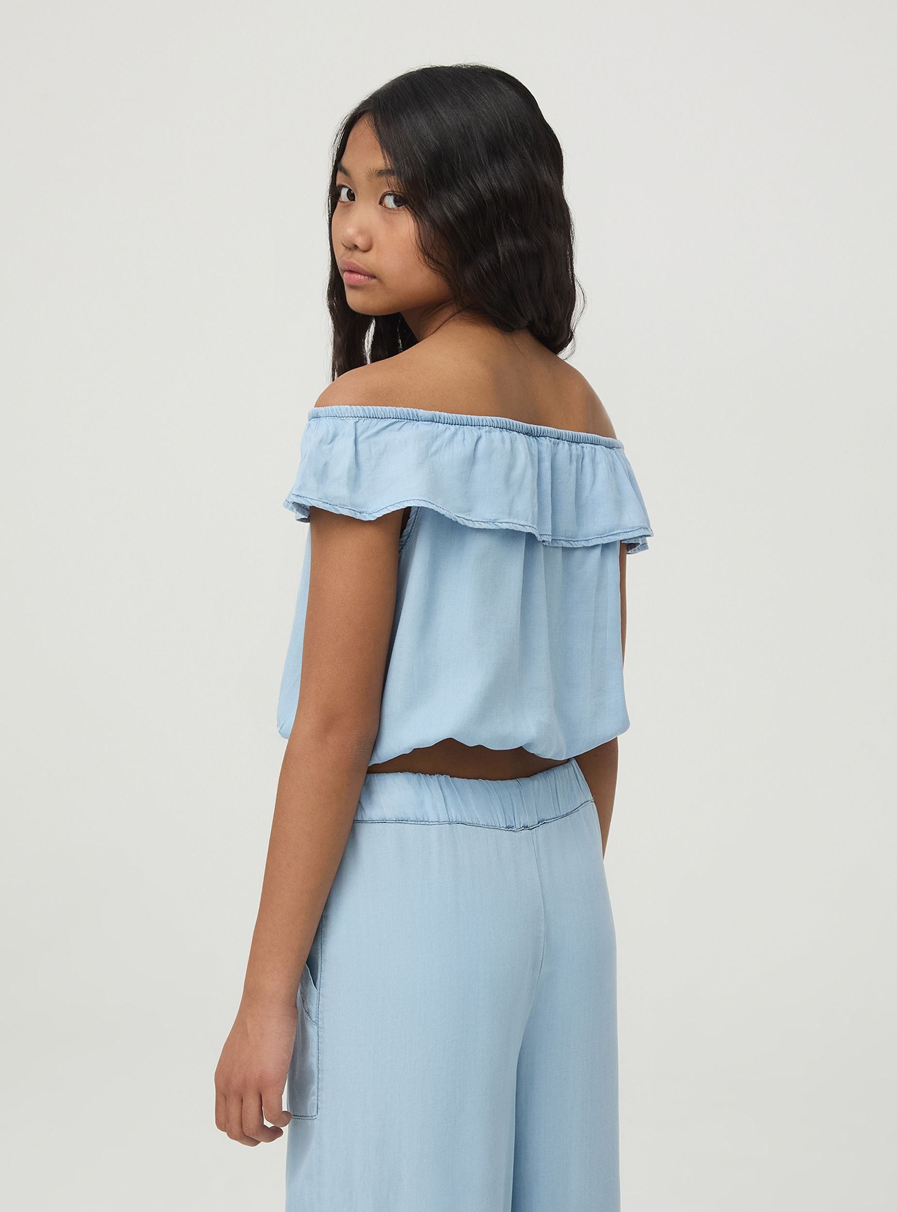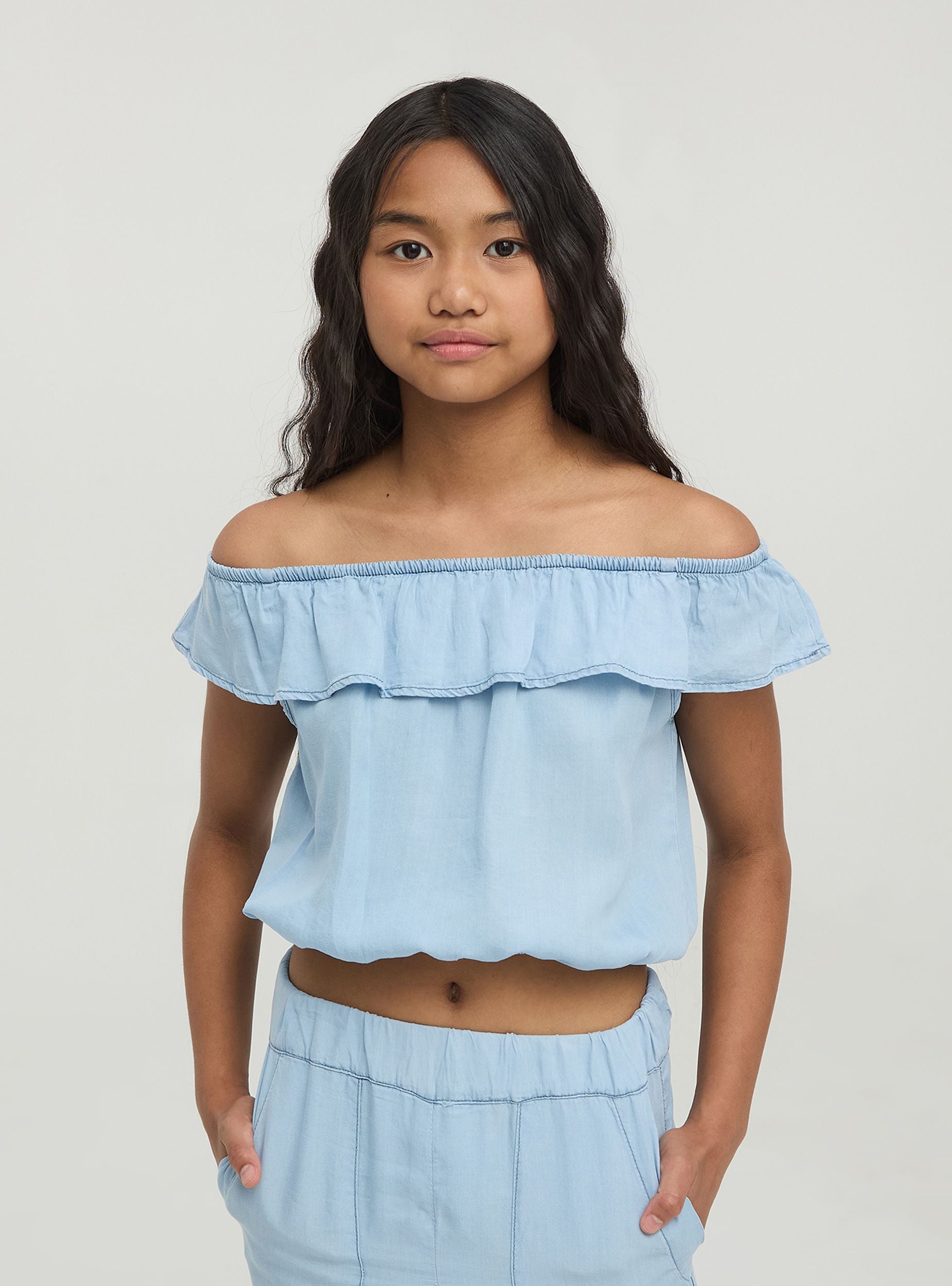 Blusa da bambina senza maniche con balza. Tessuto a tinta unita. Vestibilità regular.