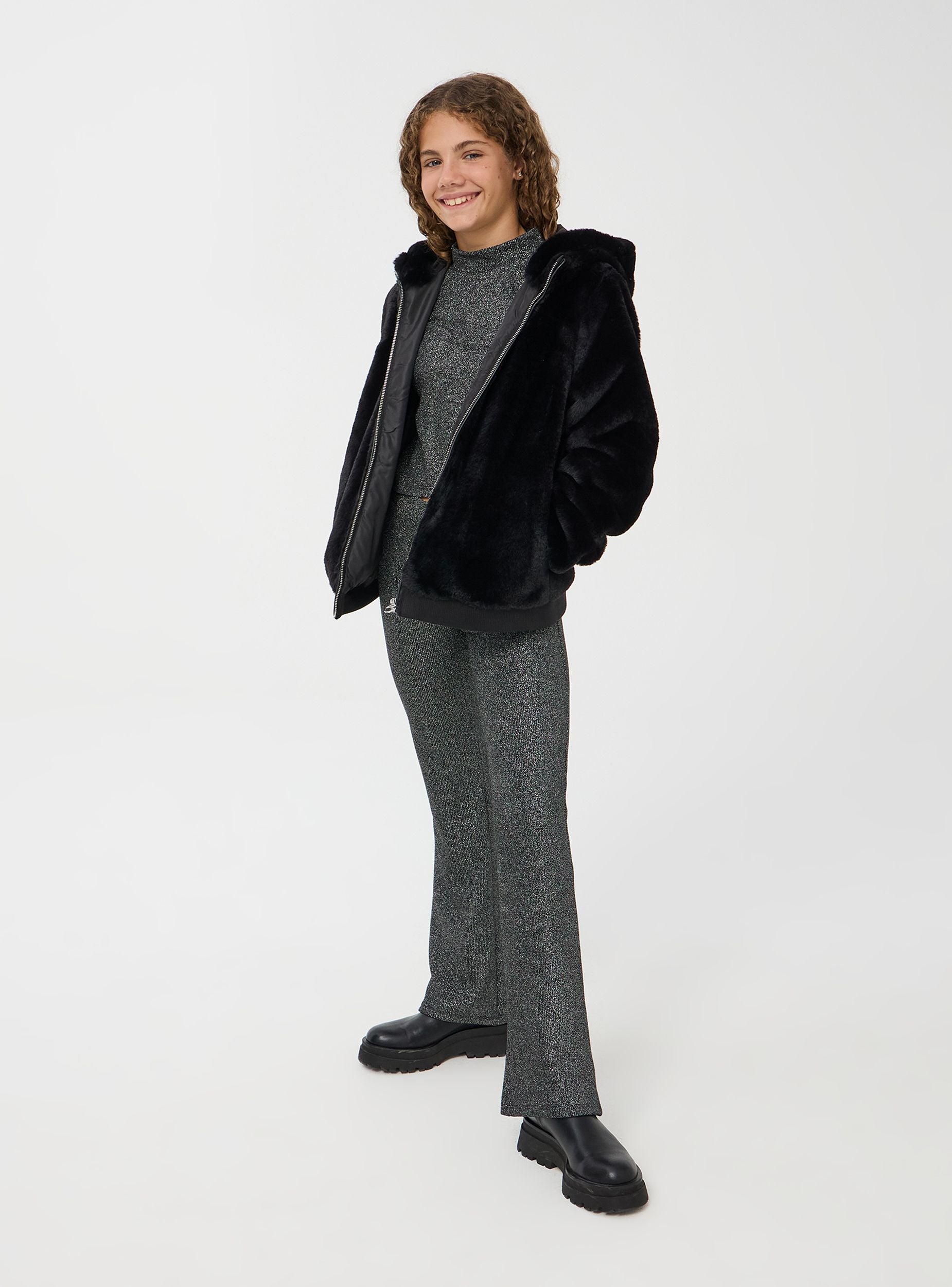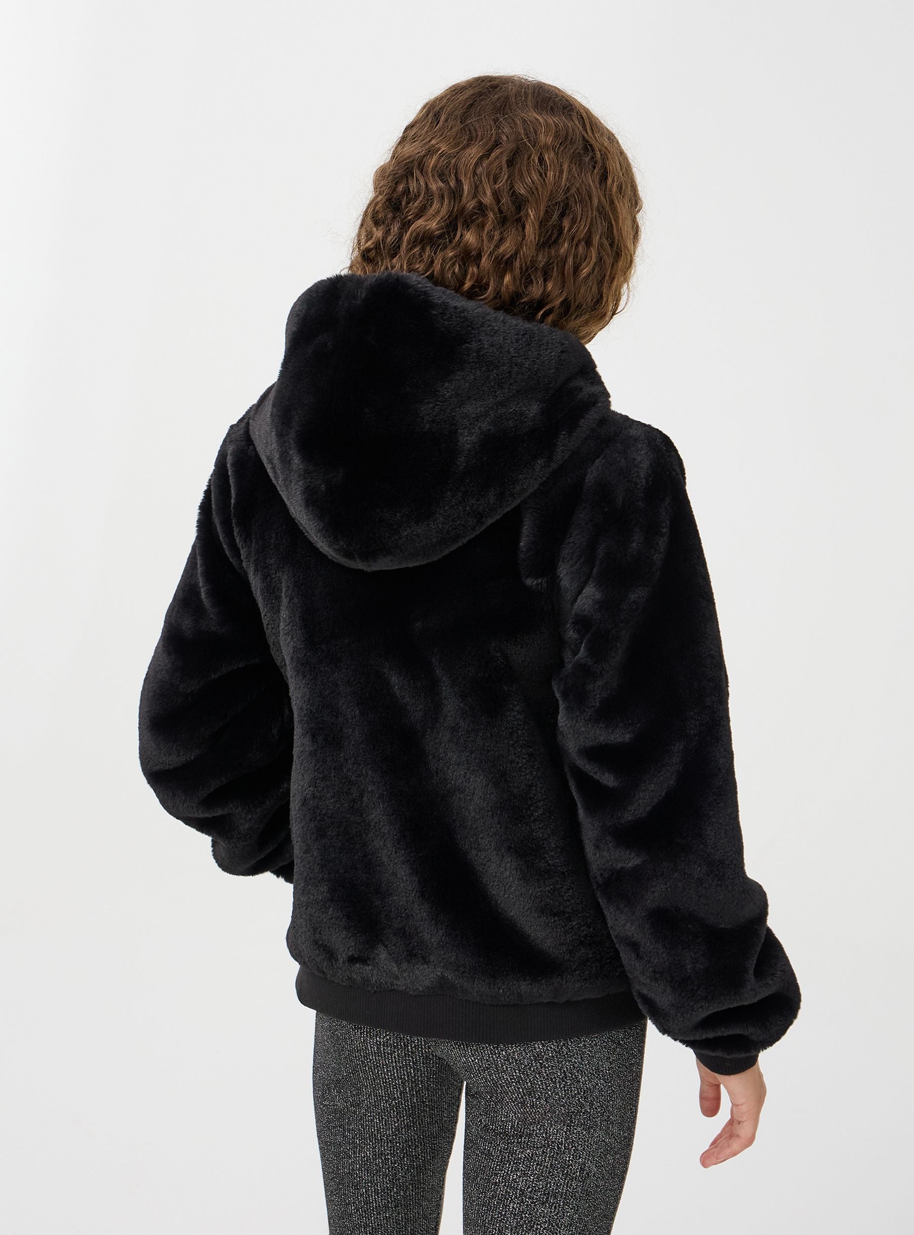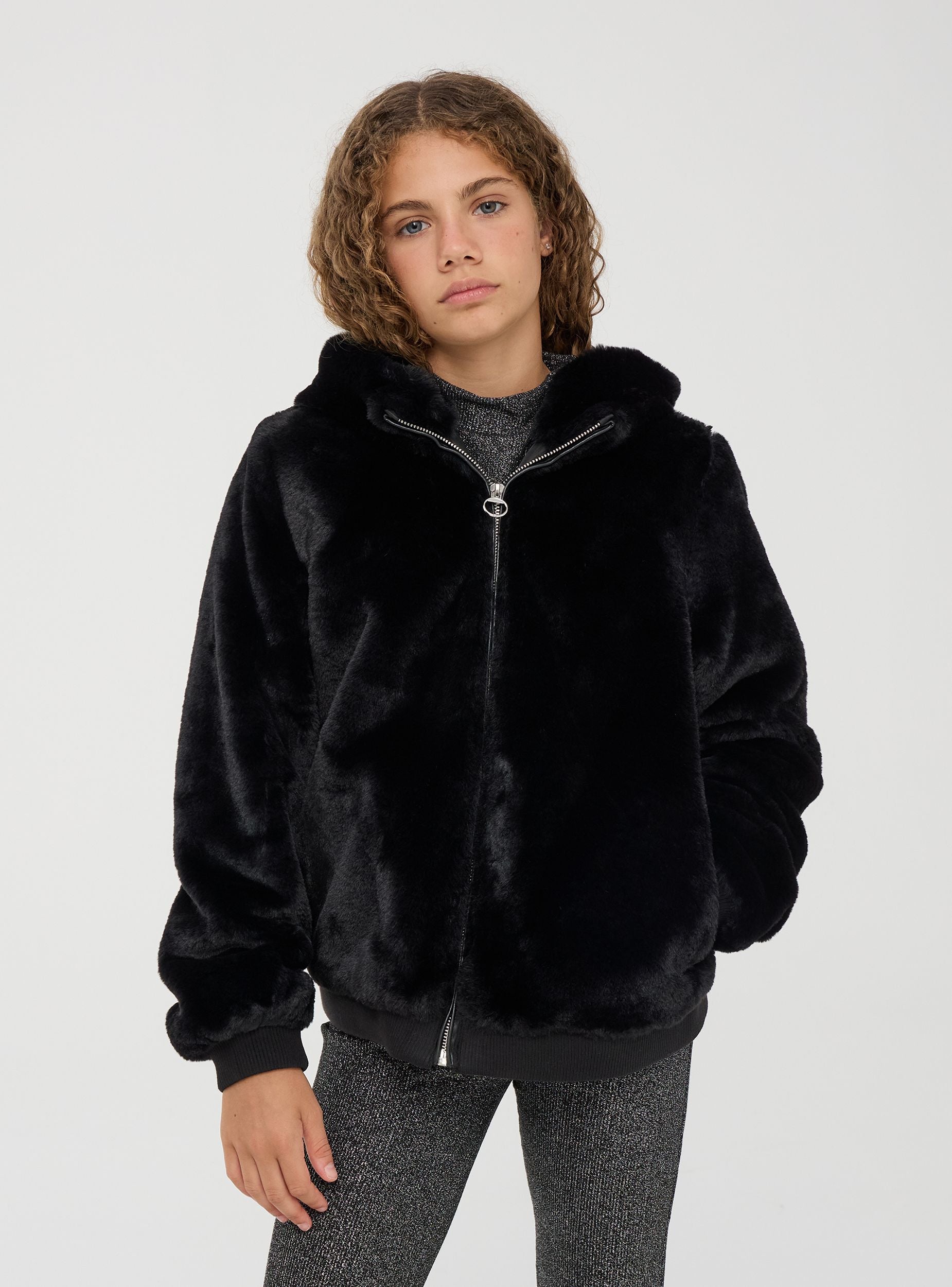Giacca da bambina con cappuccio in pelliccia sintetica a tinta unita con un design morbido e confortevole. Questo capo presenta una zip frontale per una chiusura rapida e pratica, bordini a coste su polsini e orlo per una migliore vestibilità e tenuta del calore. La vestibilità è comoda, ideale per un look casual e rilassato. Perfetta per le giornate fredde, occasioni informali e passeggiate all'aria aperta.