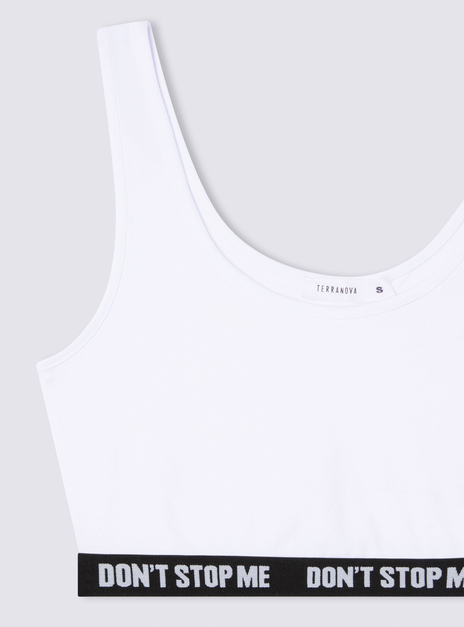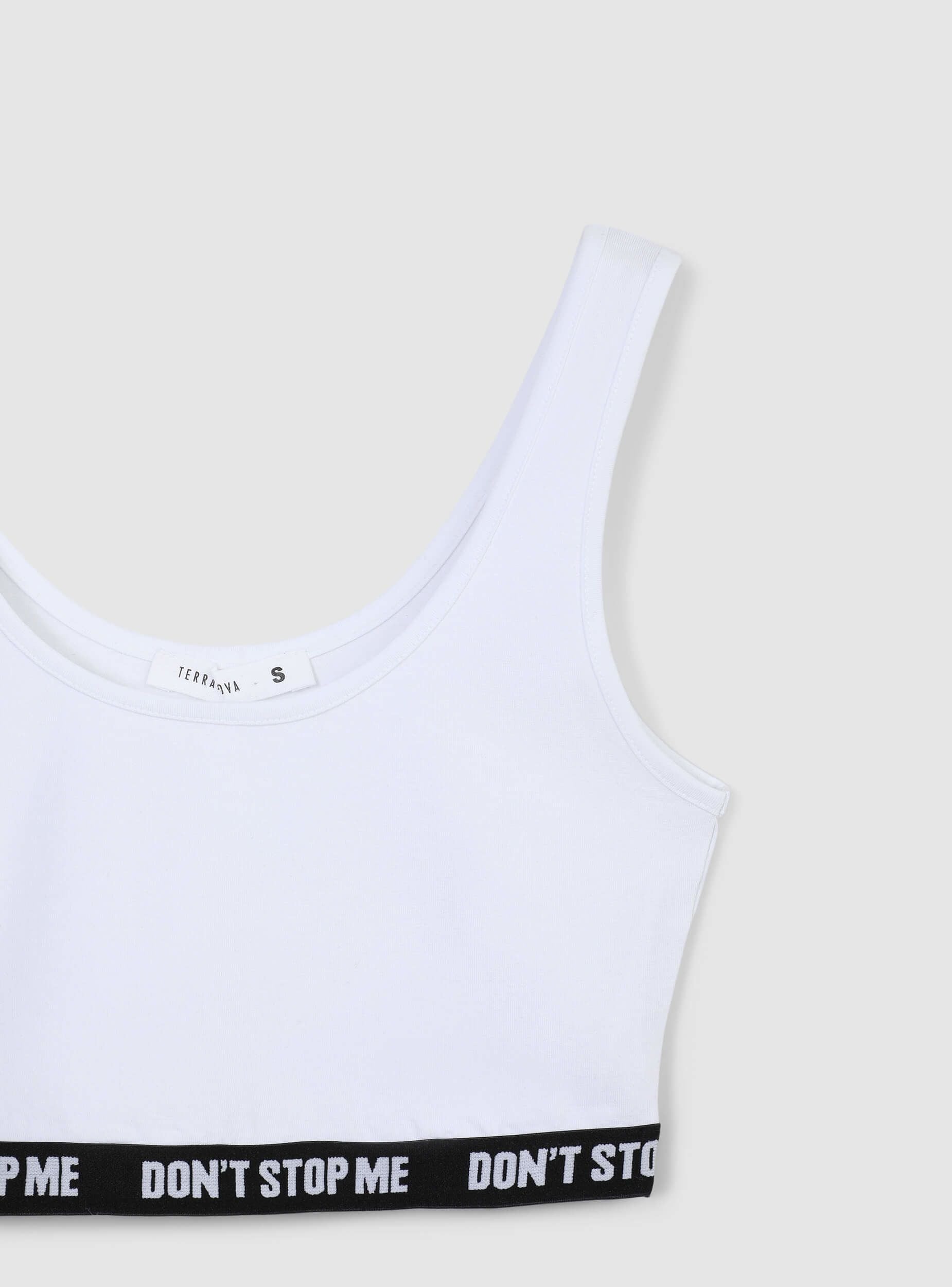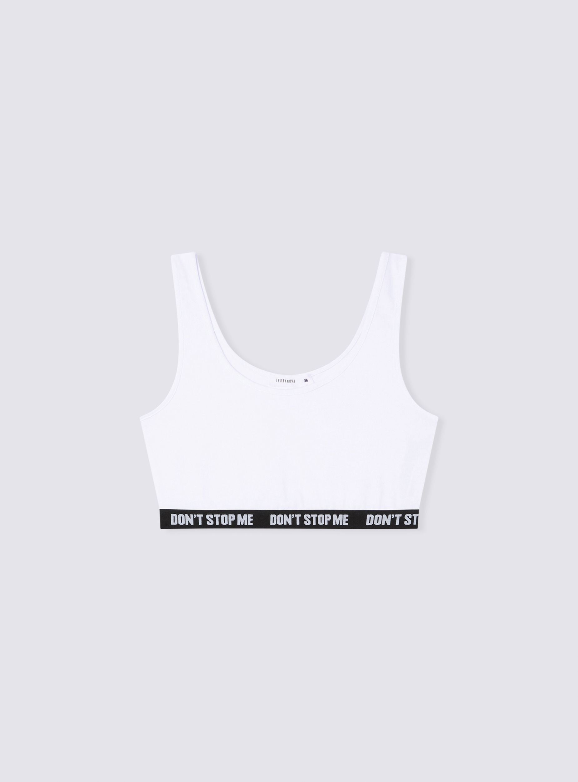 Bra da donna dal design tinta unita con elastico decorato da una scritta accattivante che assicura una vestibilità stabile e confortevole. Perfetto da indossare sotto t-shirt o top oversize, ma anche come capo protagonista per un look sportivo abbinato a leggings o pantaloni a vita alta. Ideale per attività quotidiane o allenamenti leggeri, unendo praticità e stile moderno.