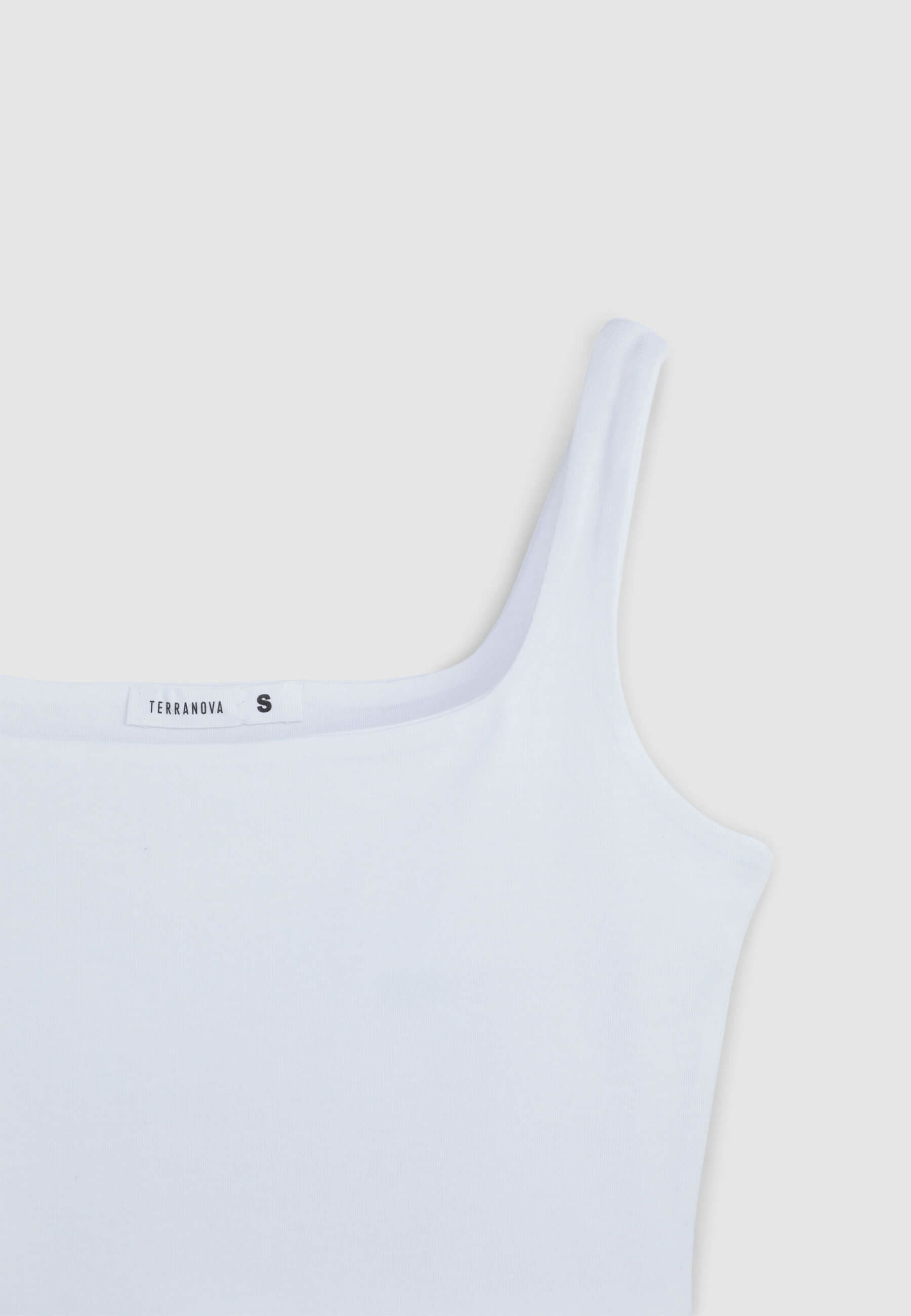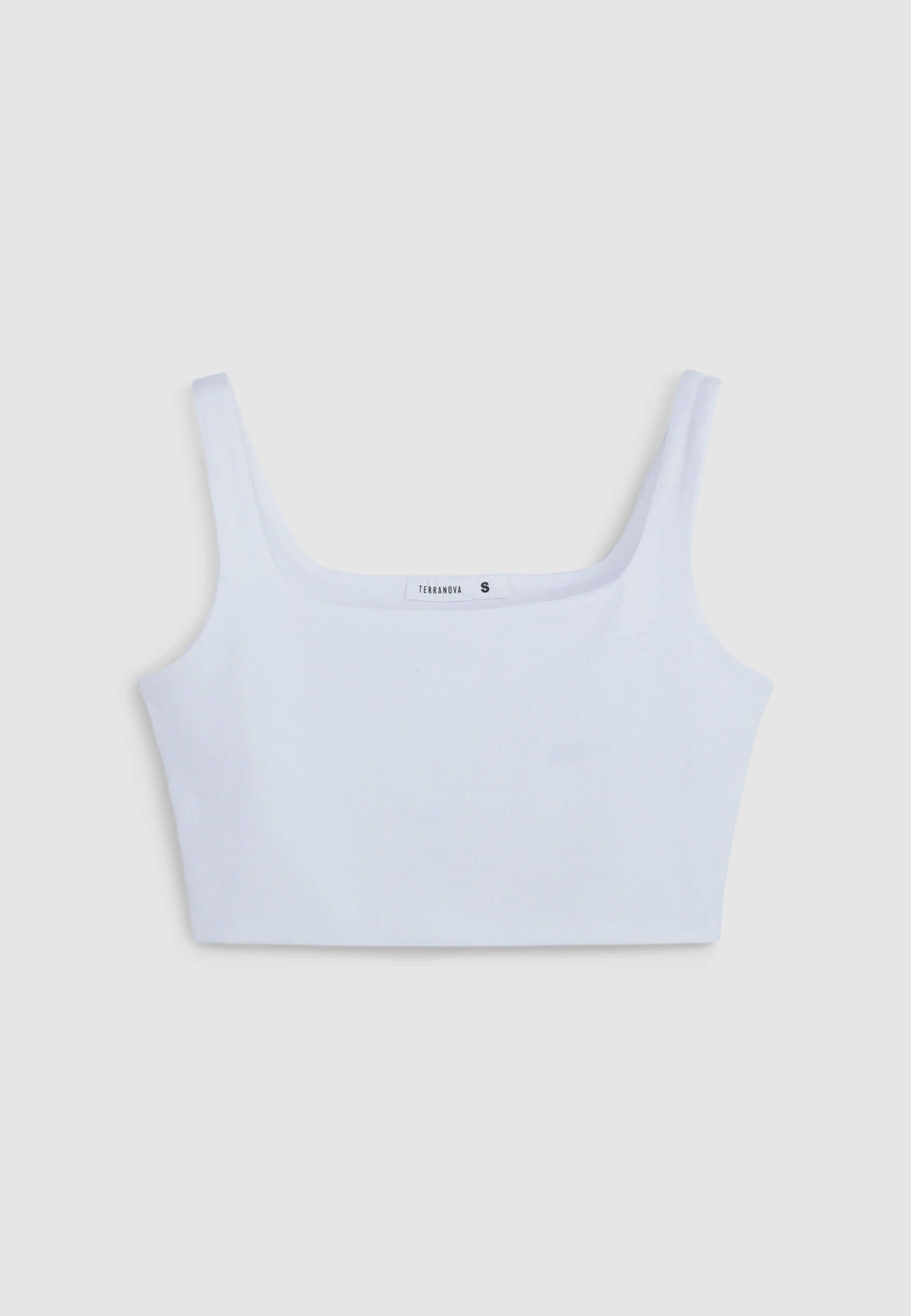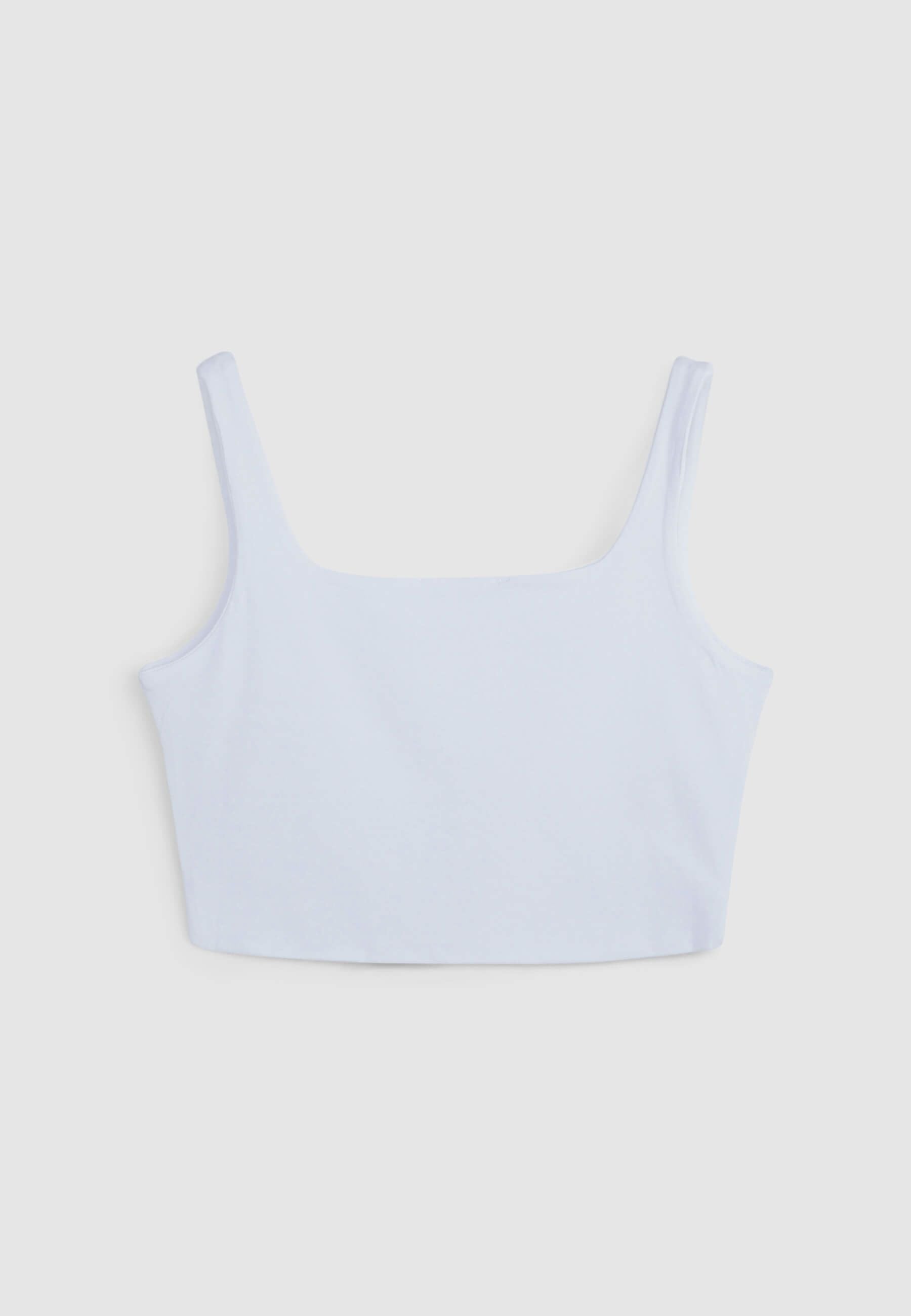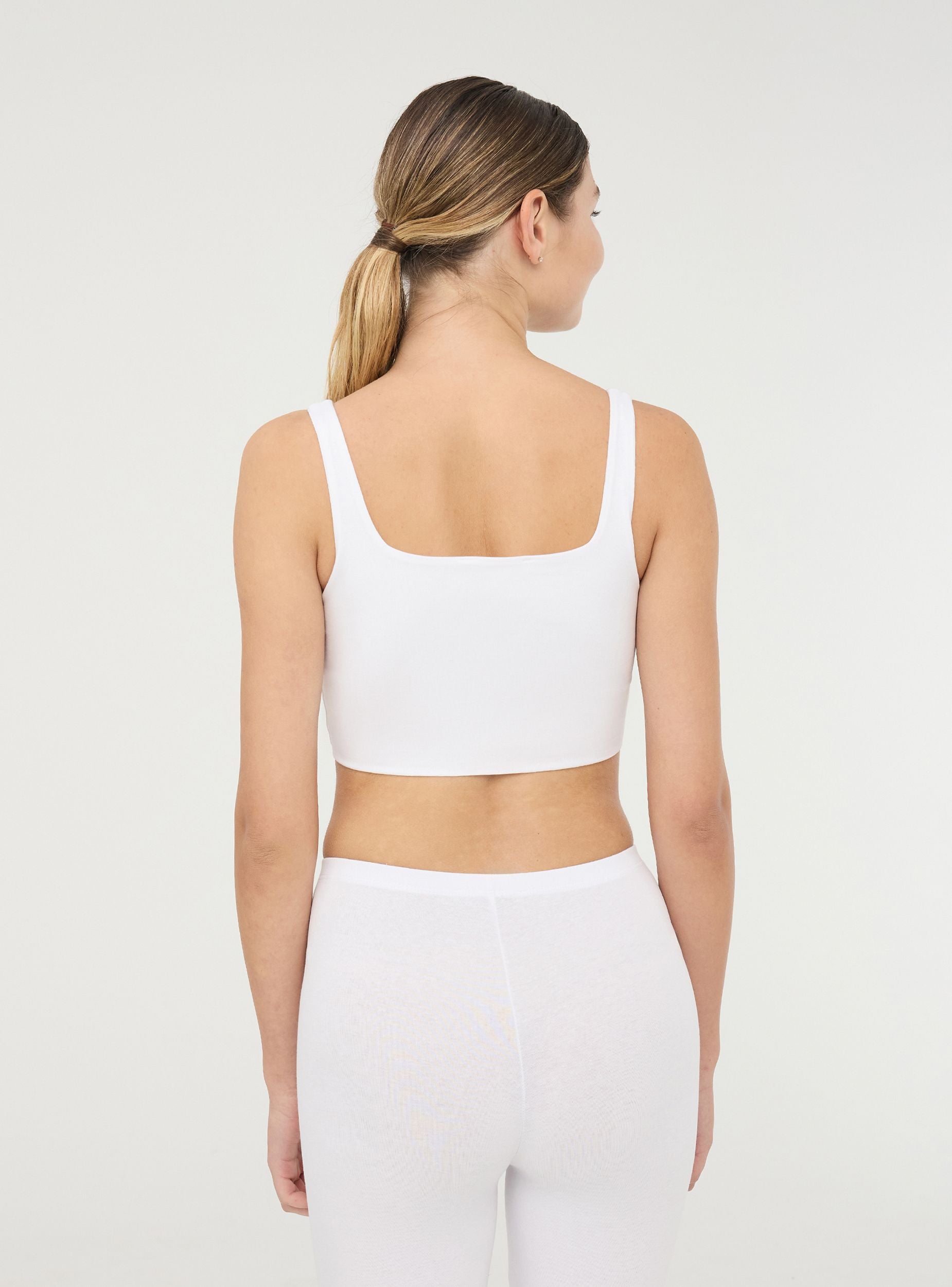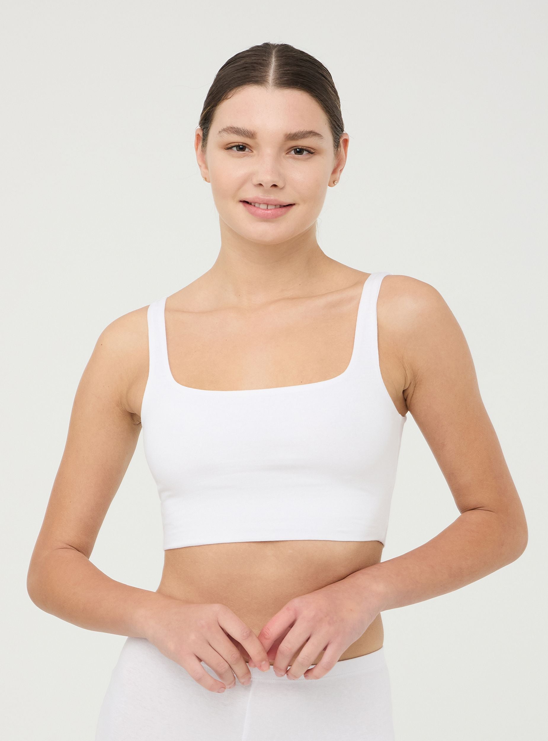 Bra da donna con design a tinta unita, caratterizzato da uno scollo quadrato che offre un look minimal e moderno. Il tessuto elasticizzato assicura una vestibilità comoda e aderente, con spalline larghe che forniscono supporto e stabilità. Il taglio è pensato per abbracciare la figura con delicatezza, garantendo comfort per tutto il giorno.