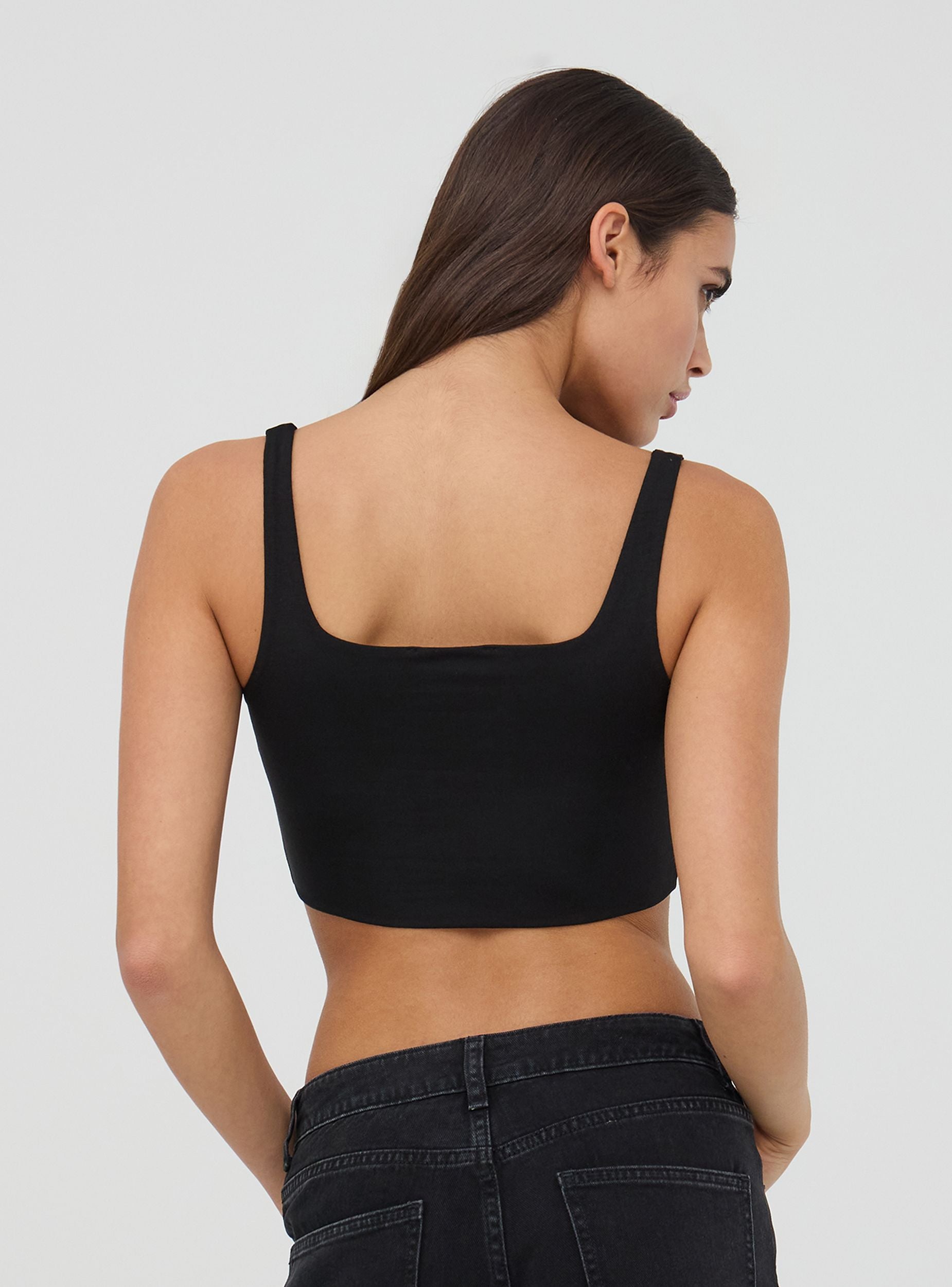 Bra da donna con design a tinta unita, caratterizzato da uno scollo quadrato che offre un look minimal e moderno. Il tessuto elasticizzato assicura una vestibilità comoda e aderente, con spalline larghe che forniscono supporto e stabilità. Il taglio è pensato per abbracciare la figura con delicatezza, garantendo comfort per tutto il giorno.
