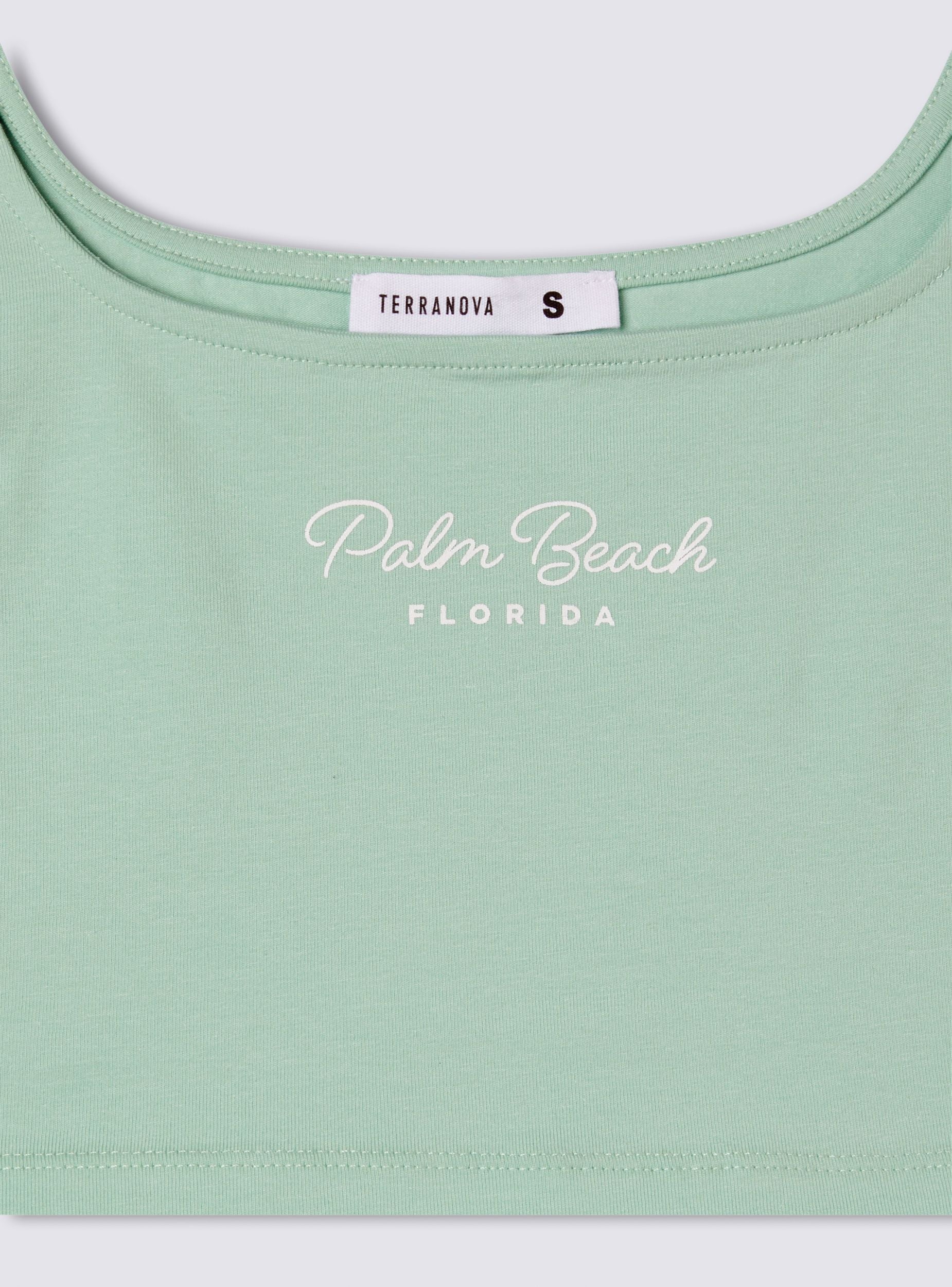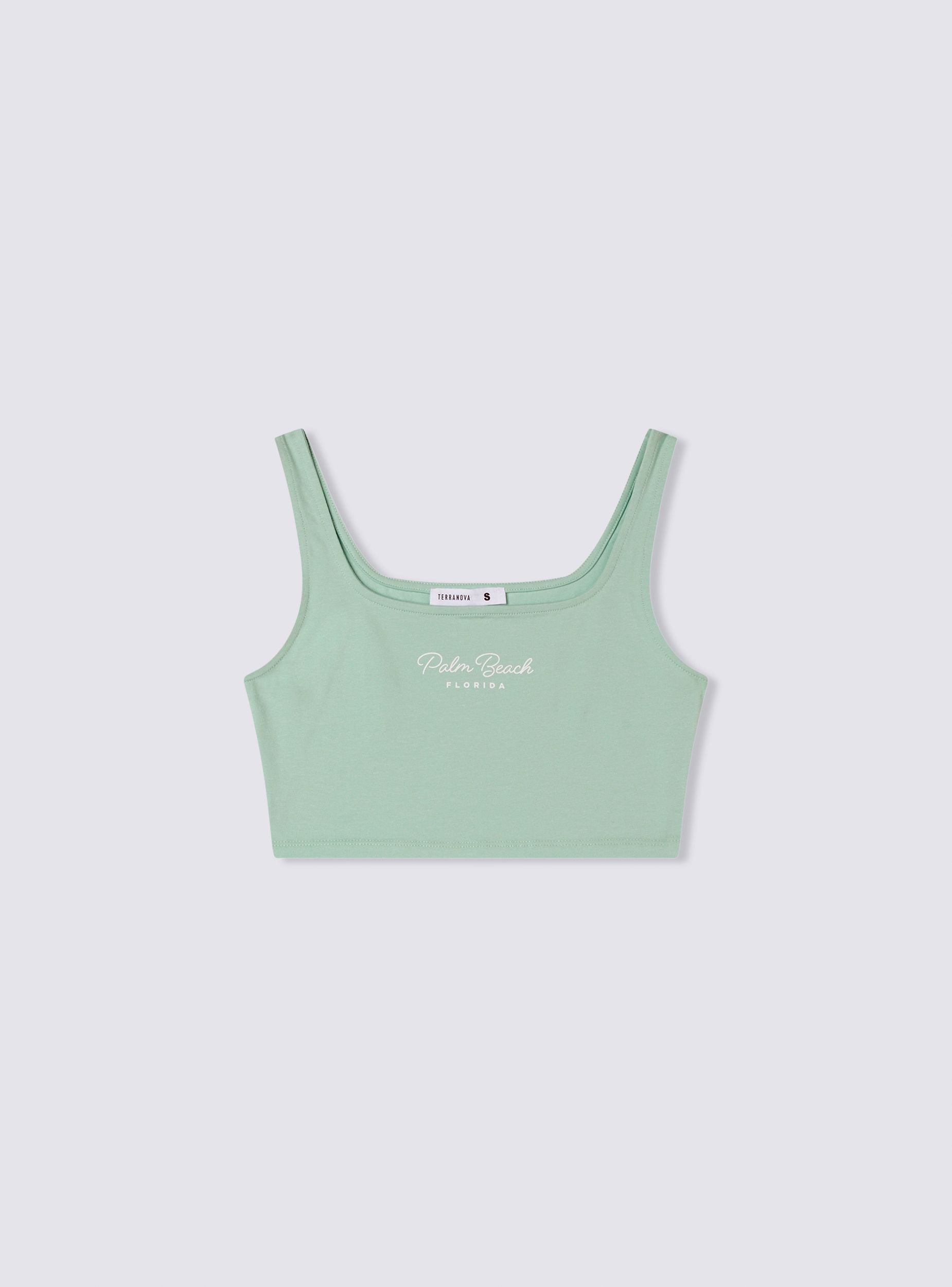 Bra da donna con un design essenziale. Caratterizzato da un comodo scollo ampio e spalline medie, garantisce un buon supporto senza costrizioni. Il dettaglio distintivo è la scritta decorativa posizionata sul davanti, che aggiunge un tocco di stile casual.