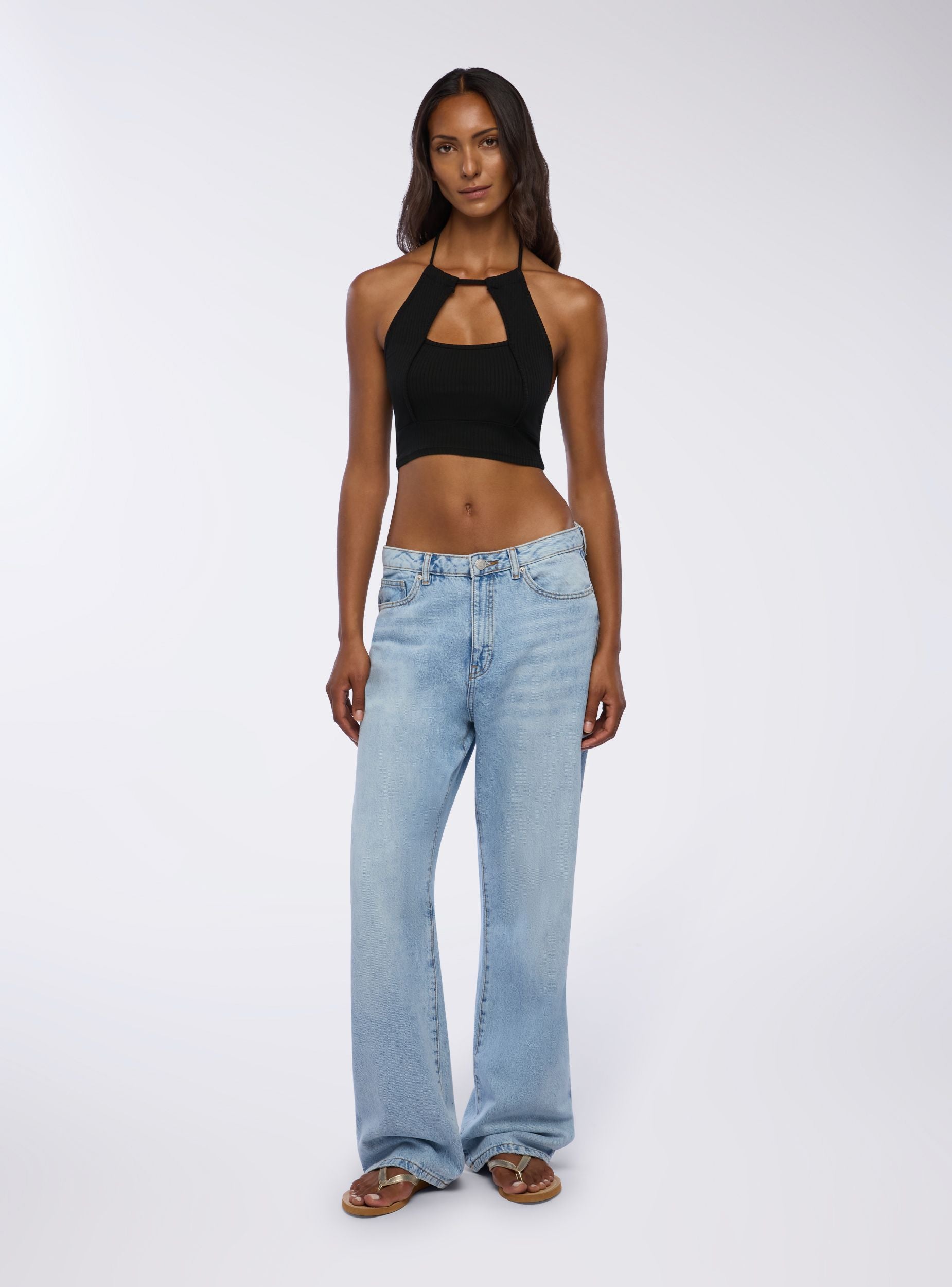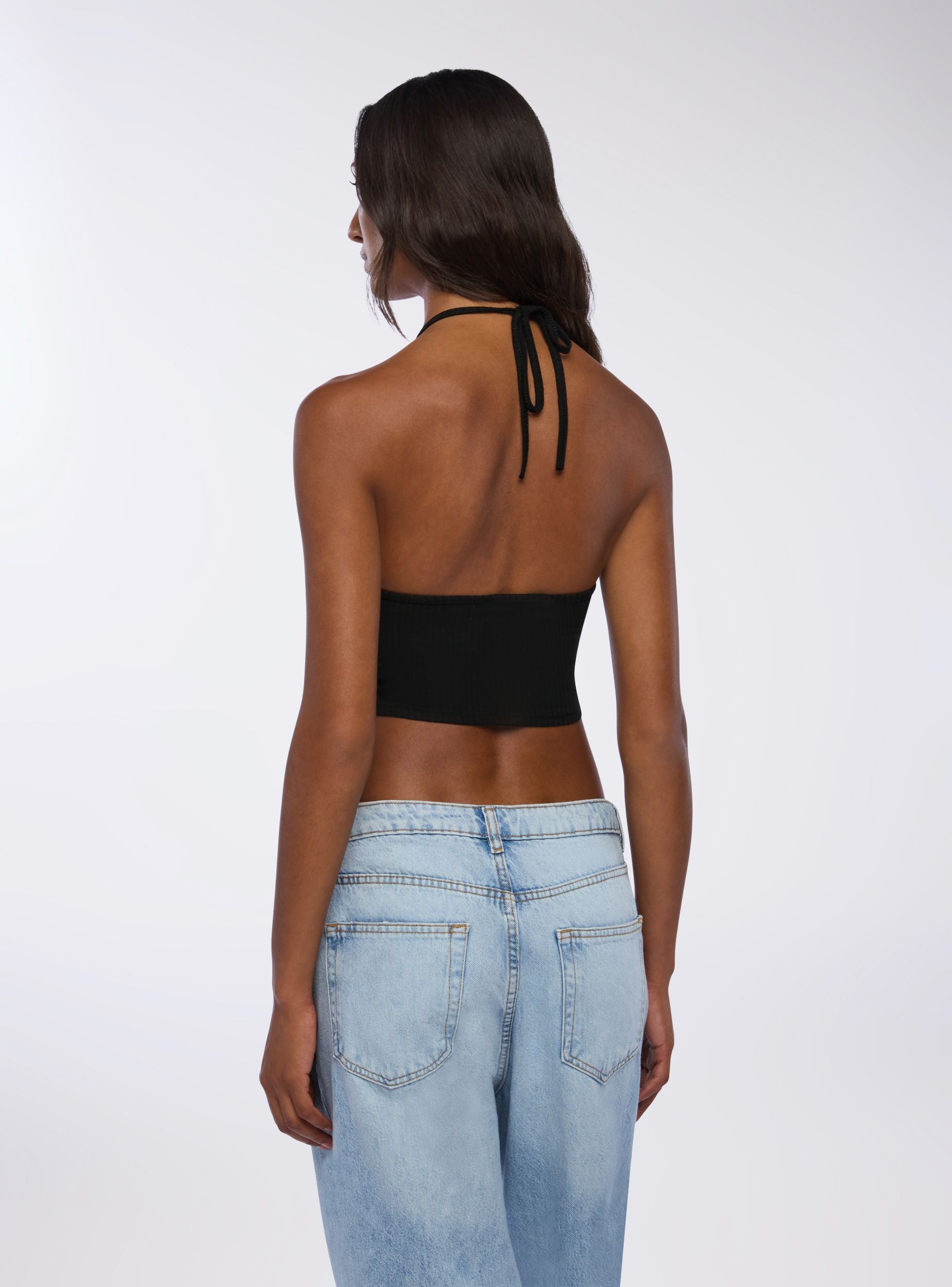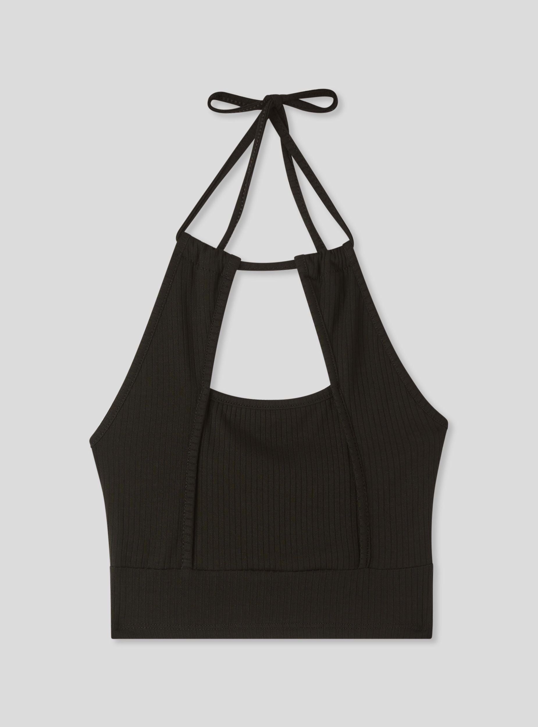 Top da donna con design halterneck e oblò frontale. Ideale per un look casual e trendy, si abbina perfettamente a jeans o pantaloni a vita alta. La vestibilità aderente e il dettaglio del nodo sul collo aggiungono un tocco di stile unico. Perfetto per giornate estive o serate informali, questo top offre comfort e versatilità per diverse occasioni.