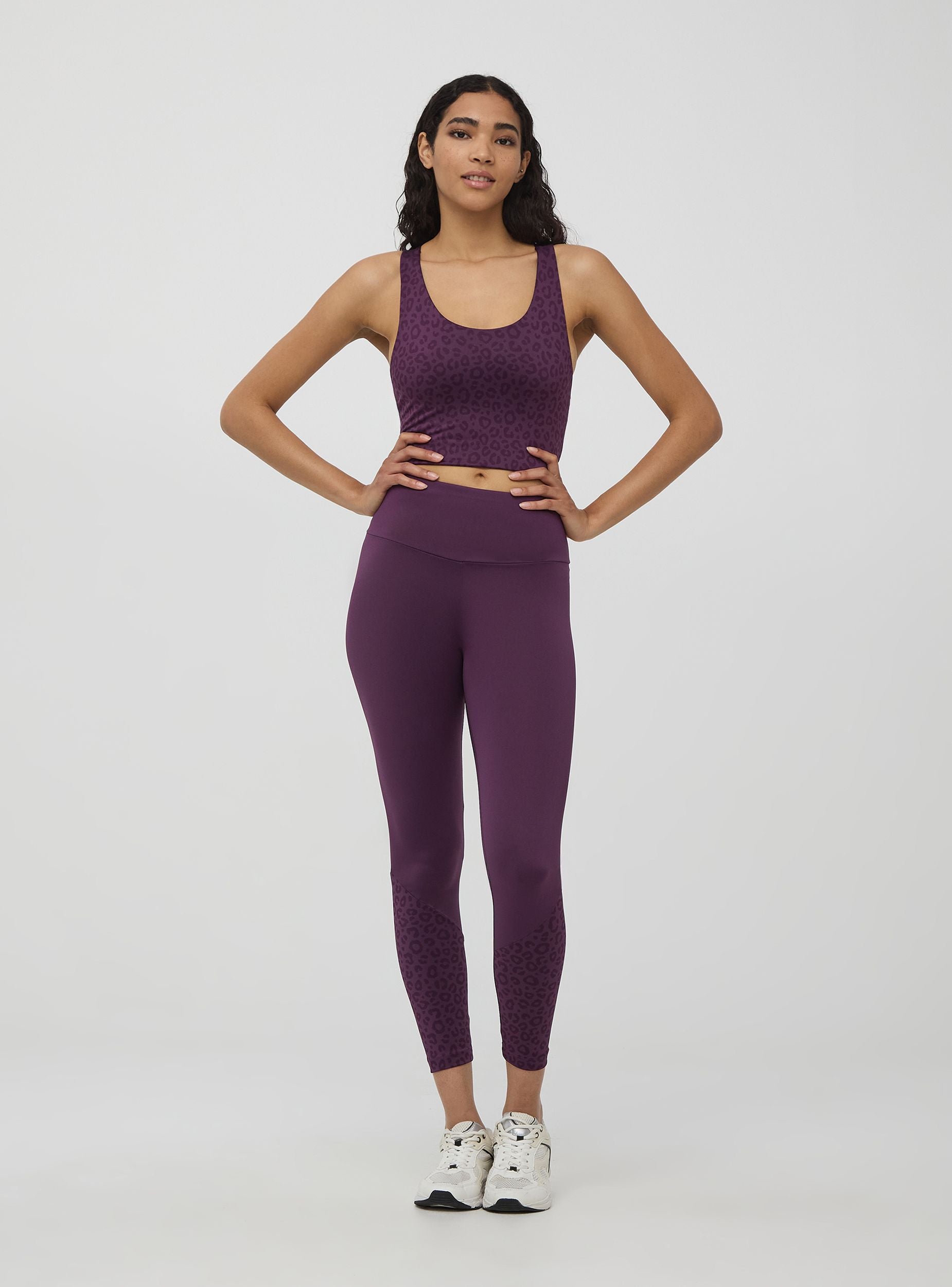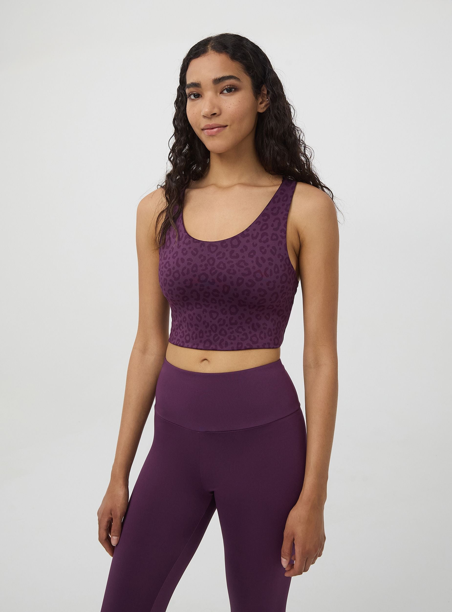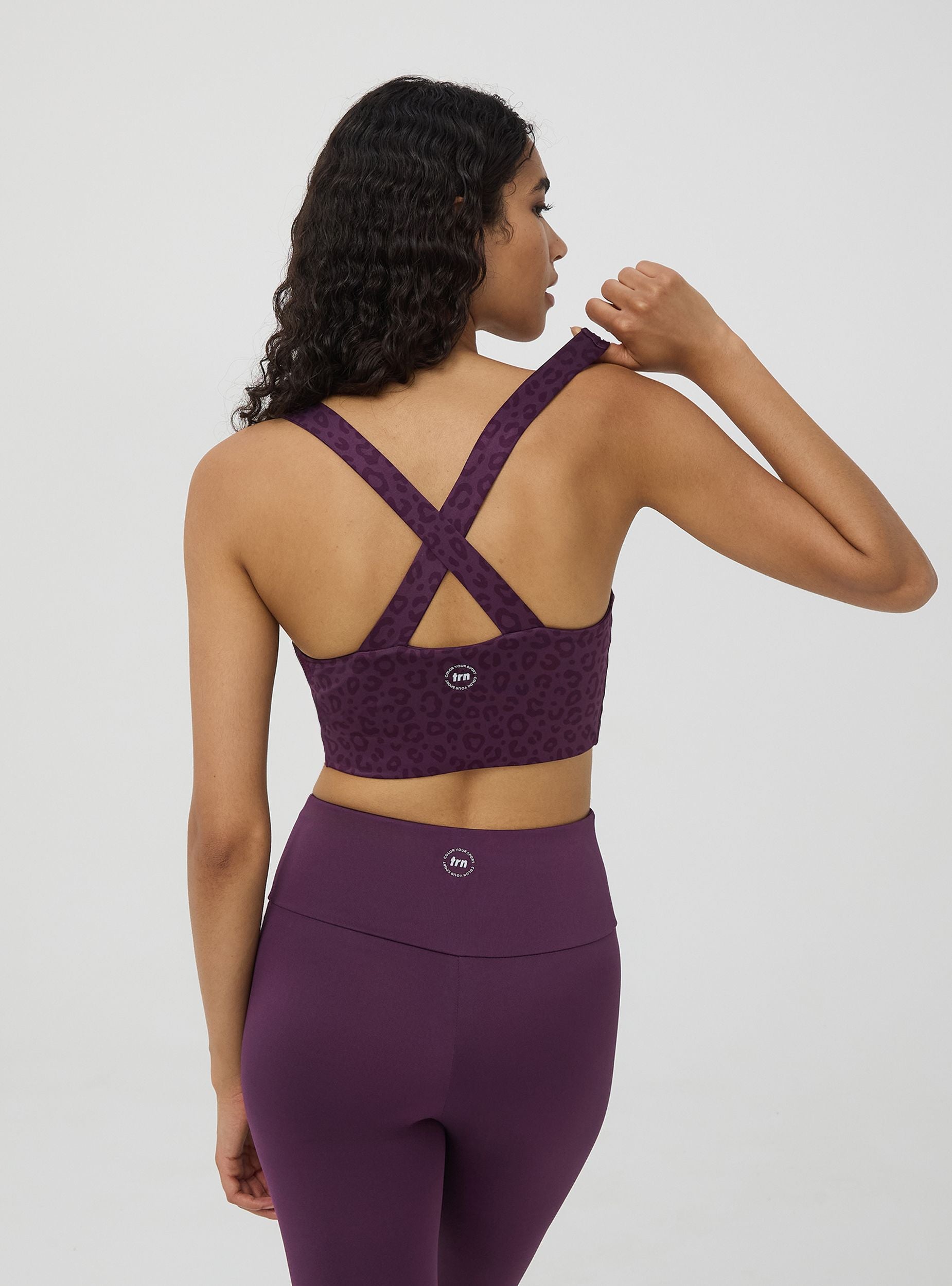 Reggiseno sportivo da donna con stampa spalmata effetto animalier luccicante con spalline incrociate sulla schiena. Realizzato in tessuto elasticizzato super confortevole che permette la massima libertà di movimento. Linea Active. Vestibilità crop. Ideale per allenamenti e look sportivi.