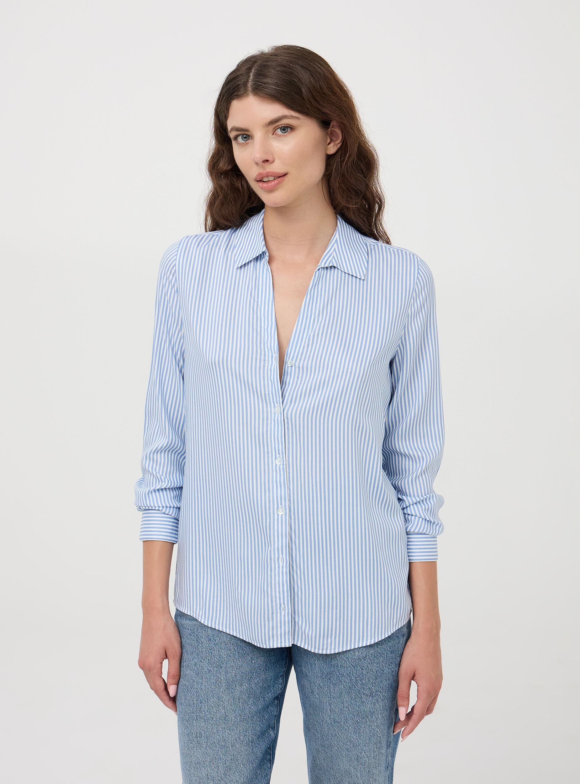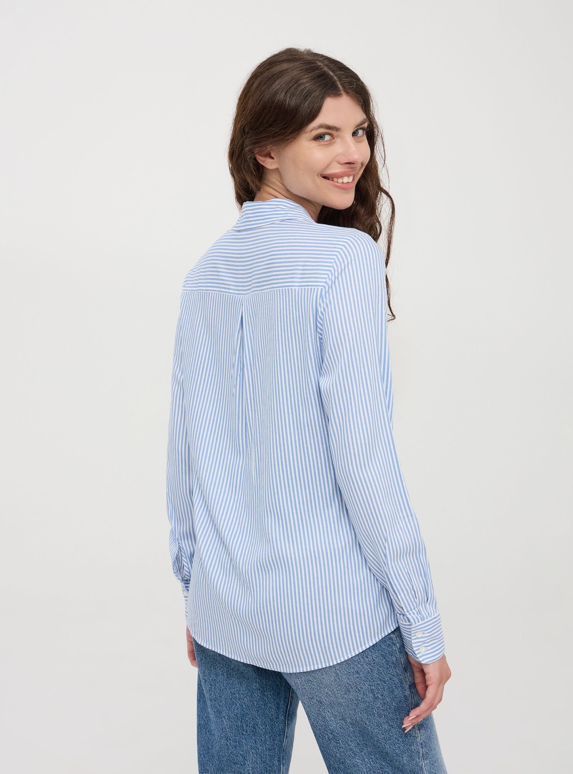 Camicia in viscosa da donna a righe, con colletto classico e chiusura frontale con bottoni. Le maniche lunghe terminano con polsini abbottonati, mentre il retro presenta un carré e una piega centrale per una vestibilità comoda. Il taglio è leggermente arrotondato sul fondo, conferendo un tocco elegante e versatile al capo.