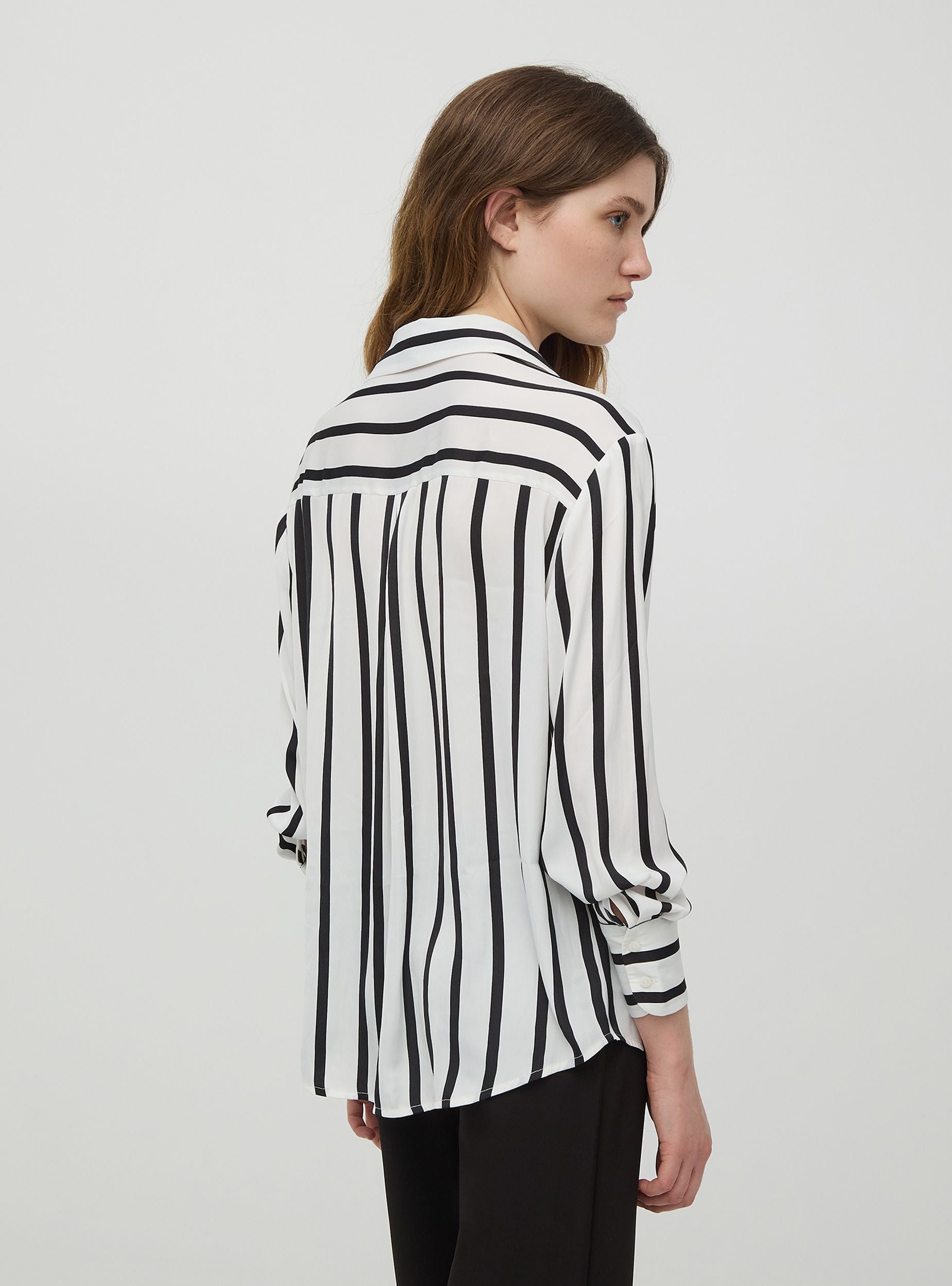 Camicia da donna in tessuto di effetto raso lucido a righe. Modello con maniche lunghe con doppio bottone sul polsino e chiusura frontale con bottoni. Un must-have dallo stile casual chic da avere nell'armadio. Vestibilità morbida.Dettagli