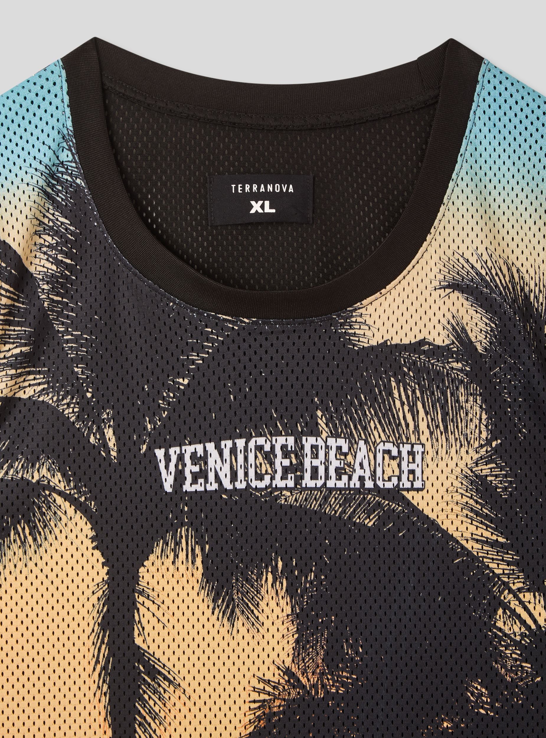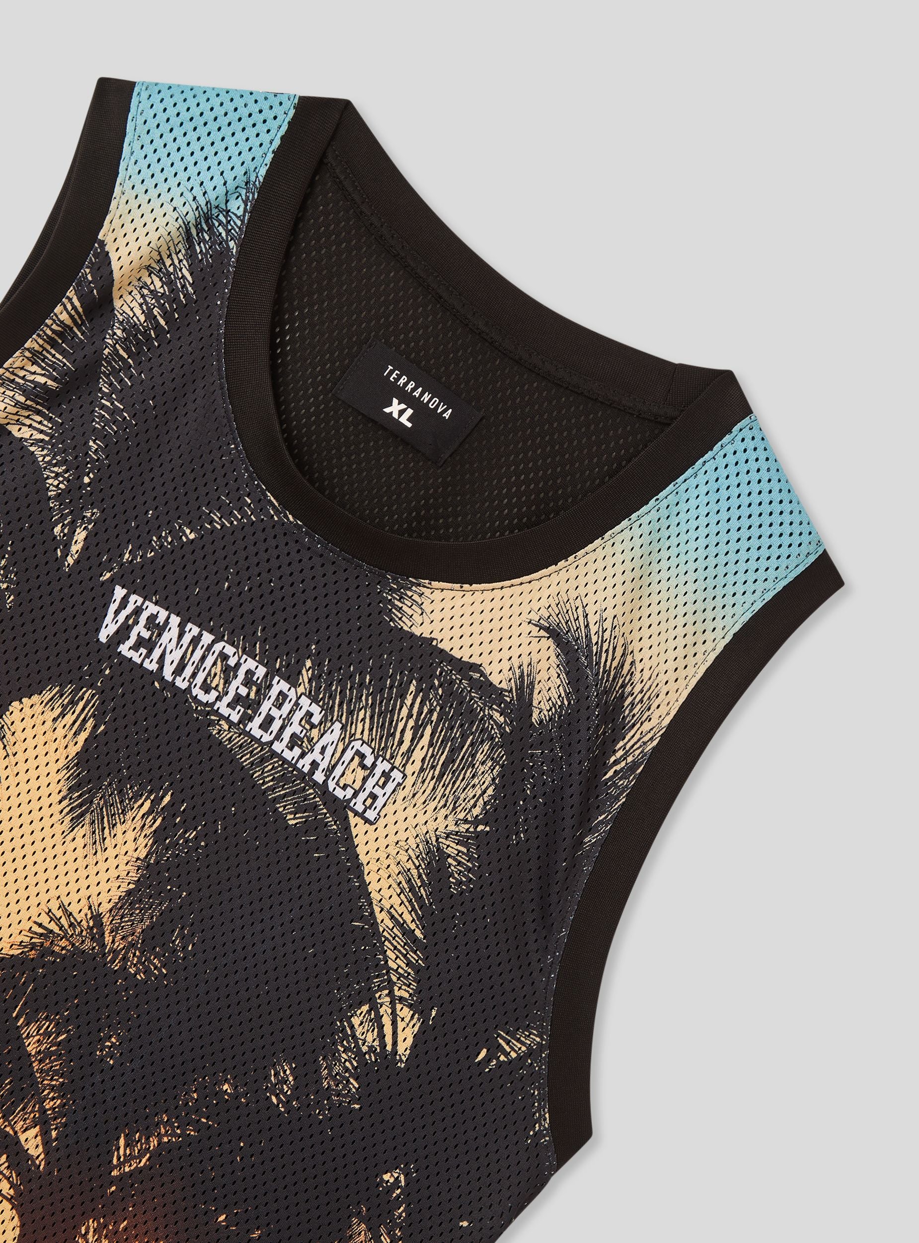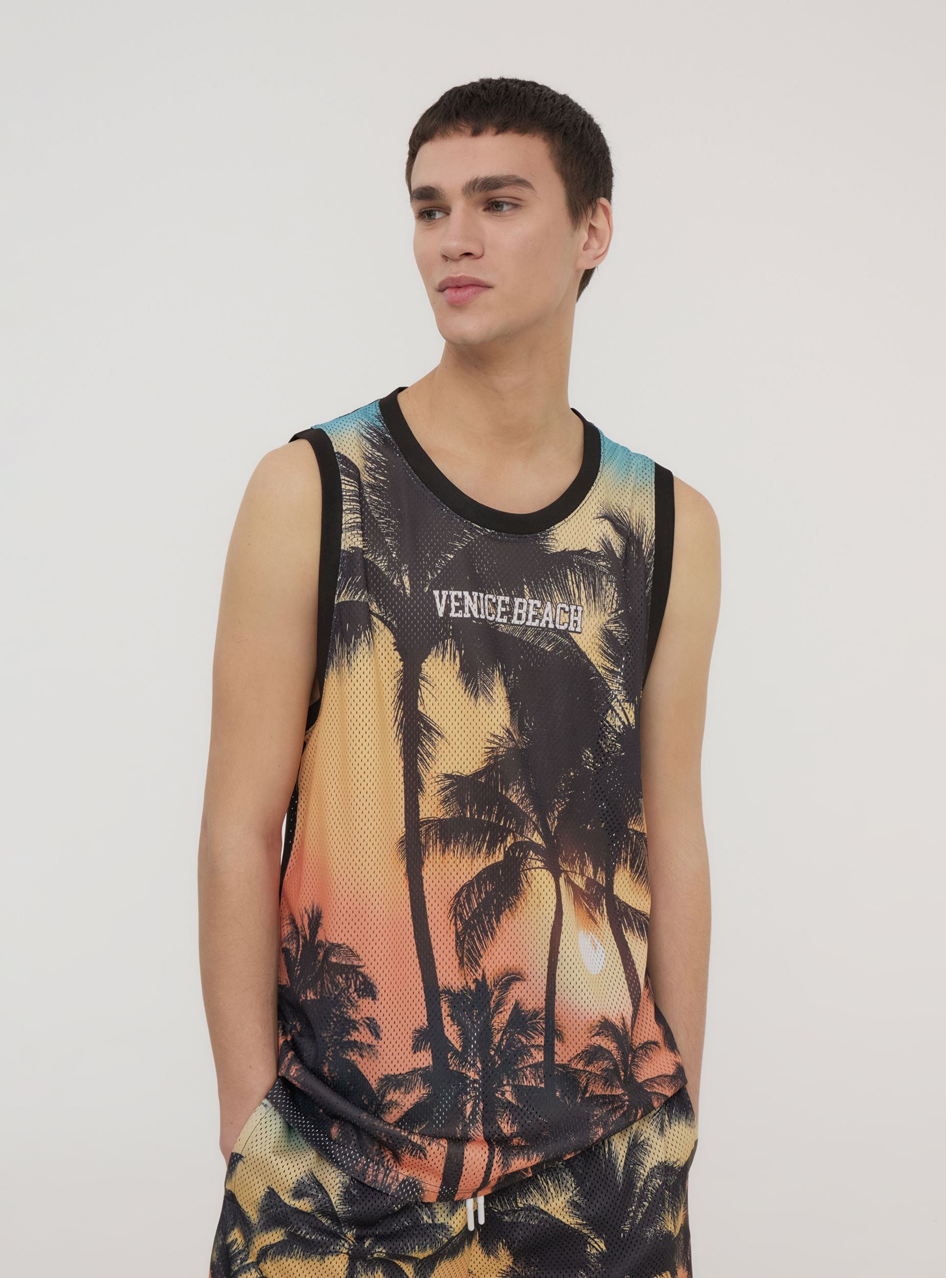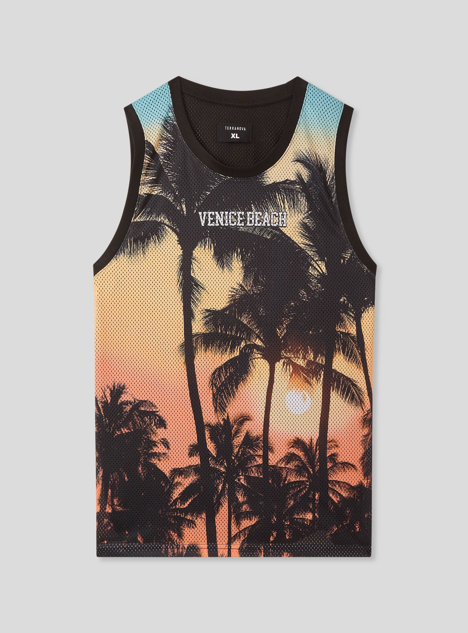Canotta da uomo con fantasia paesaggio che richiama le atmosfere estive, perfetta per un look rilassato e dinamico. Il design con inserti in rete assicura traspirabilità e comfort, rendendola ideale per giornate calde, attività all’aperto o sessioni di allenamento. Perfetta da abbinare a bermuda o pantaloni sportivi, dona uno stile fresco e moderno, ideale per il tempo libero e le vacanze.