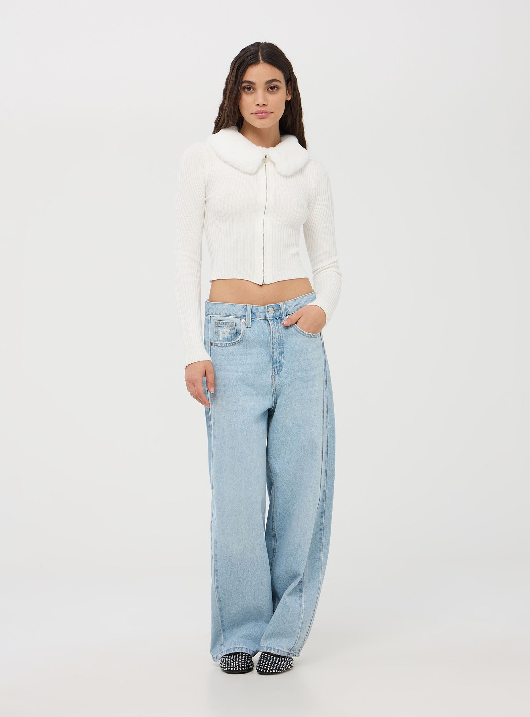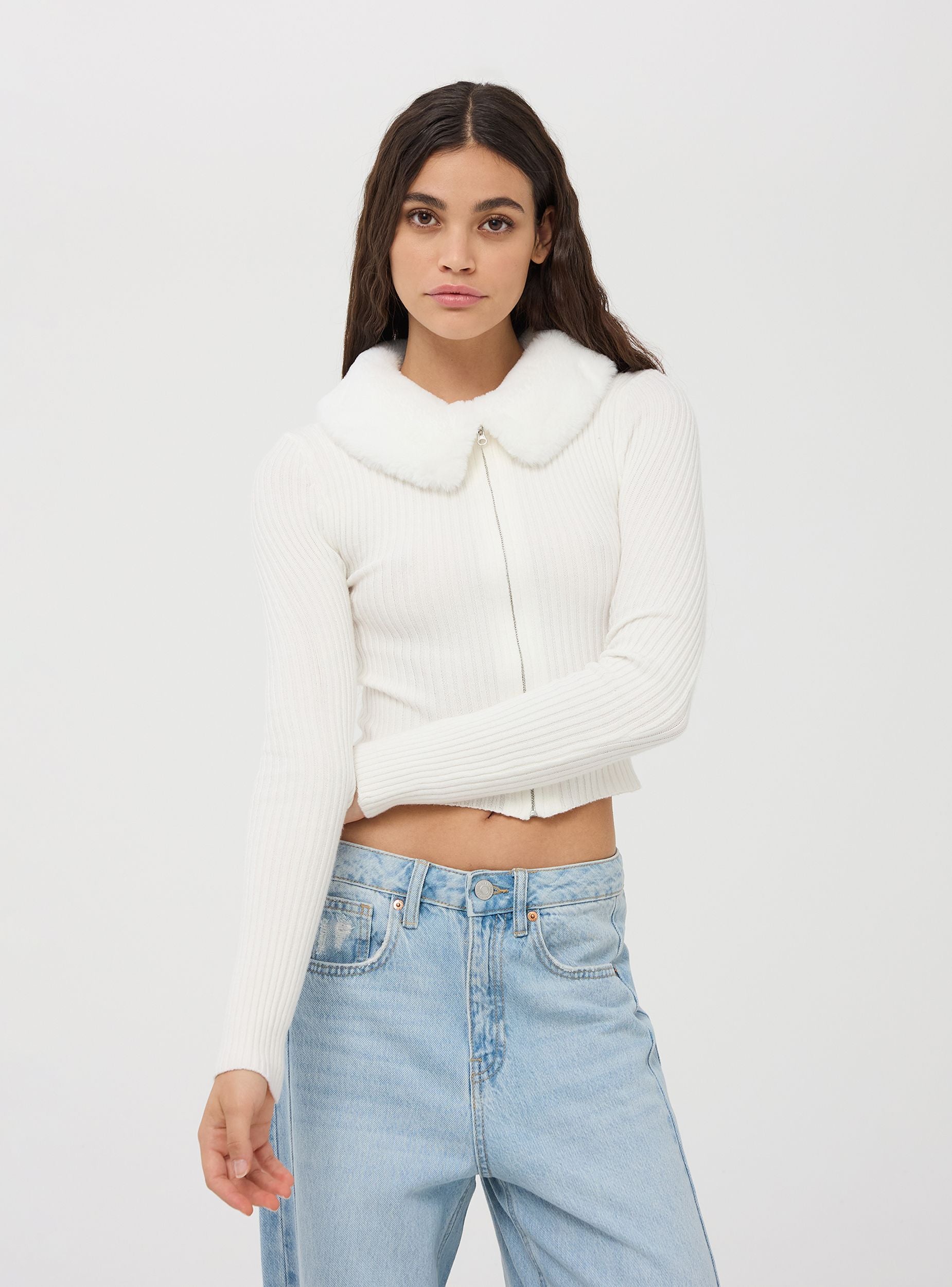 Maglia da donna, modello cardigan, con collo in pelliccia sintetica staccabile. Realizzata in tessuto a costine in tinta unita, dotata di chiusura con zip. Vestibilità crop.