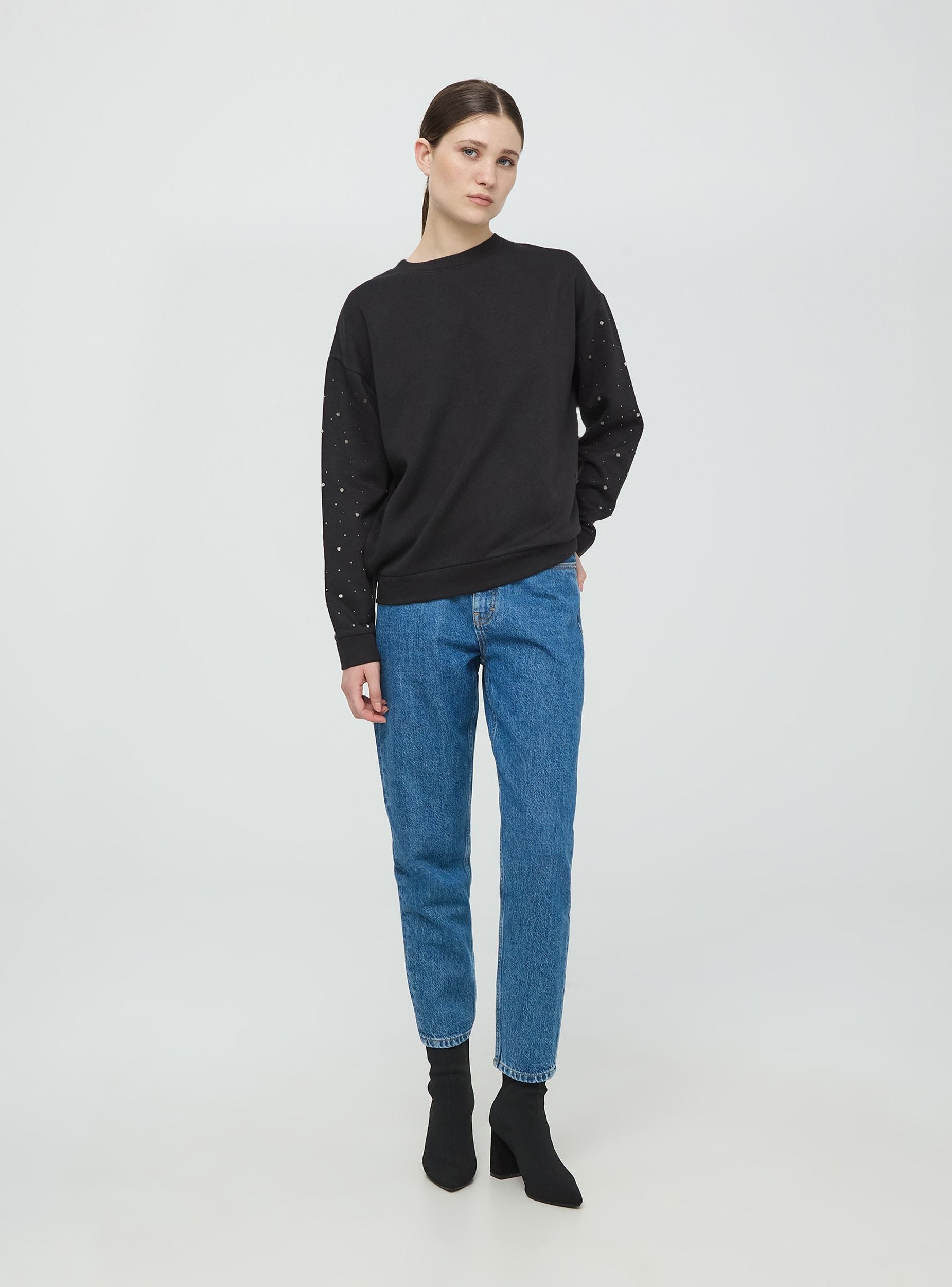 Felpa da donna, modello chiuso senza cappuccio, in tessuto pesante a tinta unita con applicazioni di strass nelle maniche. Perfetta per un outfit comodo ma chic. Vestibilità ampia.
