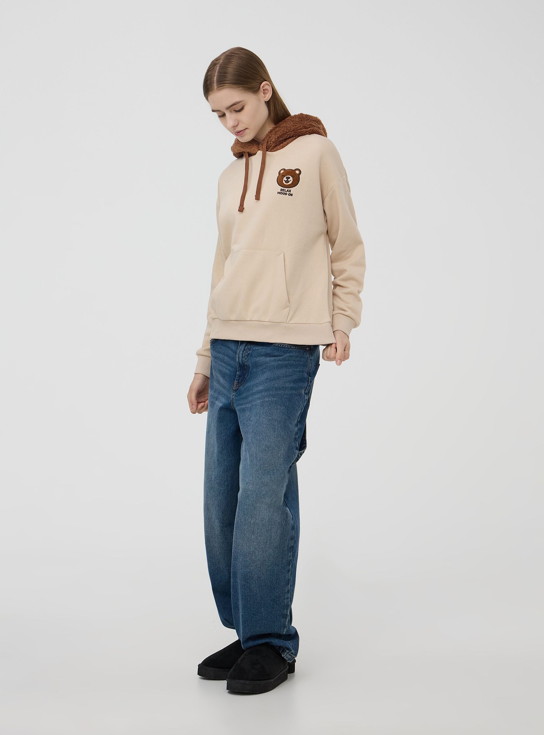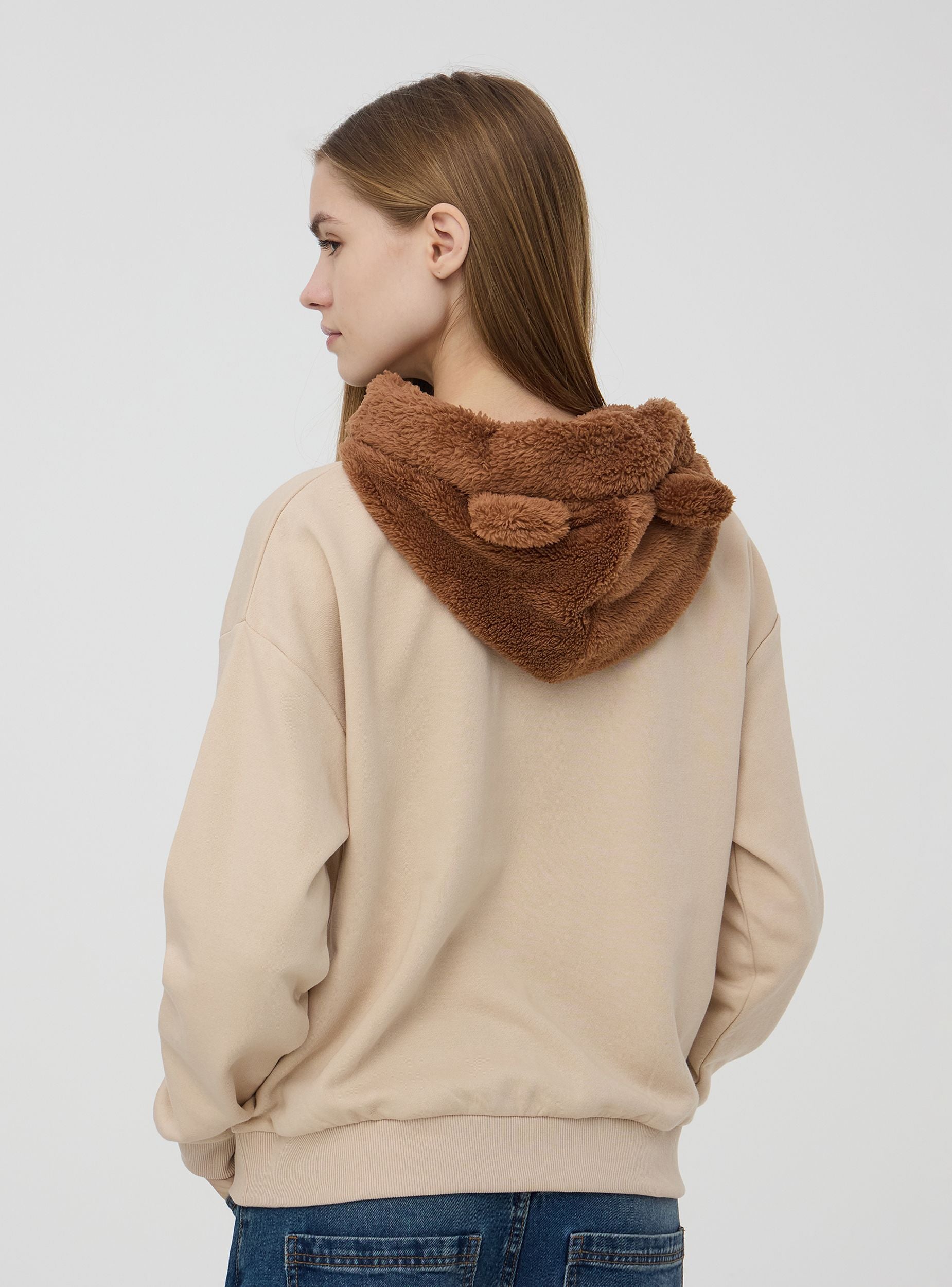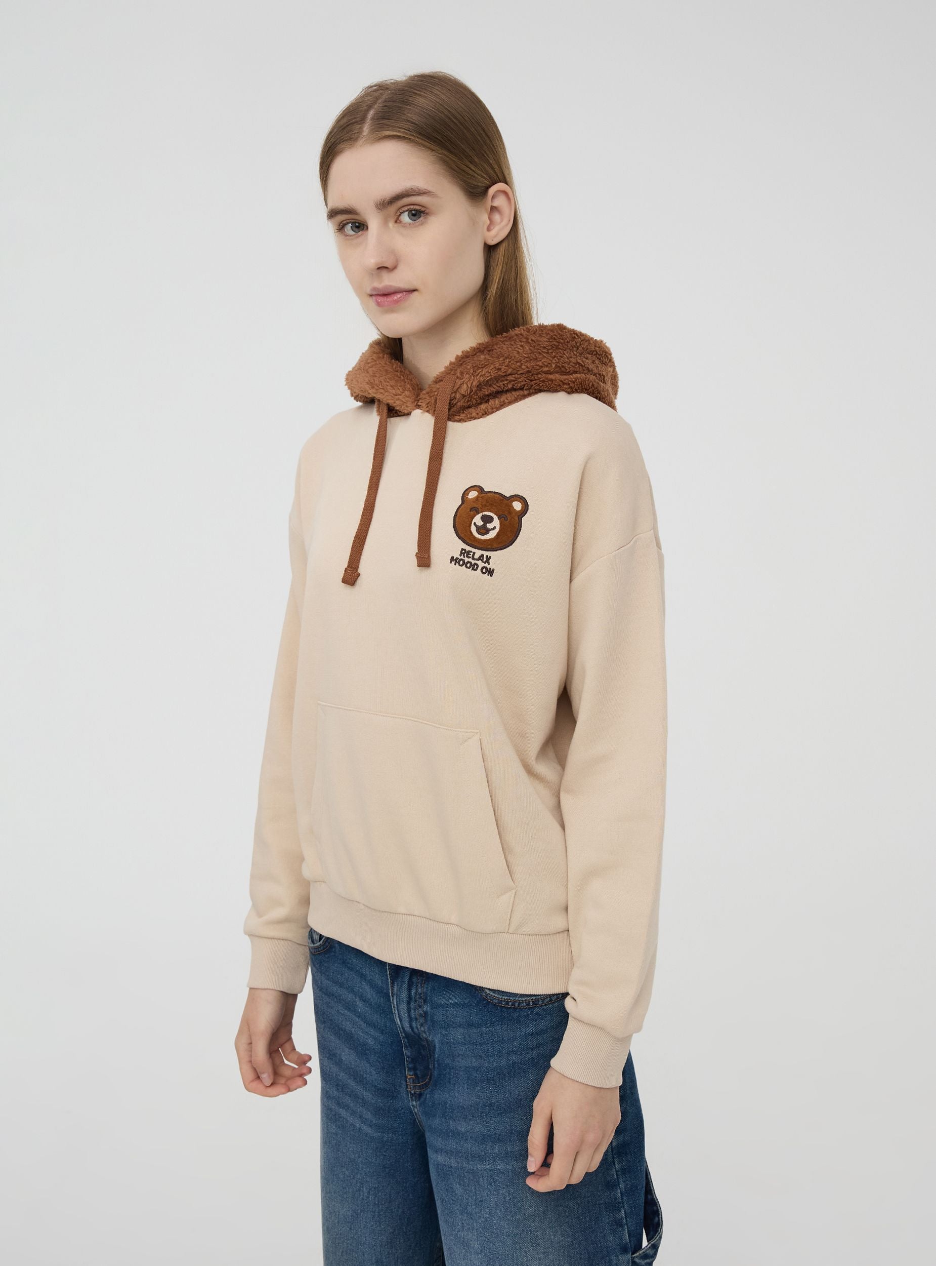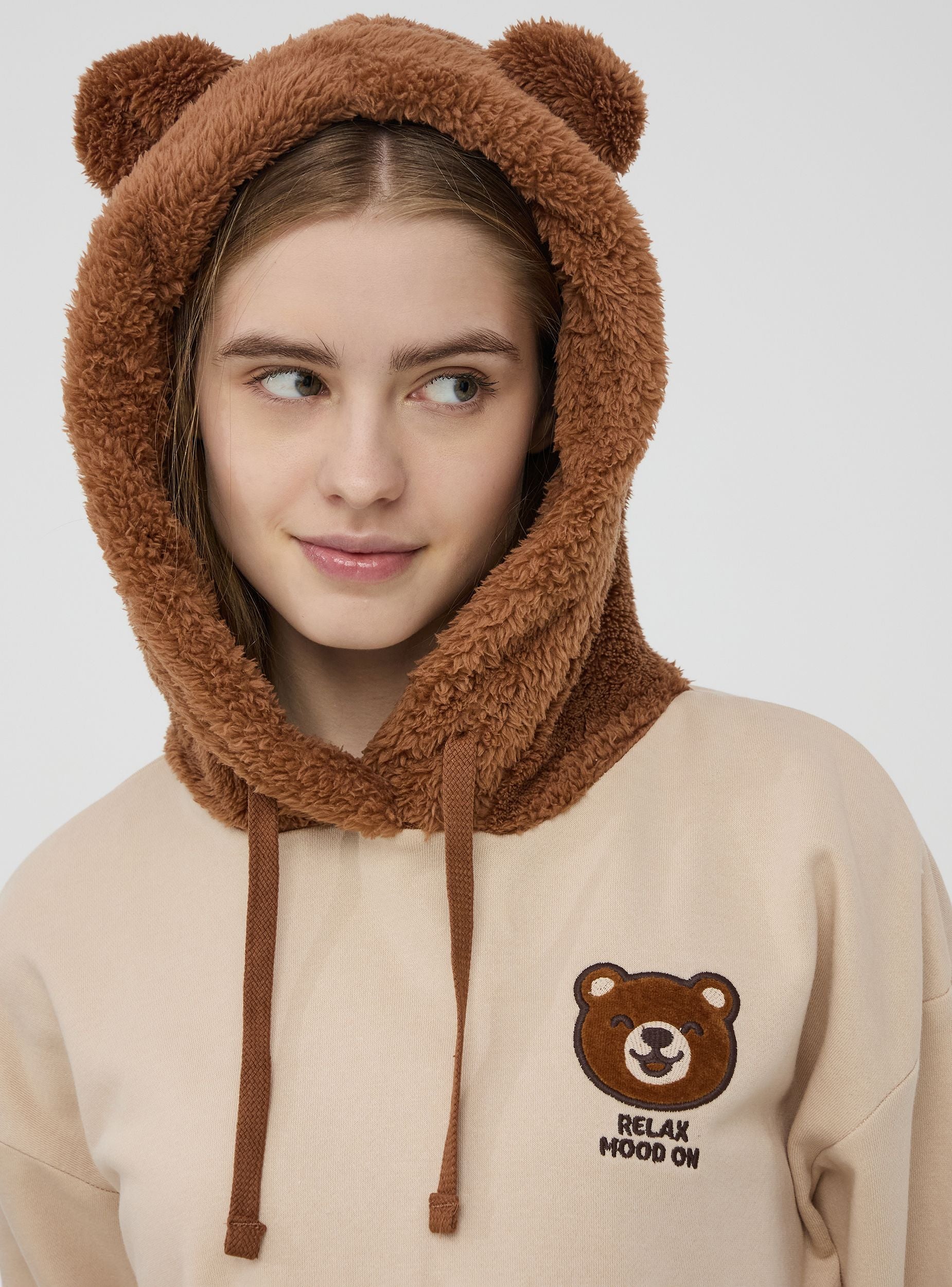 Felpa da donna in tessuto pesante con patch ricamato e cappuccio effetto pelo in caldo sherpa con orecchie, dotata di coulisse e tasca a marsupio. Vestibilità regular.Dettagli