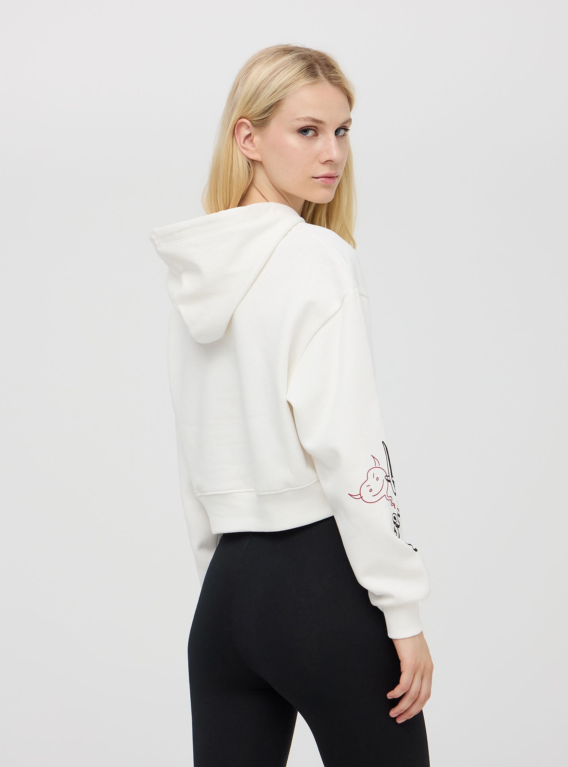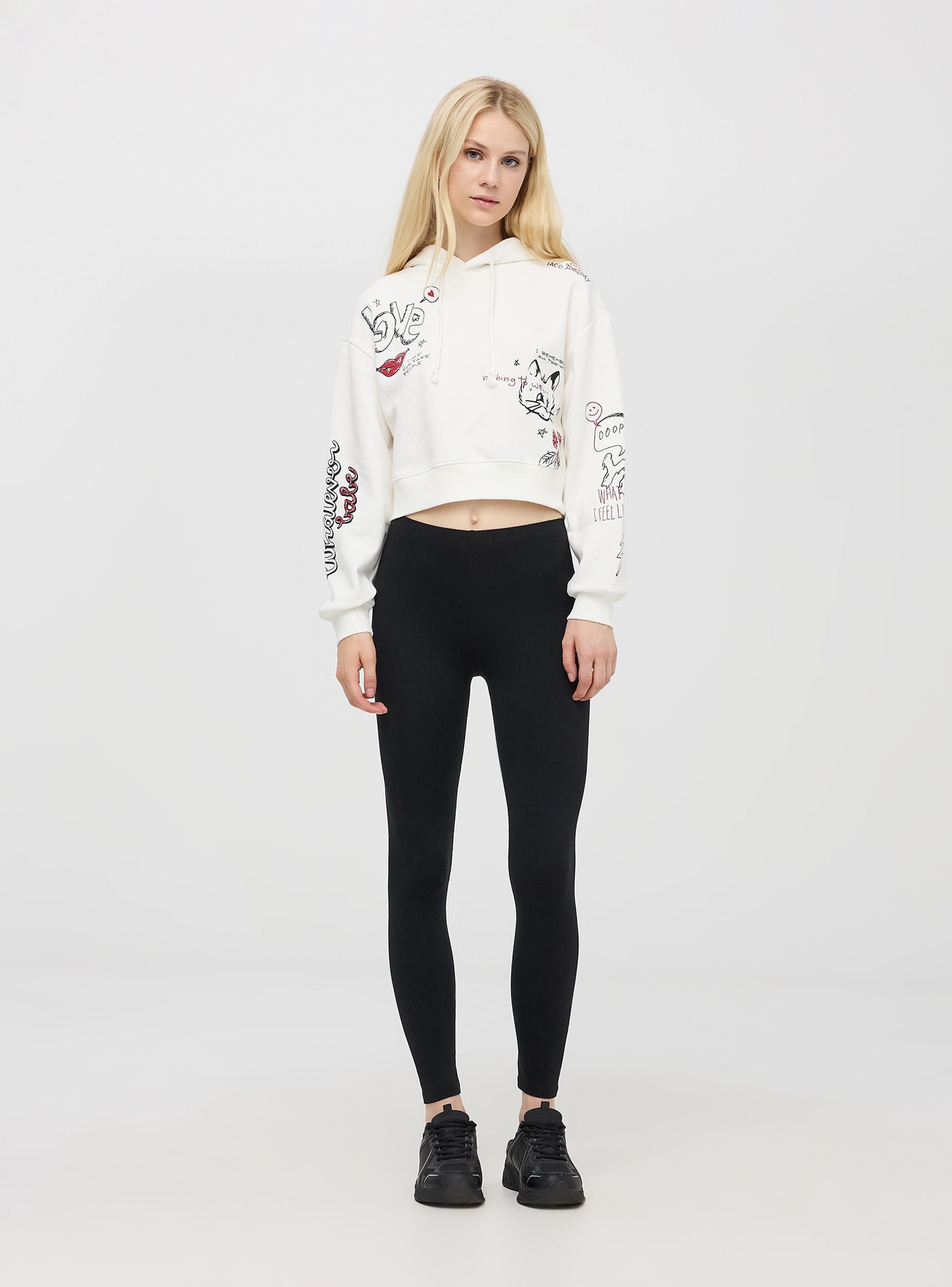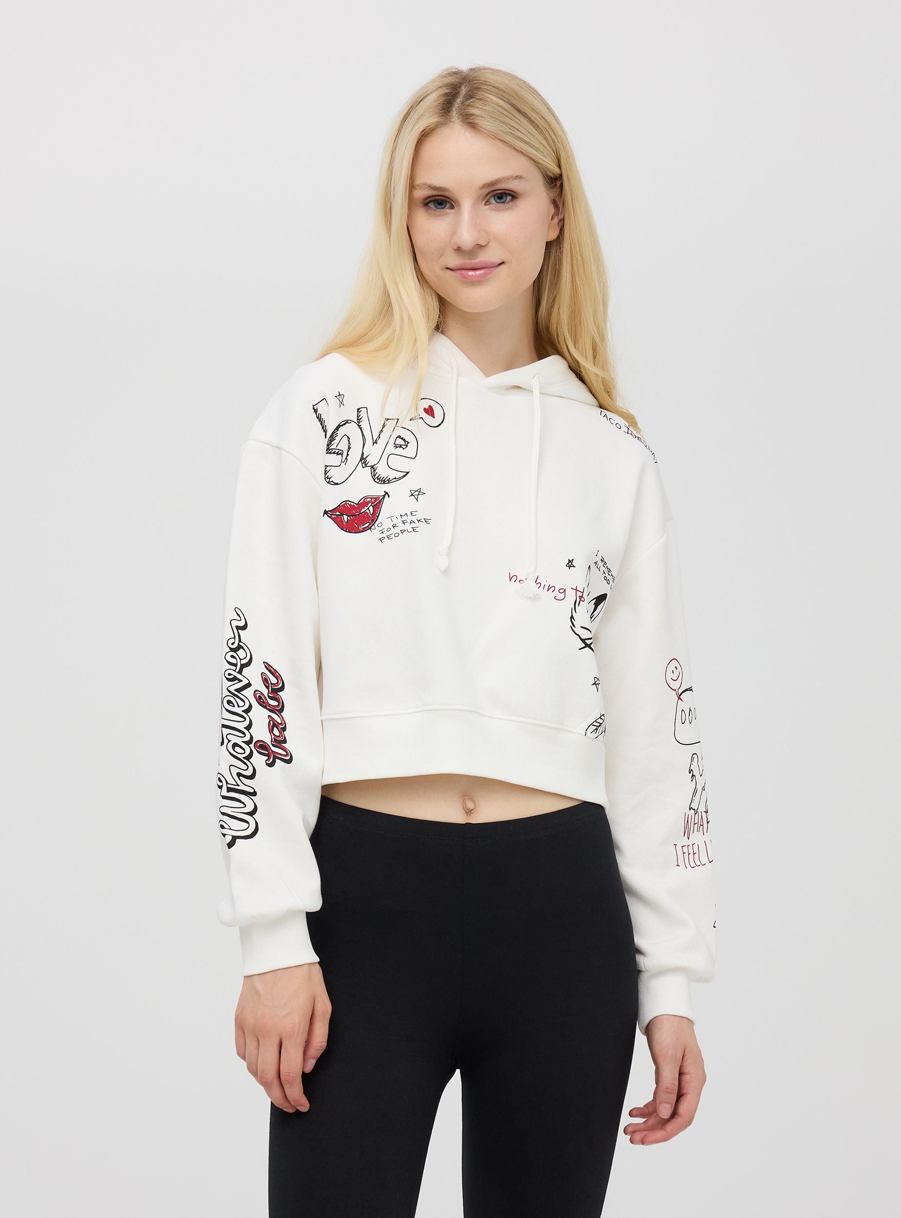 Felpa da donna, modello chiuso con cappuccio e coulisse, con stampa graffiti sul davanti e sulle maniche. Tessuto pesante. Capo casual ideale per i look di tutti i giorni. Vestibilità crop.