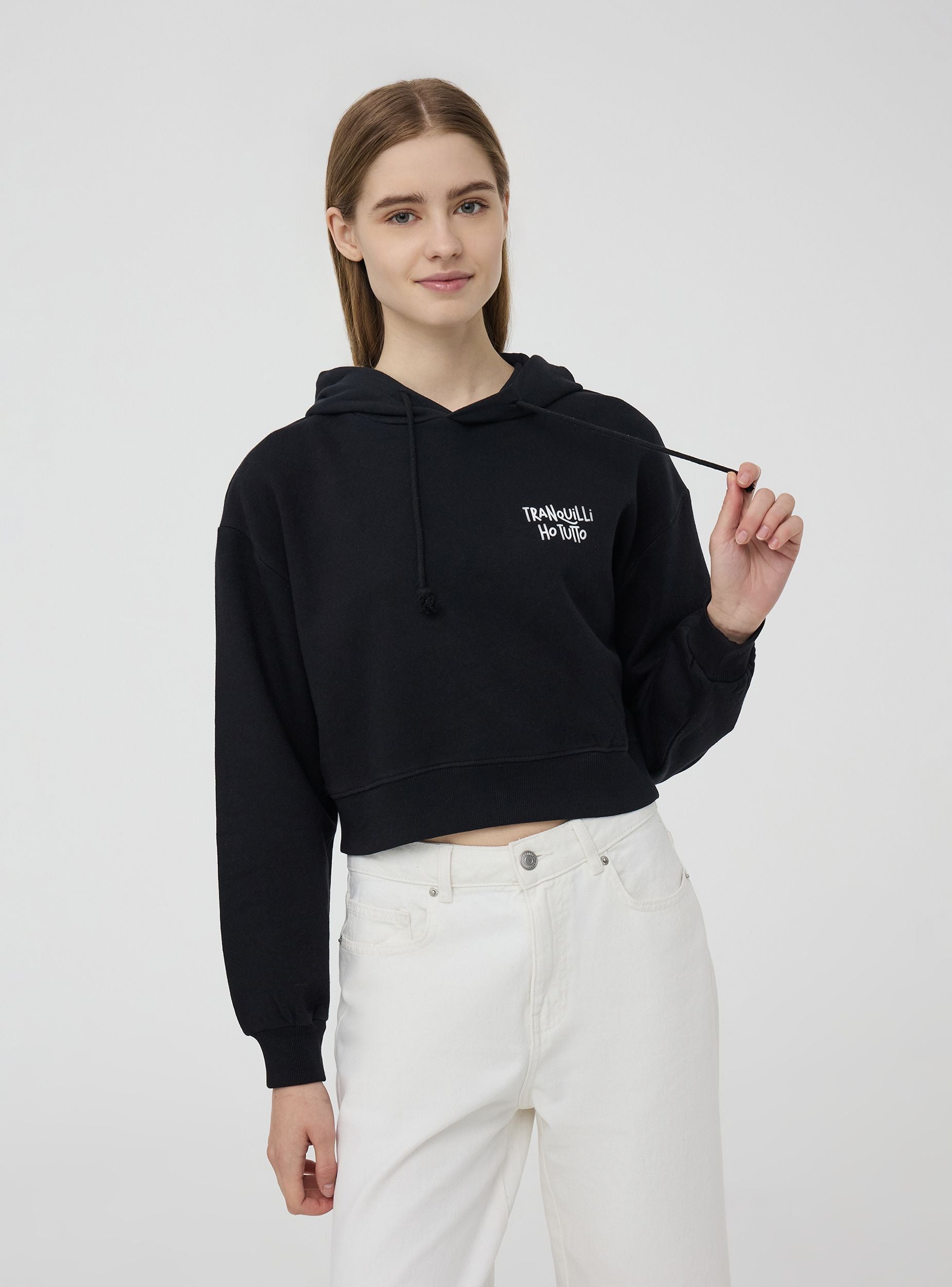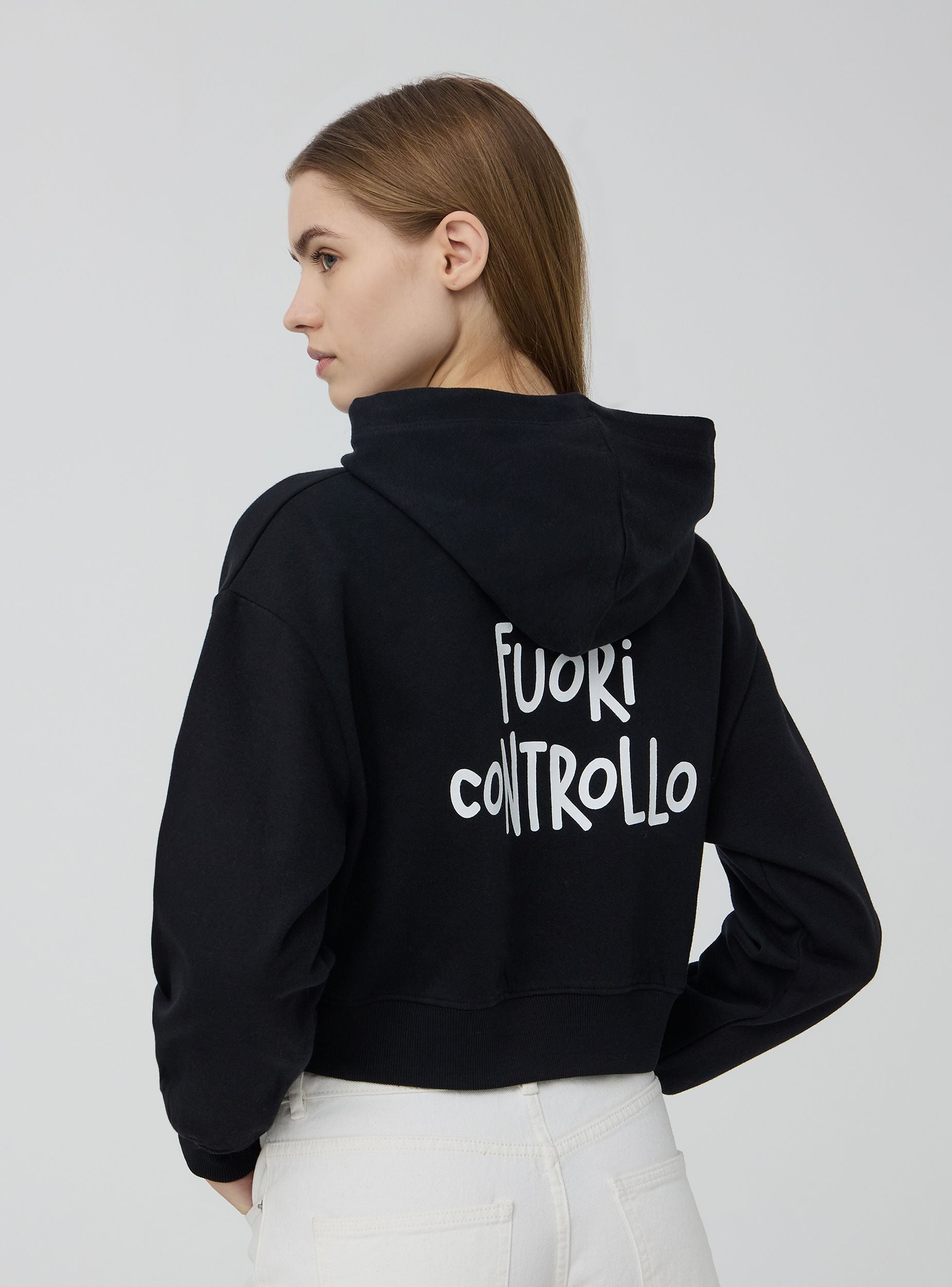 Felpa da donna dalla vestibilità crop. Modello dotato di cappuccio con coulisse, polsini e orlo inferiore a costine. Presenta una stampa a contrasto con scritta divertente sul davanti che continua il messaggio sul retro. Perfetta per aggiungere un tocco simpatico ad outfit casual.