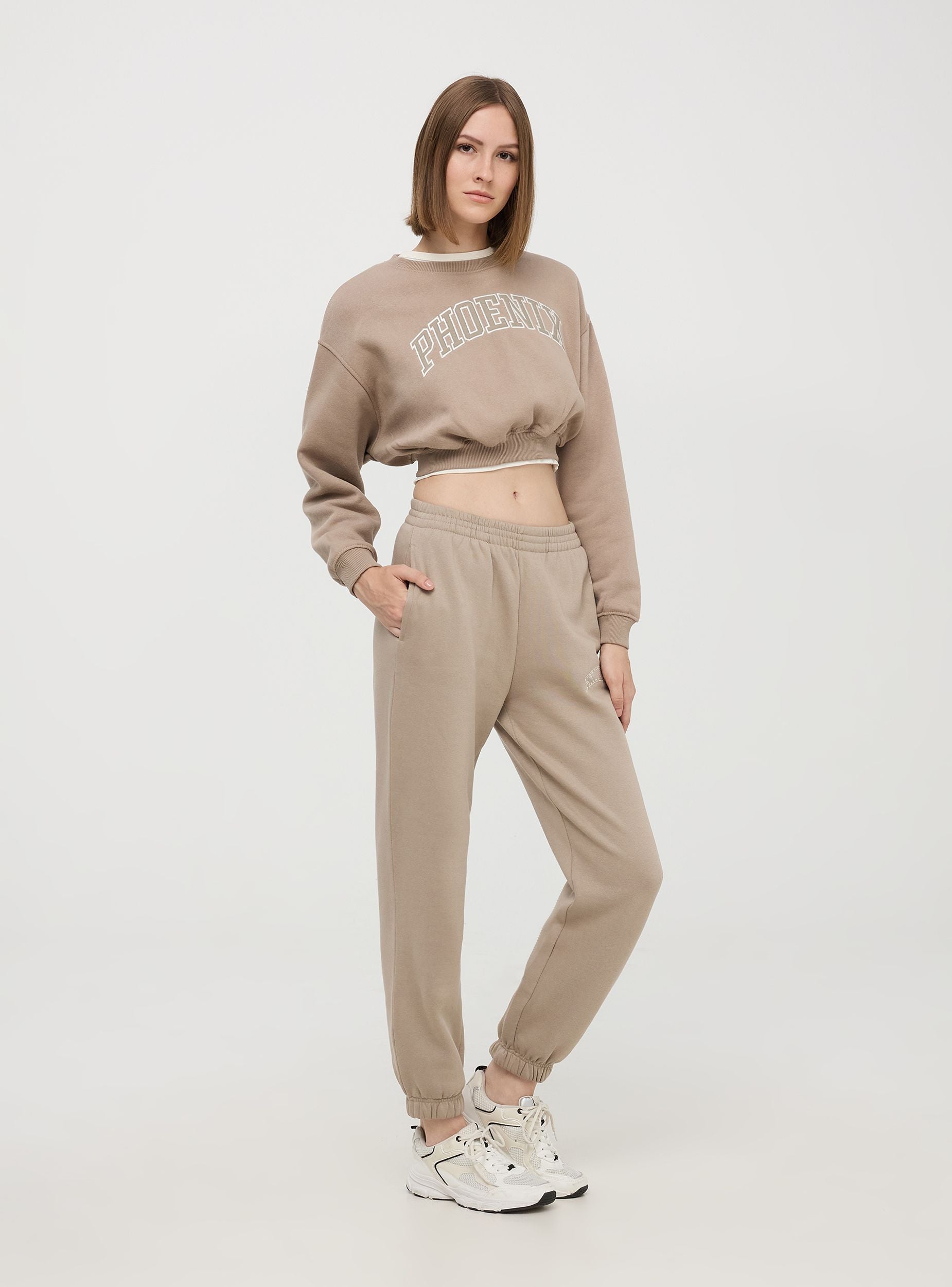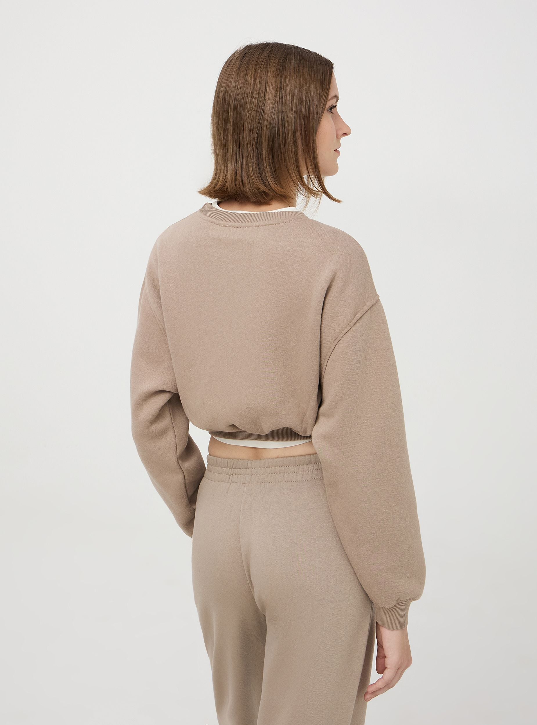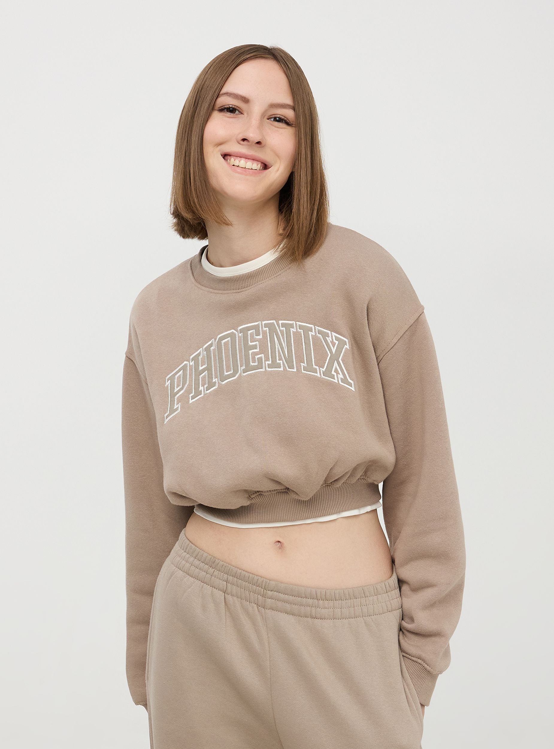 Felpa da donna, modello chiuso senza cappuccio, in tessuto pesante a tinta unita con patch e ricamo in stile college sul davanti, con finiture a costine. Capo perfetto per uno stile casual o sportivo. Vestibilità crop.