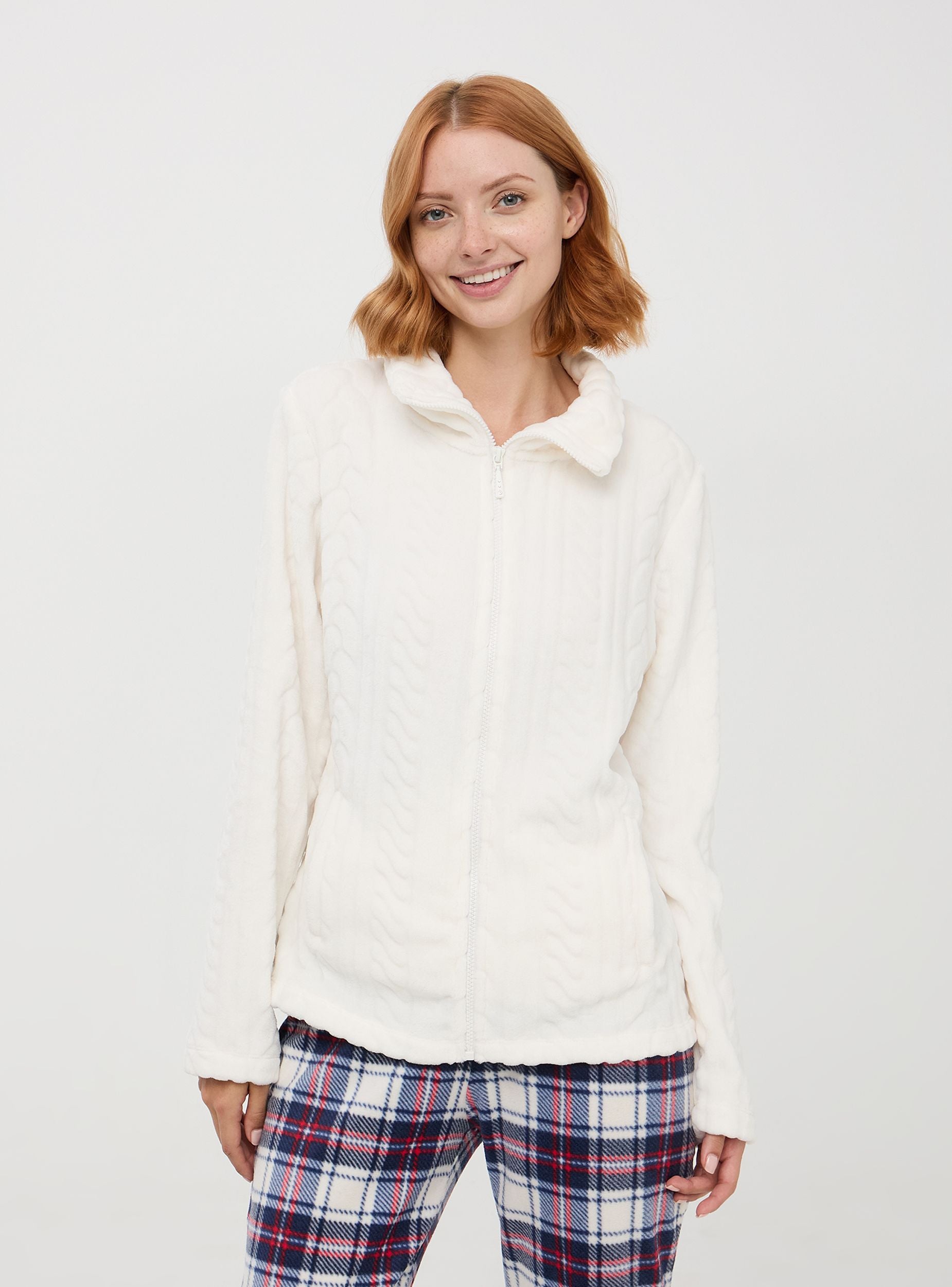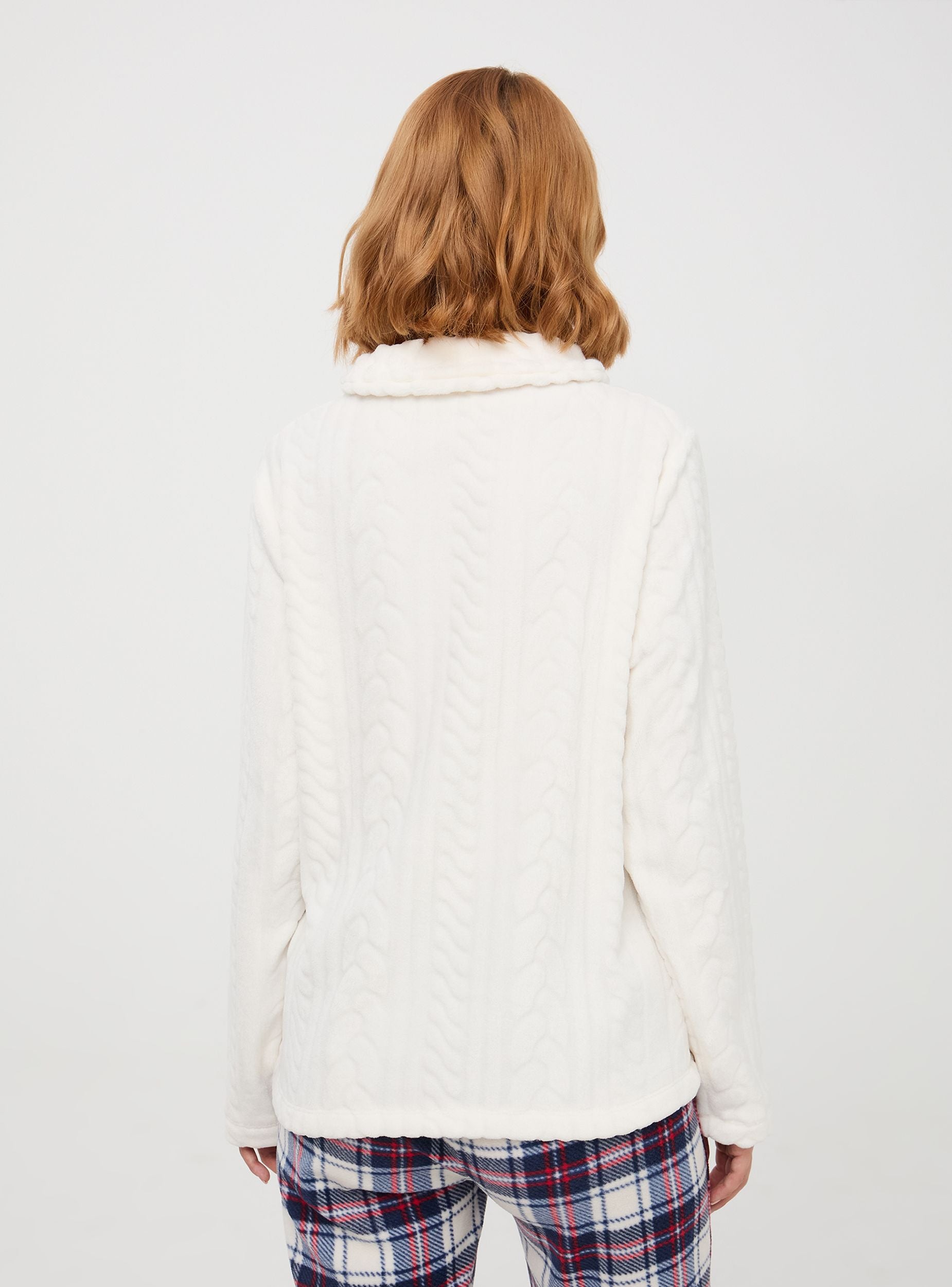 Felpa da donna a collo alto, modello senza cappuccio, con tasche a filetto. Chiusura frontale con cerniera e tirazip impreziosito da strass. Il tessuto in pile a trecce è morbido e confortevole. Perfetta per un look casual e chic nelle giornate più fresche. Vestibilità regular.