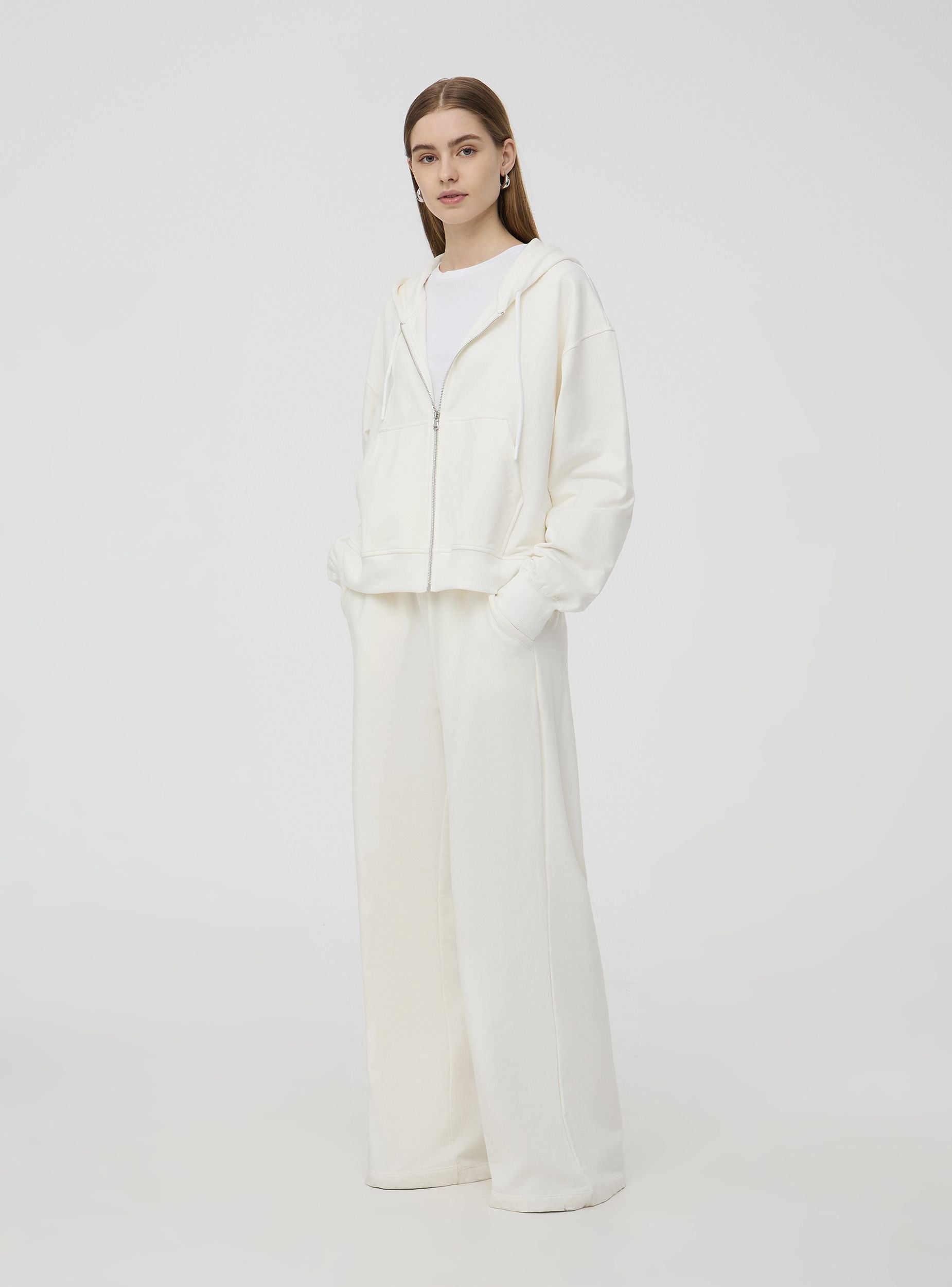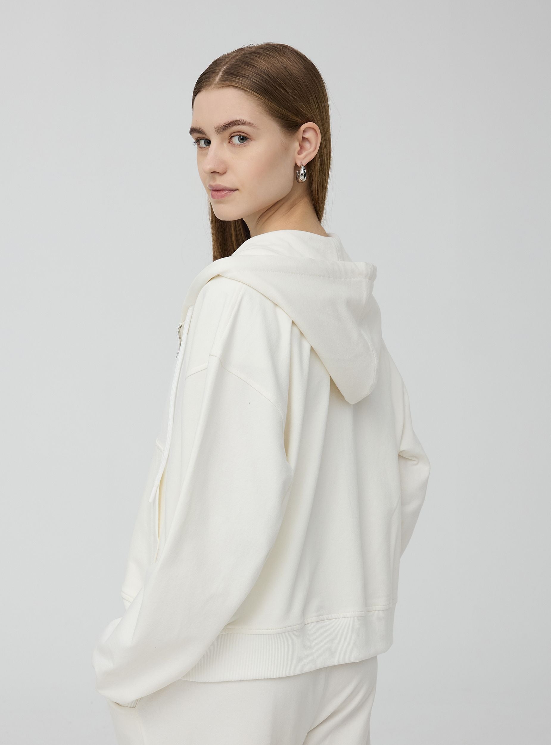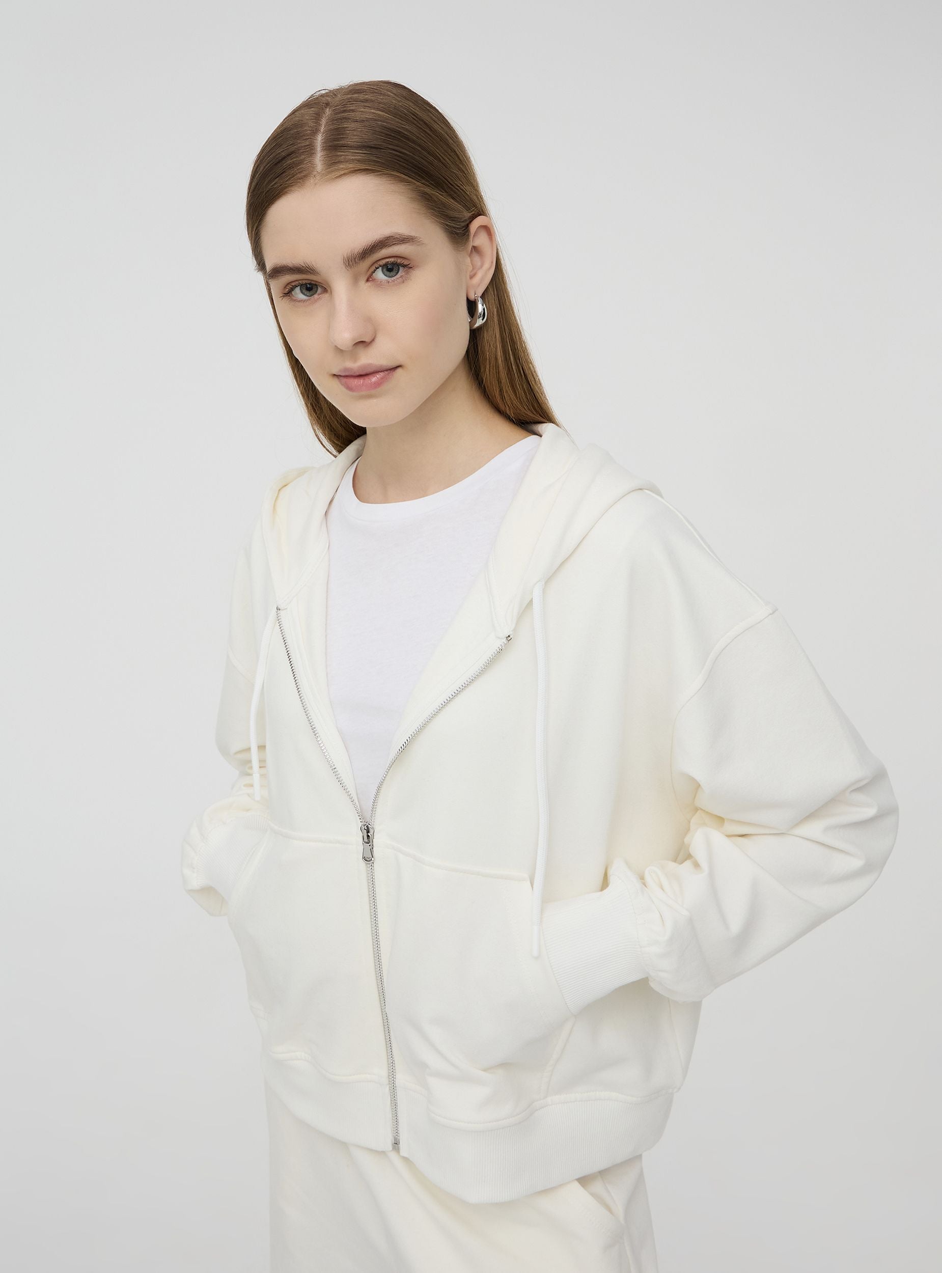 Felpa over da donna dotata di cappuccio regolabile con coulisse. Chiusura frontale con zip. Modello con tasche a marsupio. La vestibilità over la rende comoda e adatta ad outfit casual.
