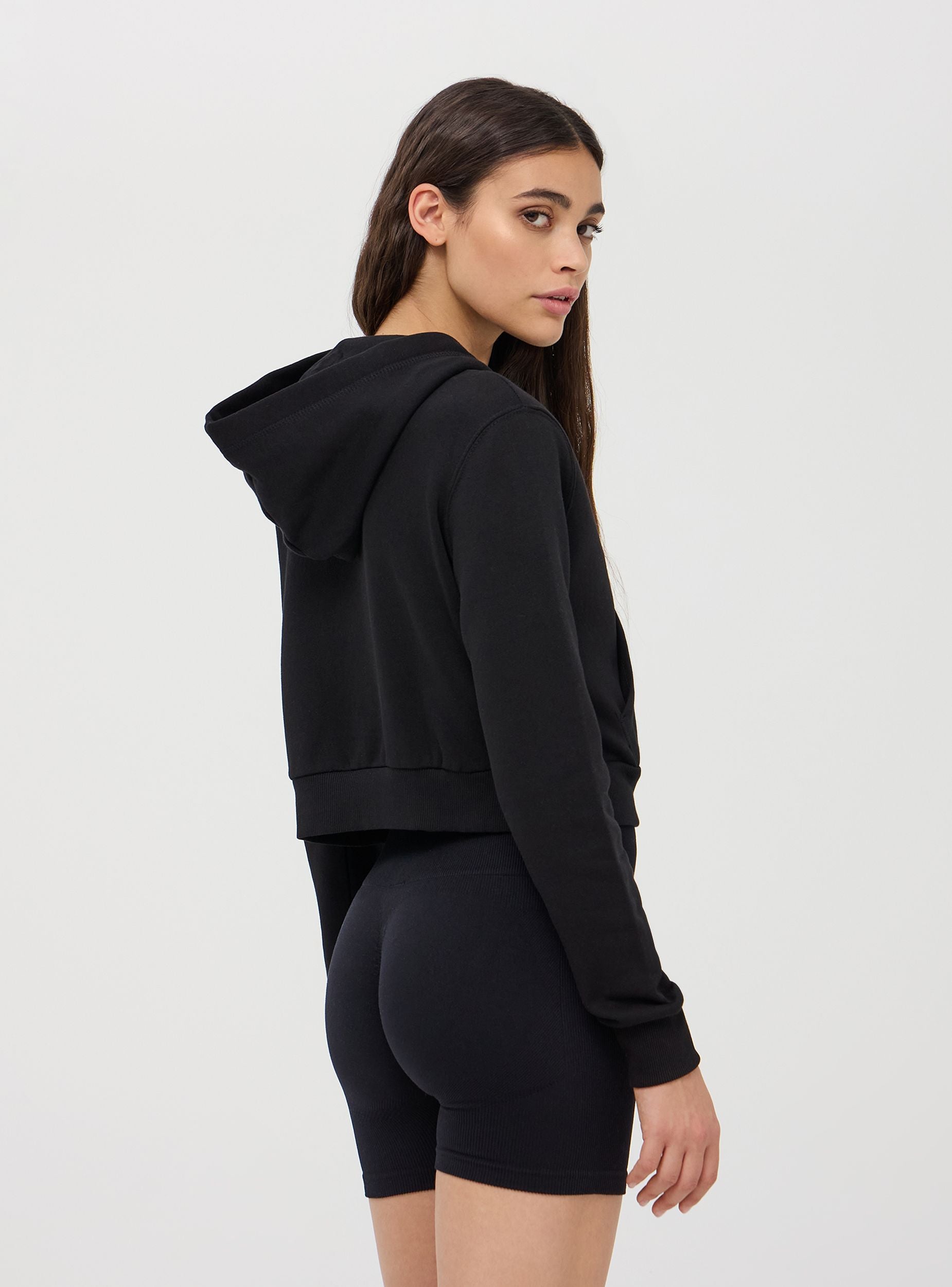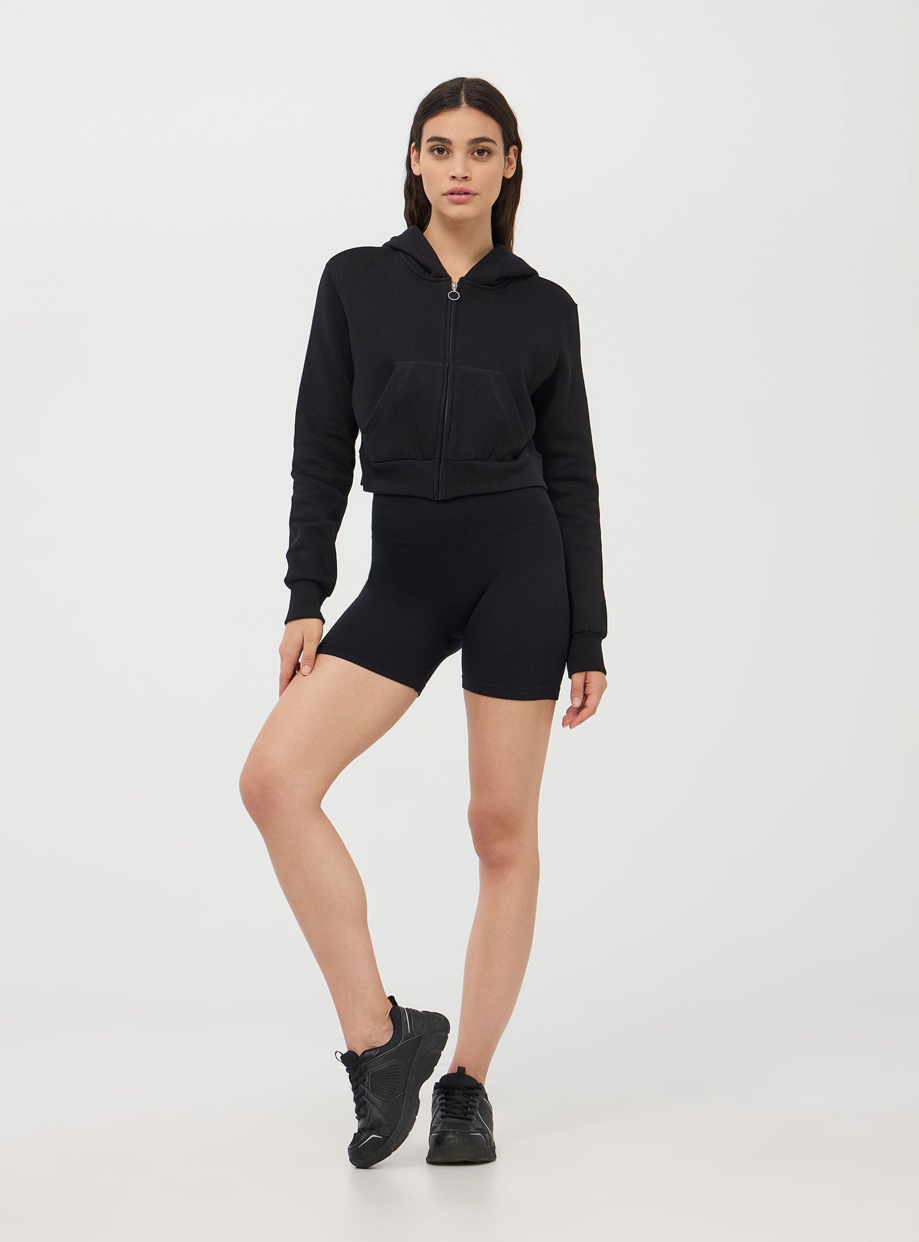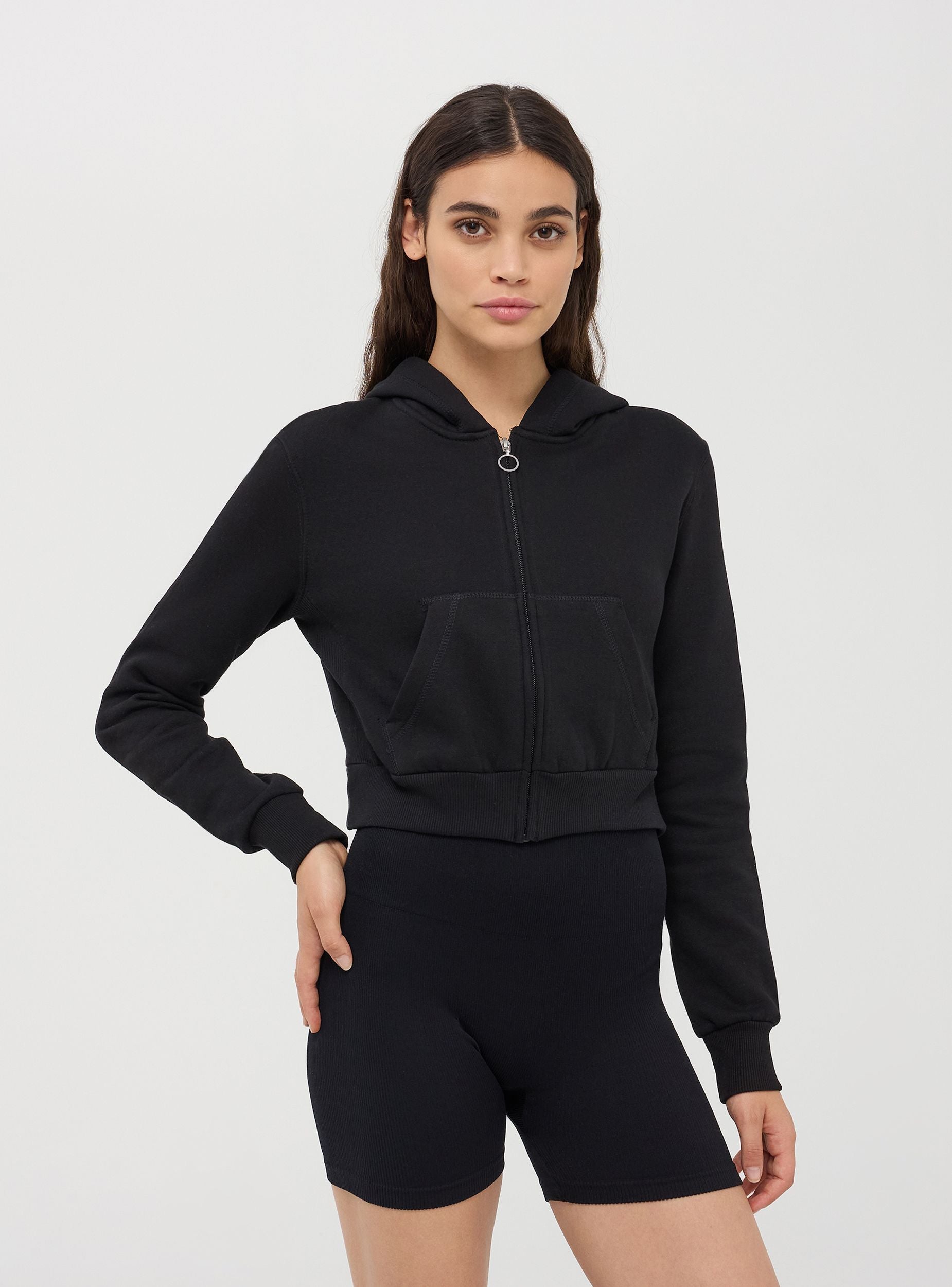 Felpa da donna con cappuccio, chiusura con cerniera e tasche frontali a marsupio, in tessuto pesante a tinta unita. Capo basic perfetto per completare outfit casual. Vestibilità crop.