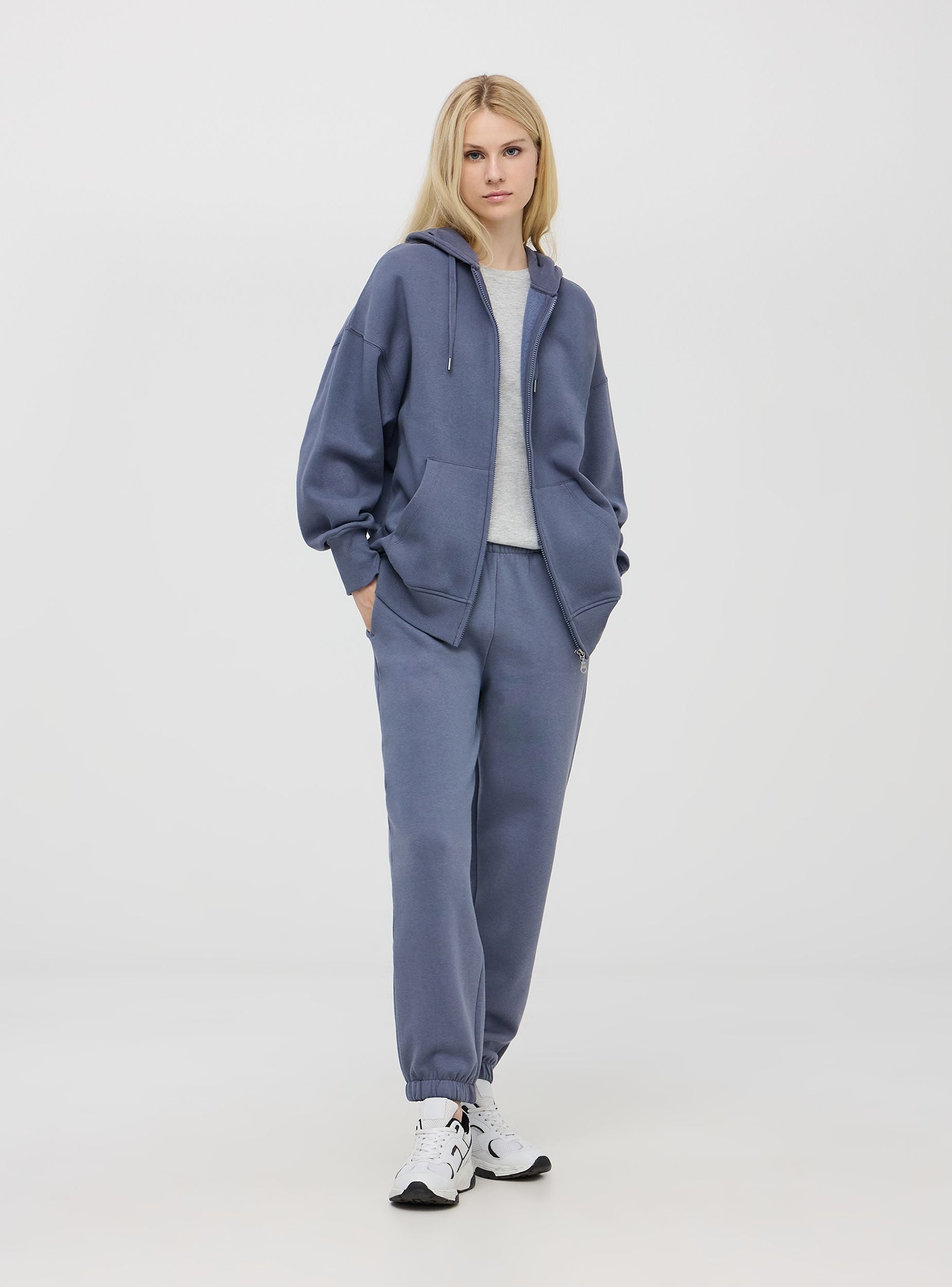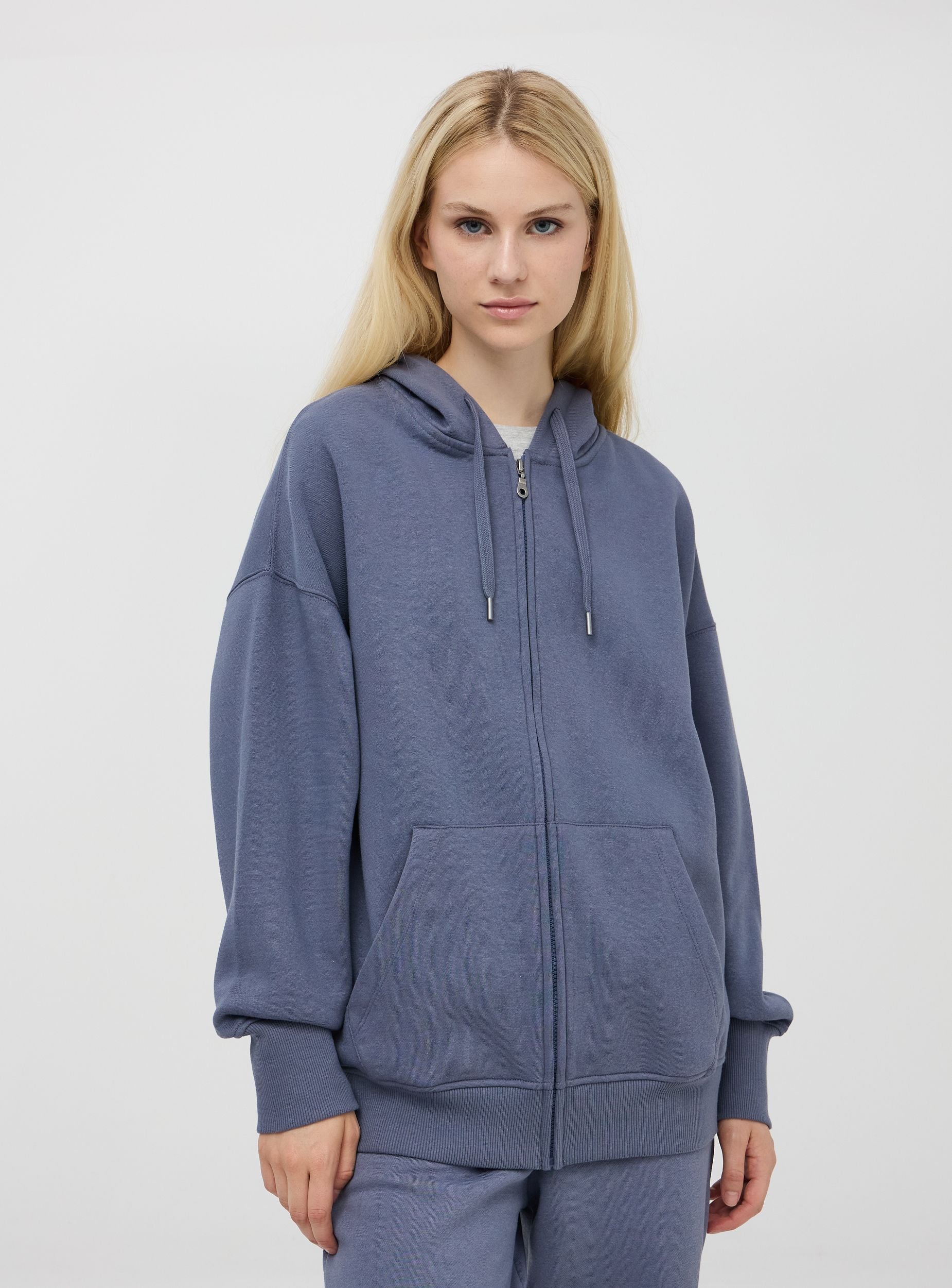 Felpa da donna con cappuccio e coulisse, chiusura con cerniera e tasche frontali a marsupio, in tessuto pesante a tinta unita. Perfetta per outfit casual e comodi. Vestibilità ampia.