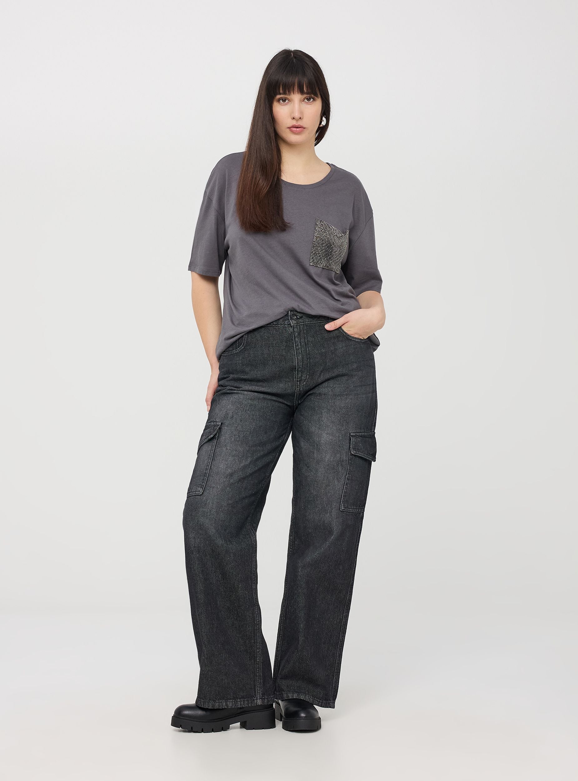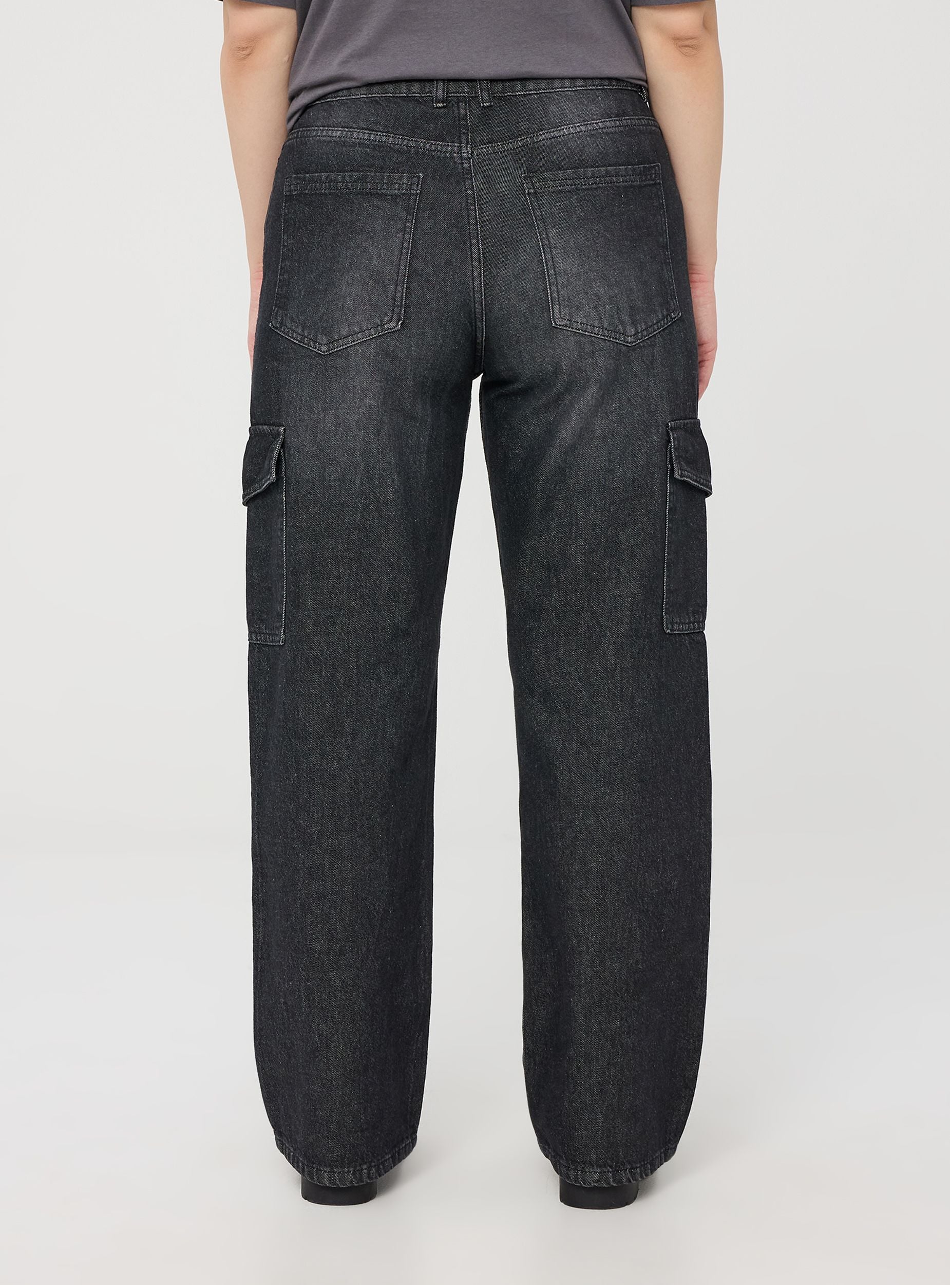 Jeans cargo da donna caratterizzati da una vestibilità ampia e comoda. Presentano una classica chiusura con bottone e zip, passanti per cintura, e tasche posteriori applicate. Le tasche cargo laterali, posizionate su entrambi i lati delle gambe, aggiungono un tocco pratico e contemporaneo. La silhouette dritta delle gambe conferisce un aspetto casual ma allo stesso tempo versatile, adatto a diverse occasioni.