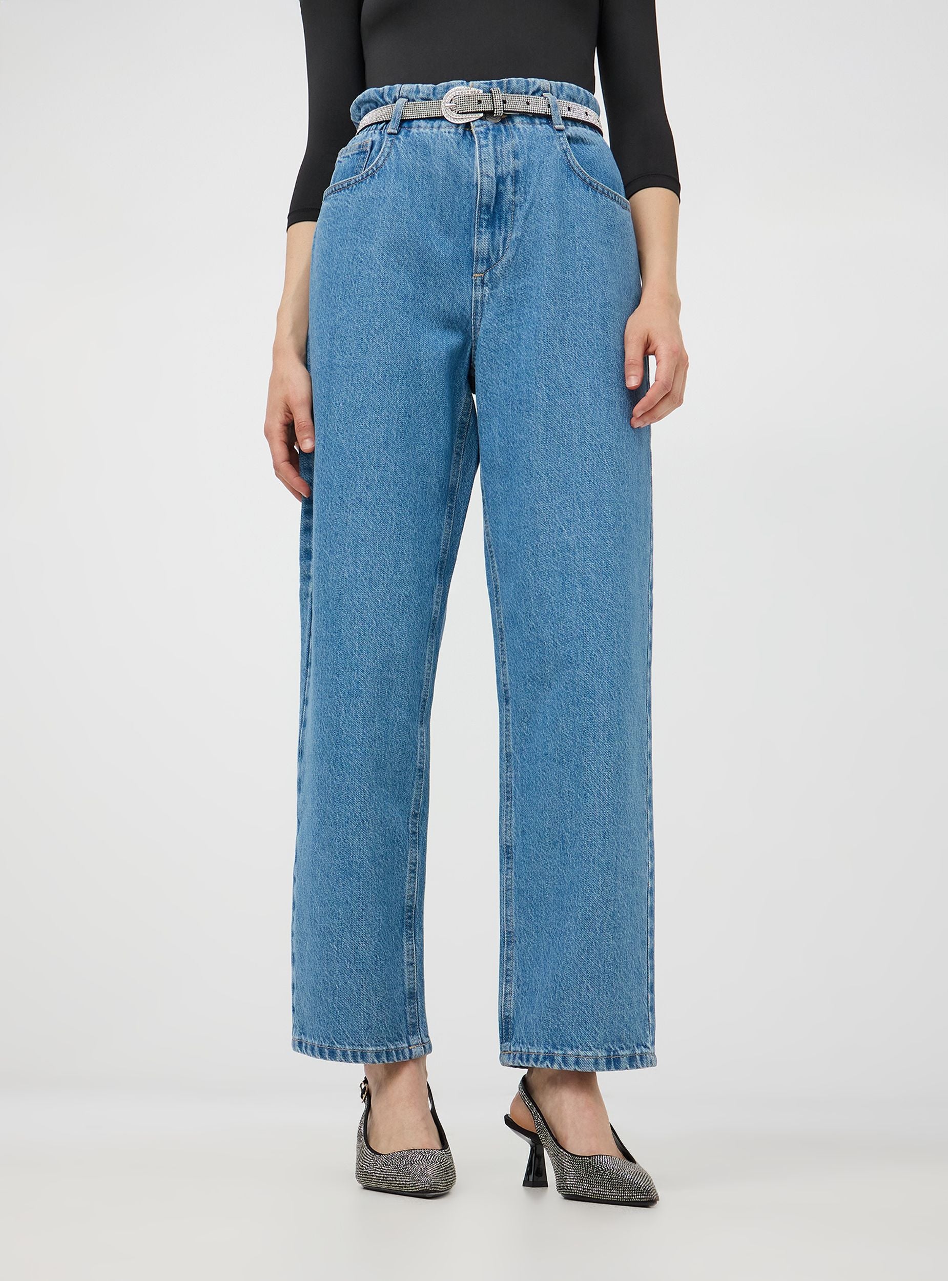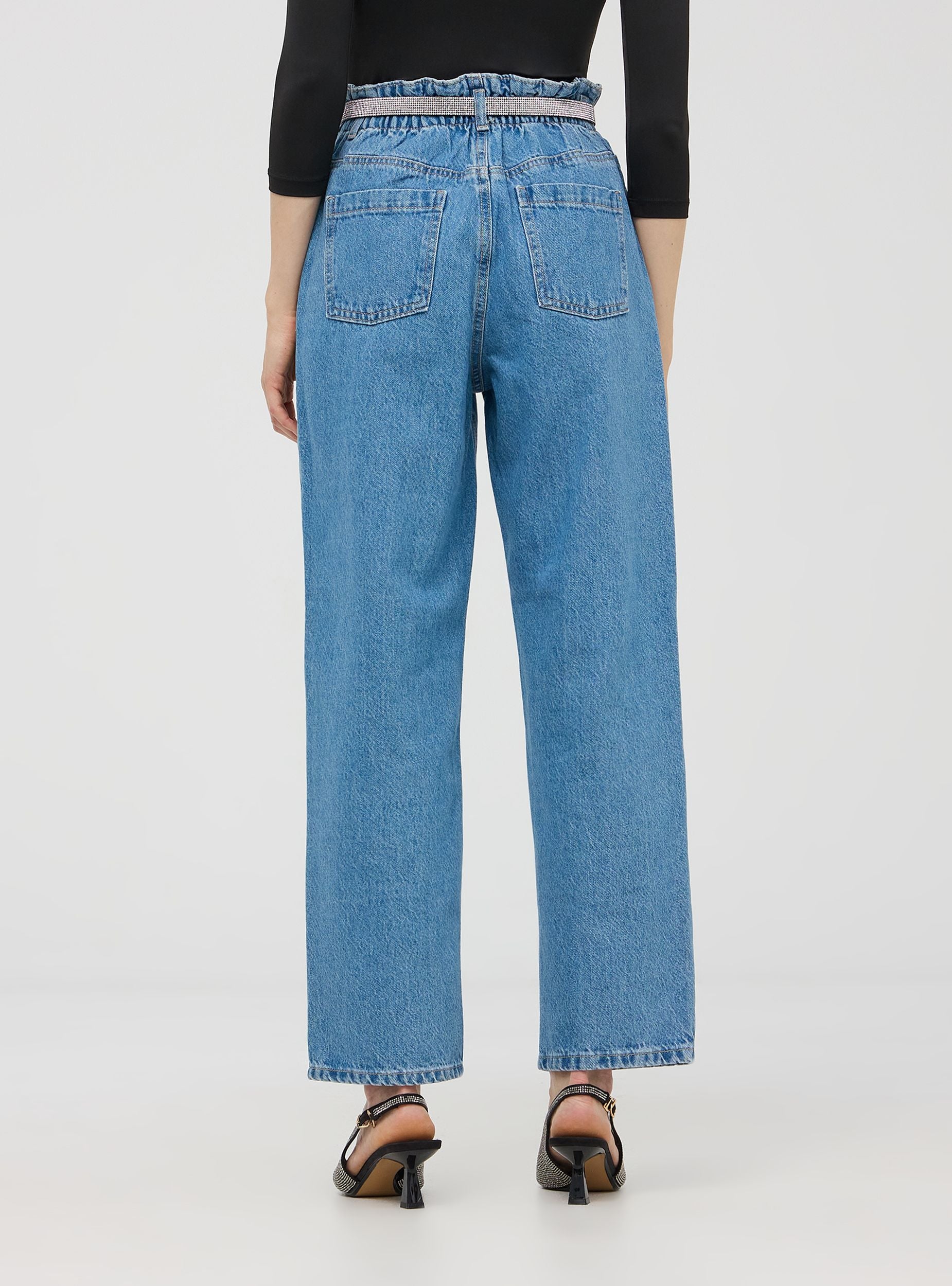 Pantaloni Jeans da donna in denim di tonalità blu medio, caratterizzati da un design paperbag che valorizza la silhouette grazie alla vita alta. Il punto vita è impreziosito da un elastico arricciato che garantisce una vestibilità confortevole e versatile, adattandosi perfettamente a diverse forme del corpo. la chiusura è con bottone e cerniera nascosta da una patta. Sono presenti passanti che permettono di indossare questi jeans con una cintura, aggiungendo un ulteriore elemento di personalizzazione al look. La cintura può essere utilizzata per stringere ulteriormente la vita, creando un effetto ancora più definito e chic. I jeans paperbag possono essere abbinati a diverse tipologie di top, dalle camicie eleganti infilate dentro i jeans per un look raffinato, alle magliette casual per un outfit quotidiano. Possono essere indossati con scarpe da ginnastica per un look rilassato e confortevole o con tacchi per una serata fuori per un look più elegante e sofisticatoDettagli