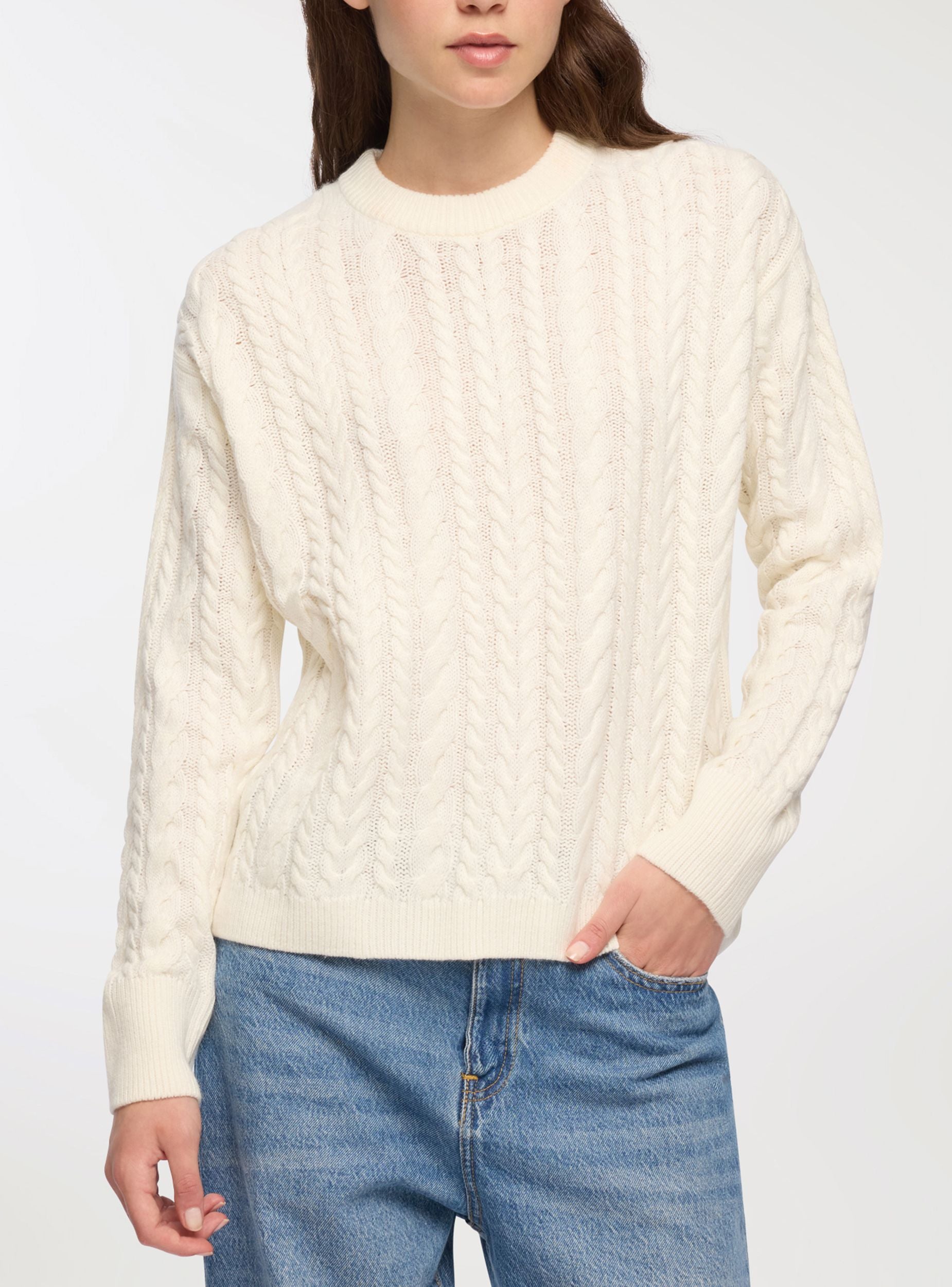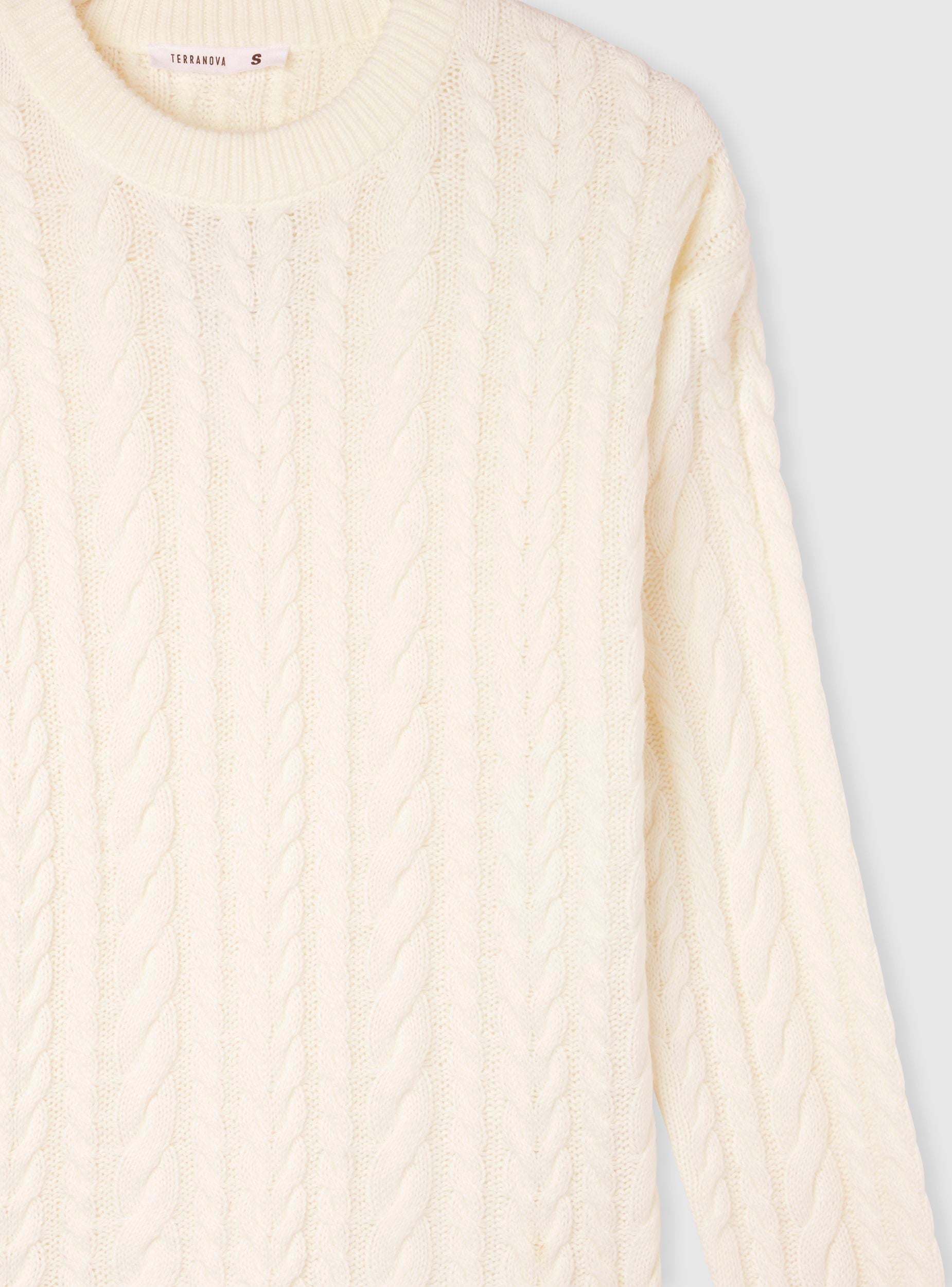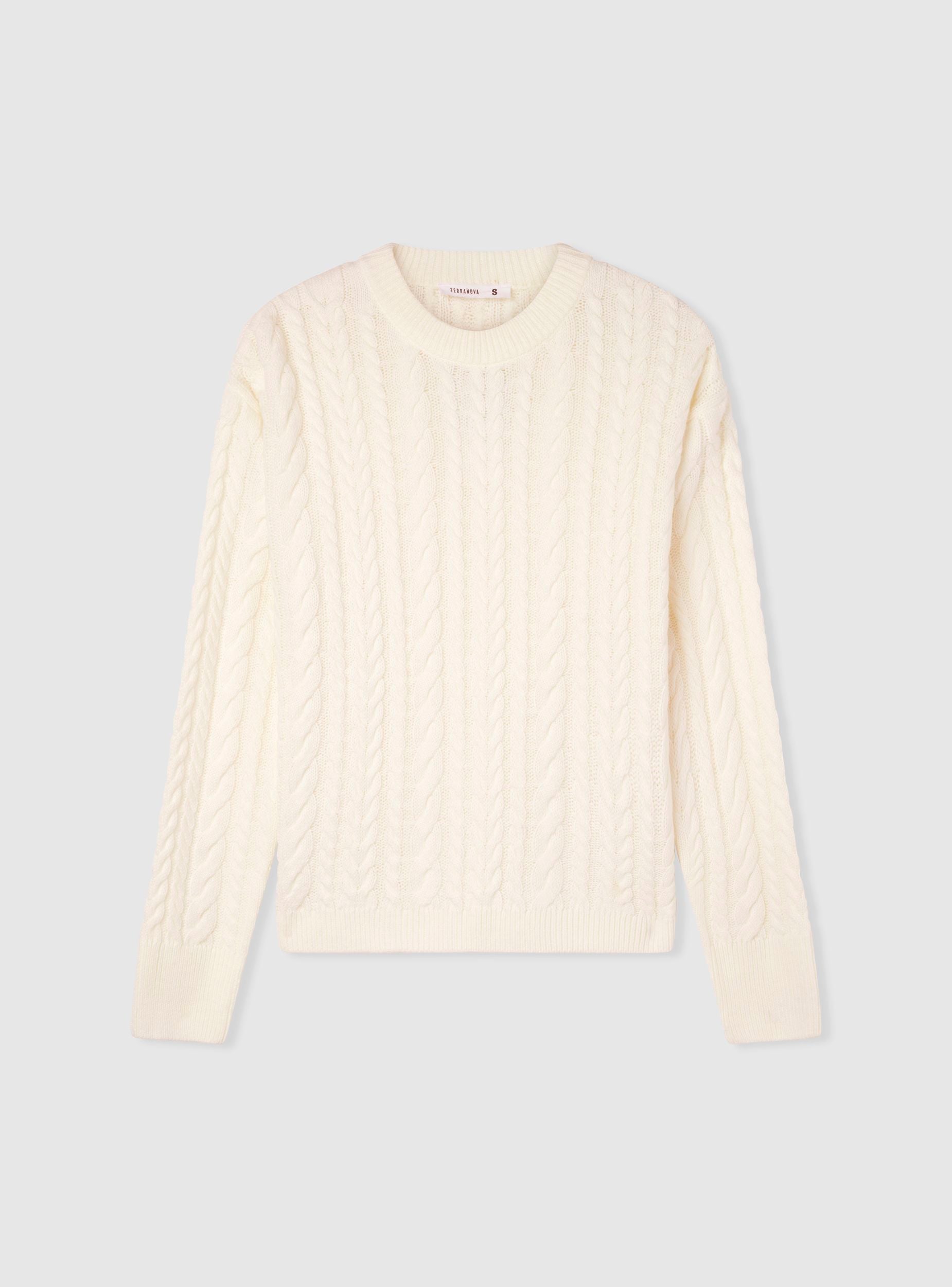 Maglia da donna con lavorazione a trecce, ideale per un look casual e confortevole. Presenta un design a girocollo e maniche lunghe, perfetta per essere abbinata a jeans o pantaloni per un outfit quotidiano. La vestibilità regolare garantisce comodità e stile, rendendola adatta a diverse occasioni.