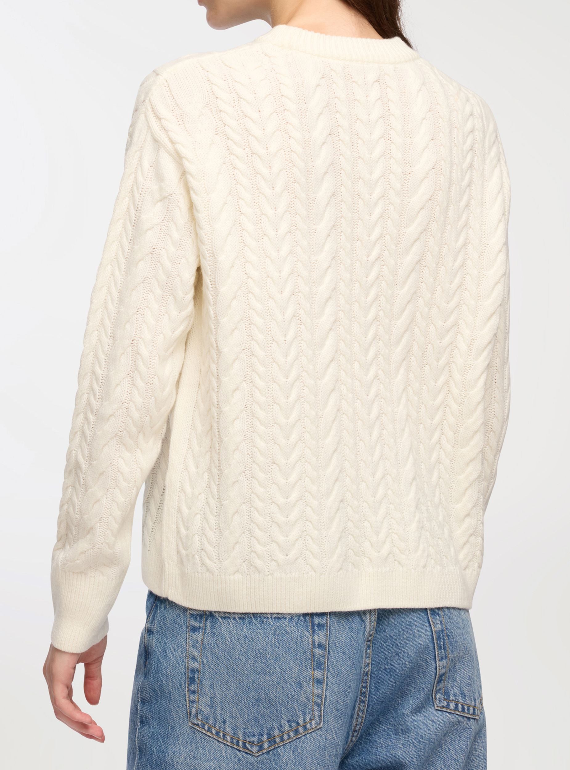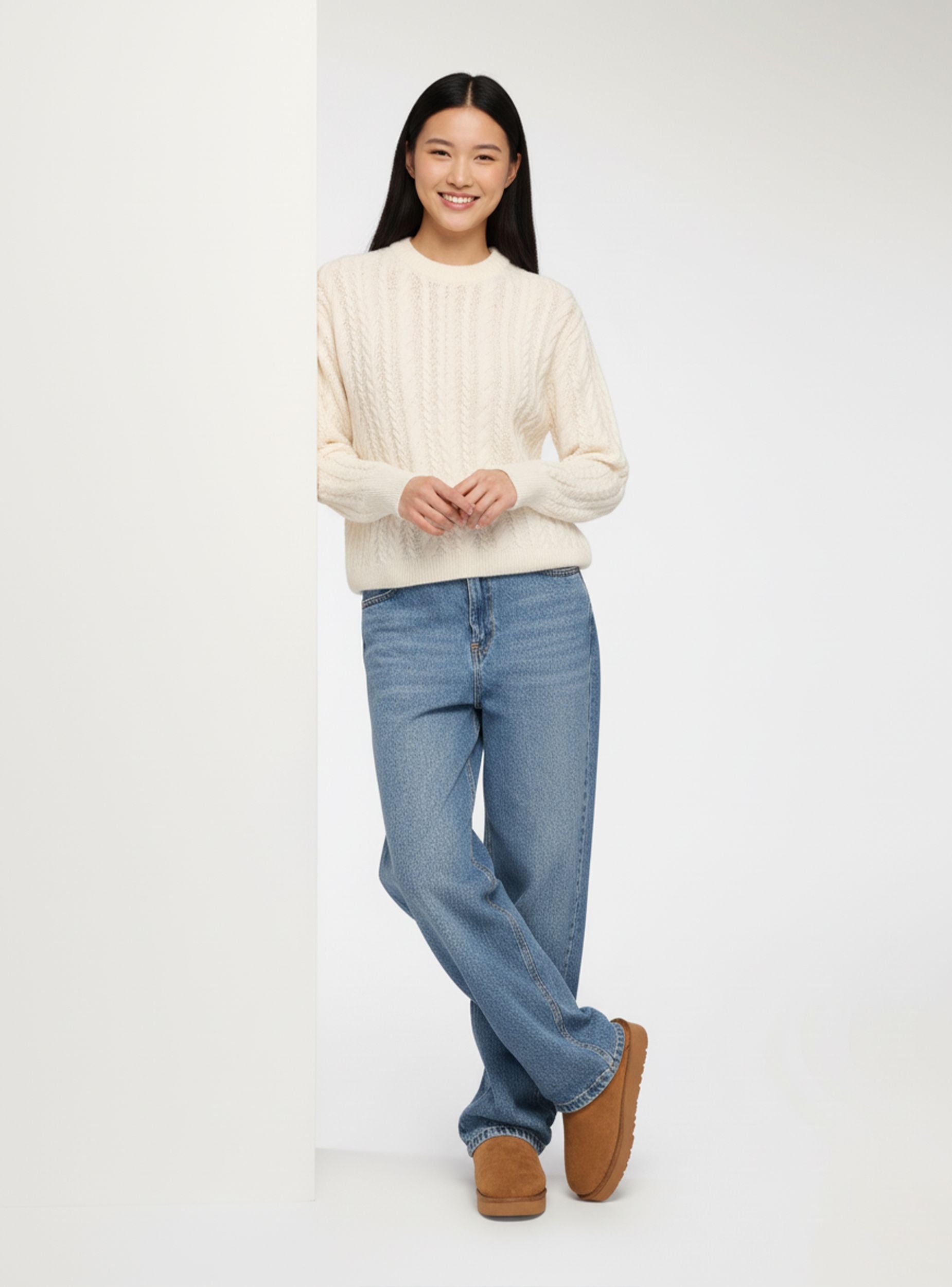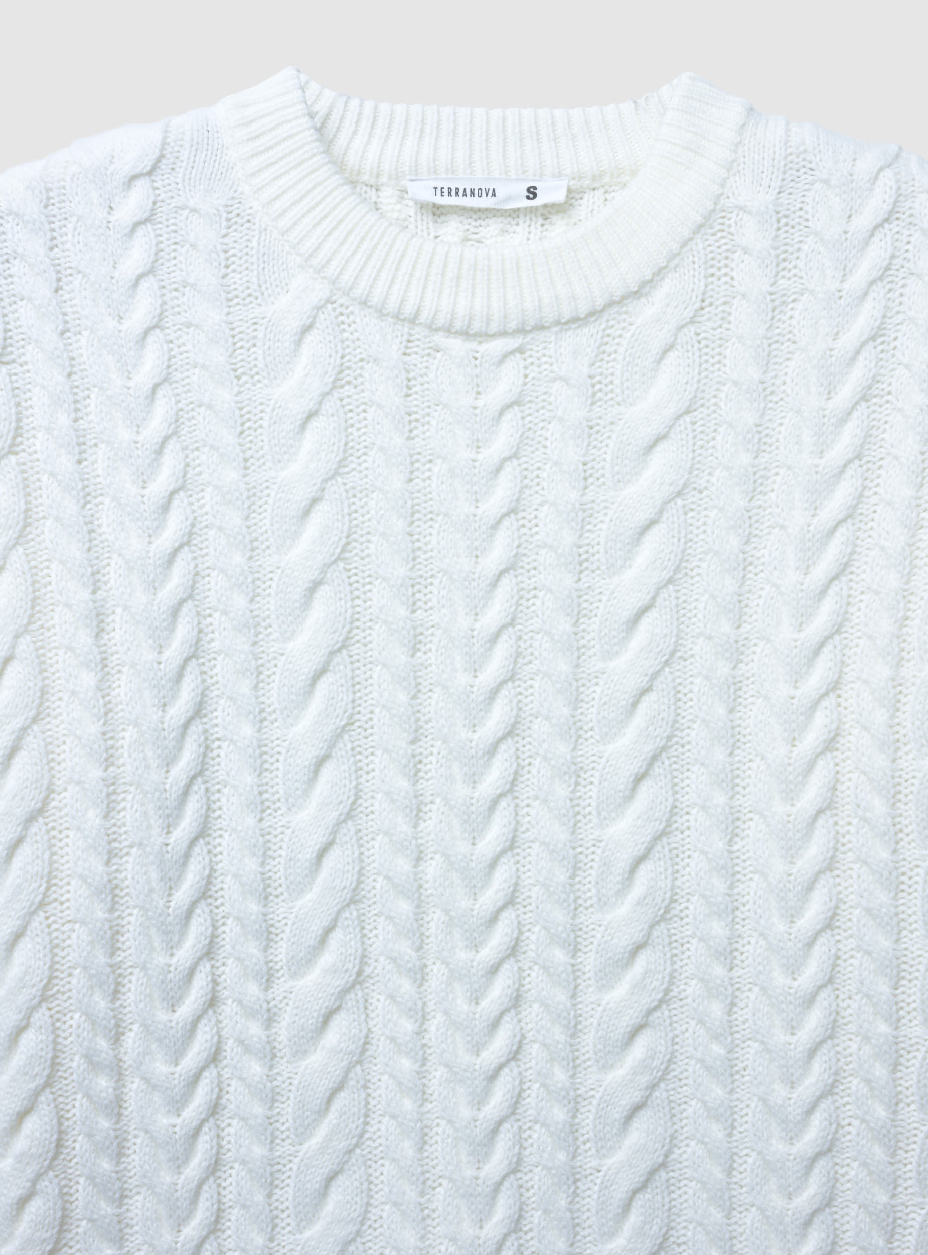 Maglia da donna con lavorazione a trecce, ideale per un look casual e confortevole. Presenta un design a girocollo e maniche lunghe, perfetta per essere abbinata a jeans o pantaloni per un outfit quotidiano. La vestibilità regolare garantisce comodità e stile, rendendola adatta a diverse occasioni.