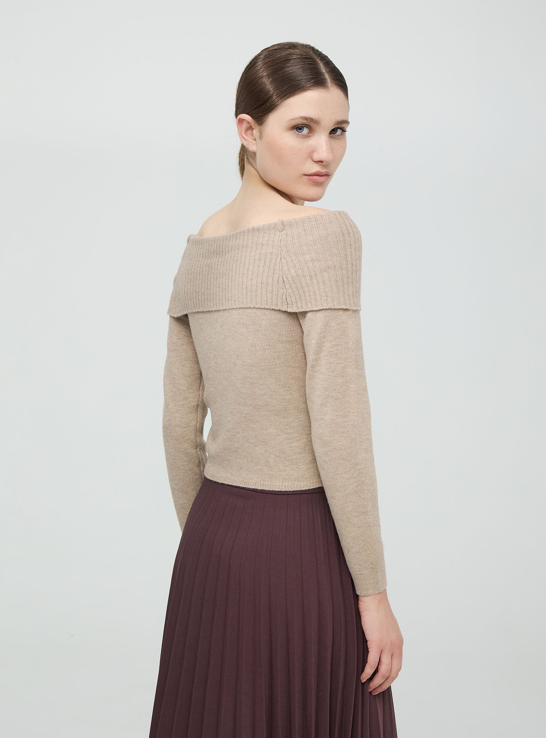 Maglia da donna in tessuto a tinta unita con scollo che lascia le spalle scoperte. Capo elegante e femminile. Vestibilità regular.