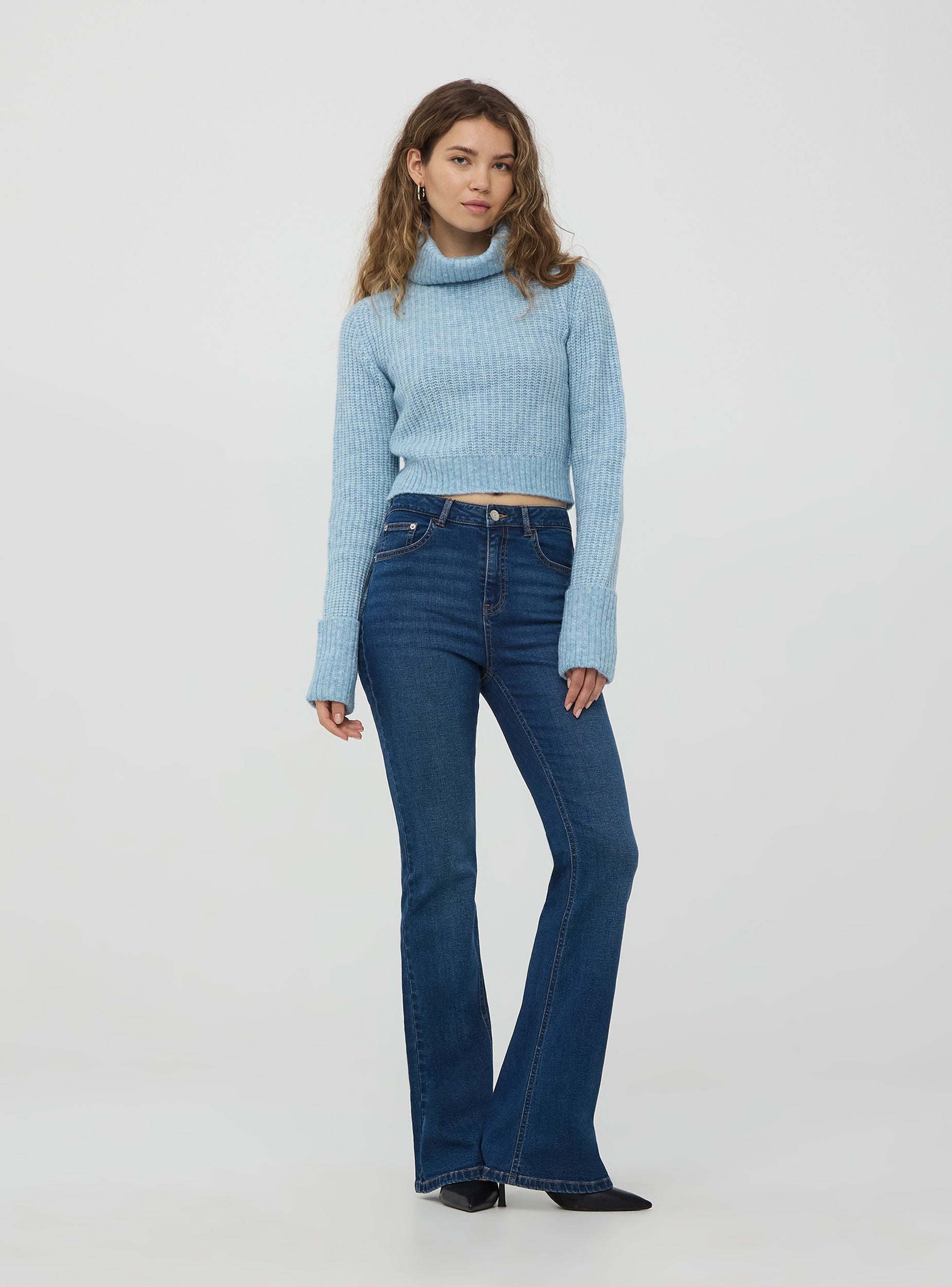 Maglione da donna a collo dolcevita, realizzato in maglia lavorata a costa inglese che conferisce al capo una texture raffinata e una vestibilità aderente. Il collo alto dolcevita aggiunge un elemento di calore e stile, perfetto per le stagioni più fredde. La lunghezza crop, che termina sopra la vita, dona un look moderno e alla moda.