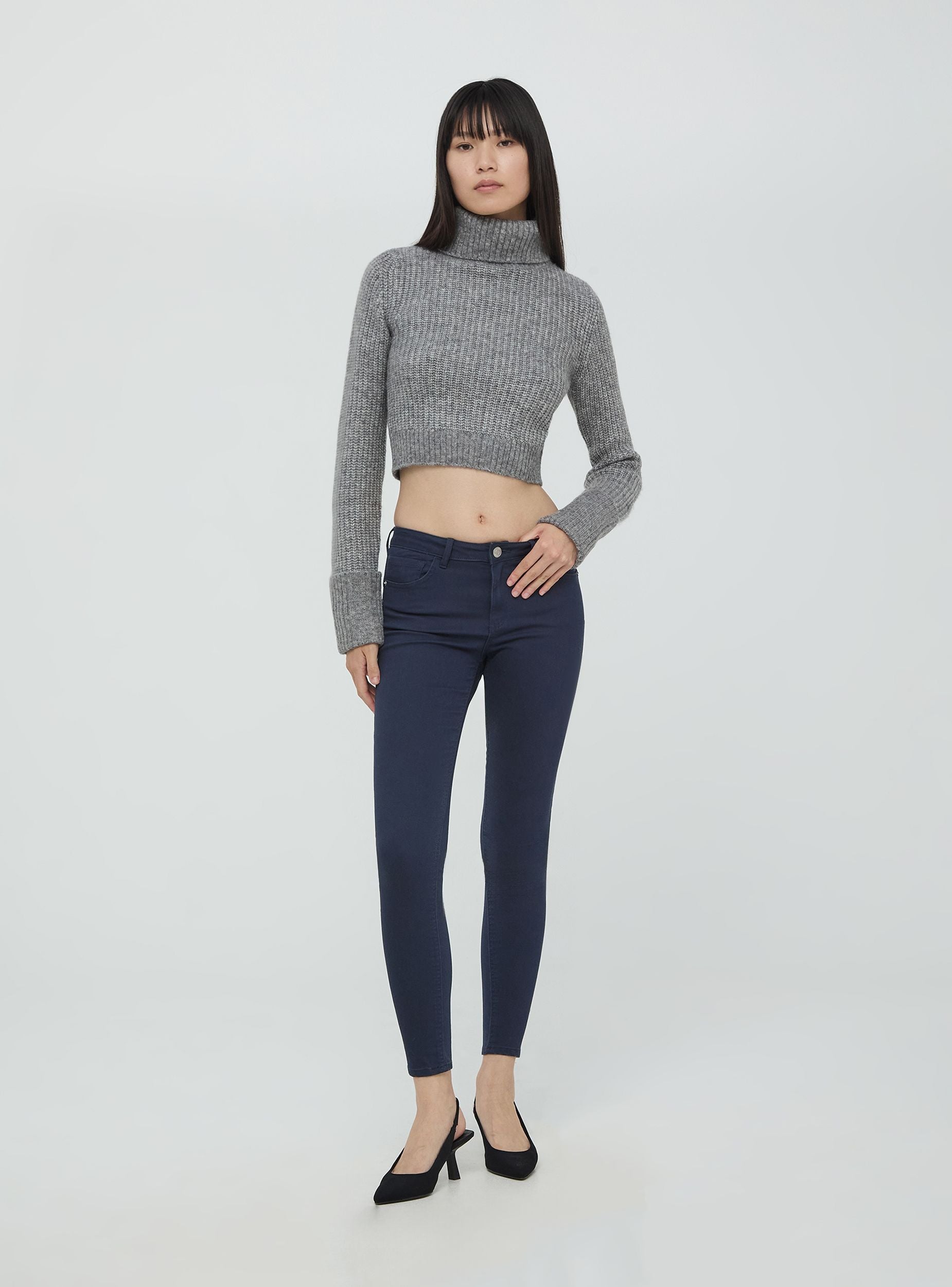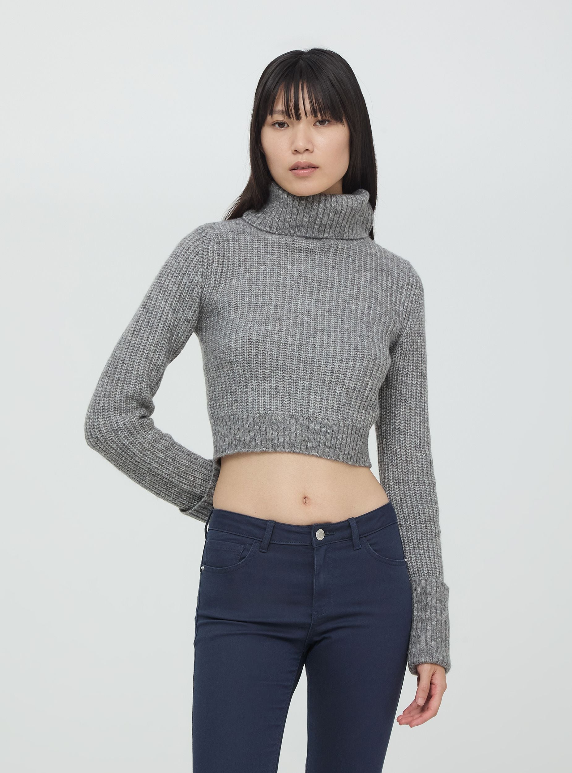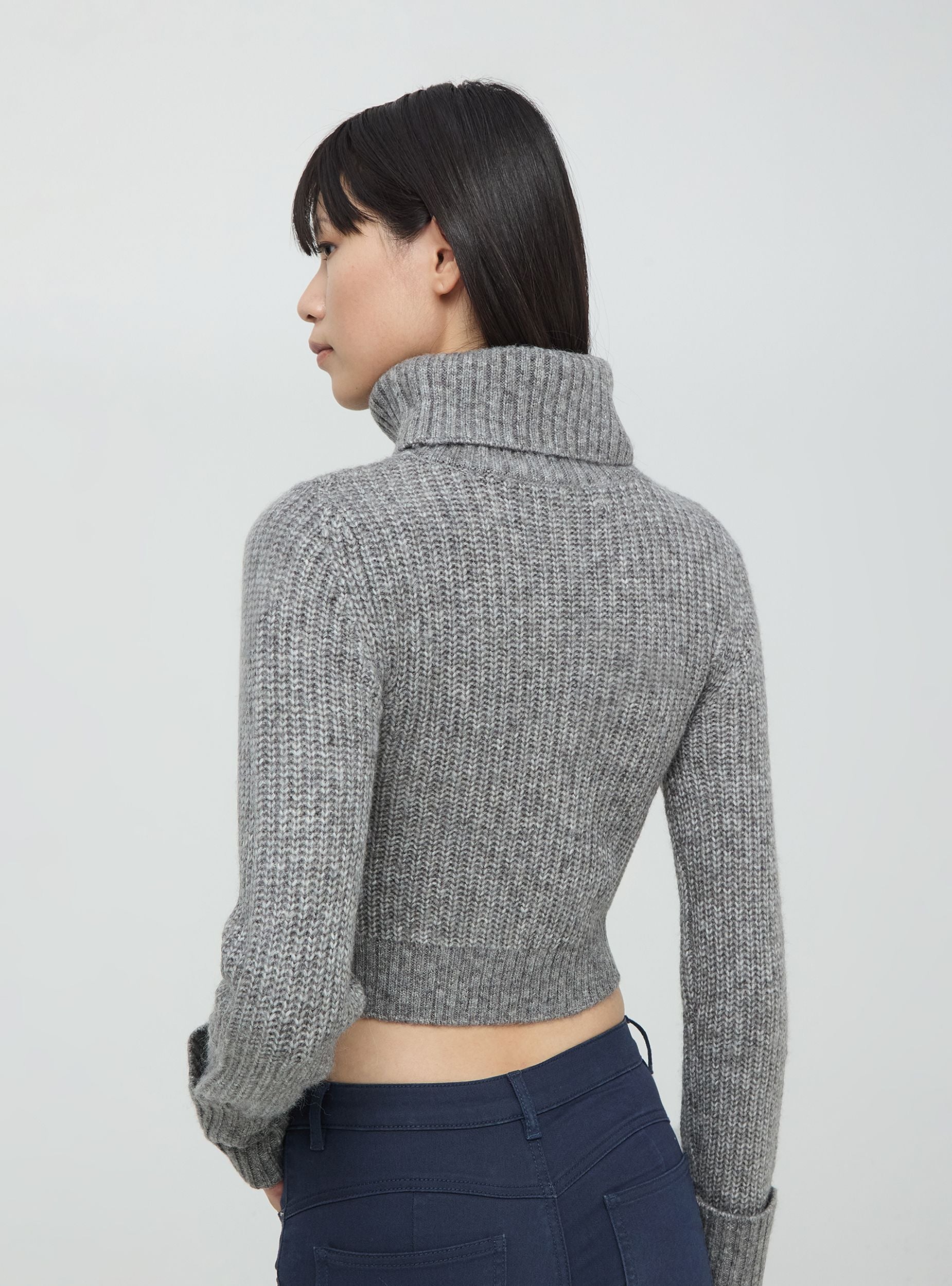 Maglione da donna a collo dolcevita, realizzato in maglia lavorata a costa inglese che conferisce al capo una texture raffinata e una vestibilità aderente. Il collo alto dolcevita aggiunge un elemento di calore e stile, perfetto per le stagioni più fredde. La lunghezza crop, che termina sopra la vita, dona un look moderno e alla moda.