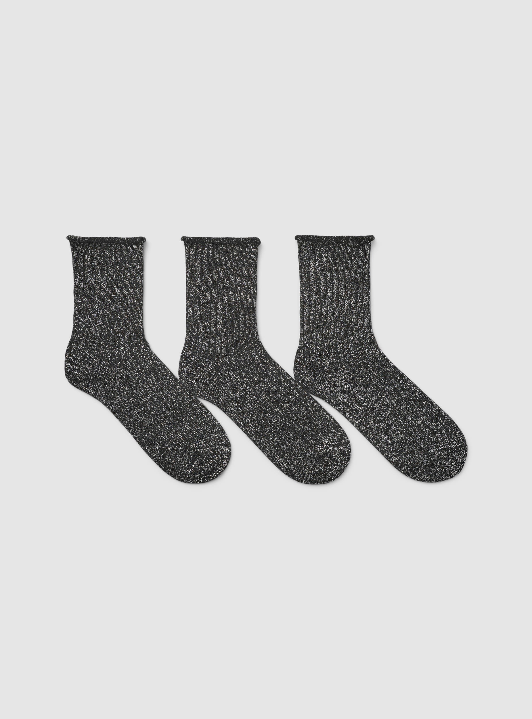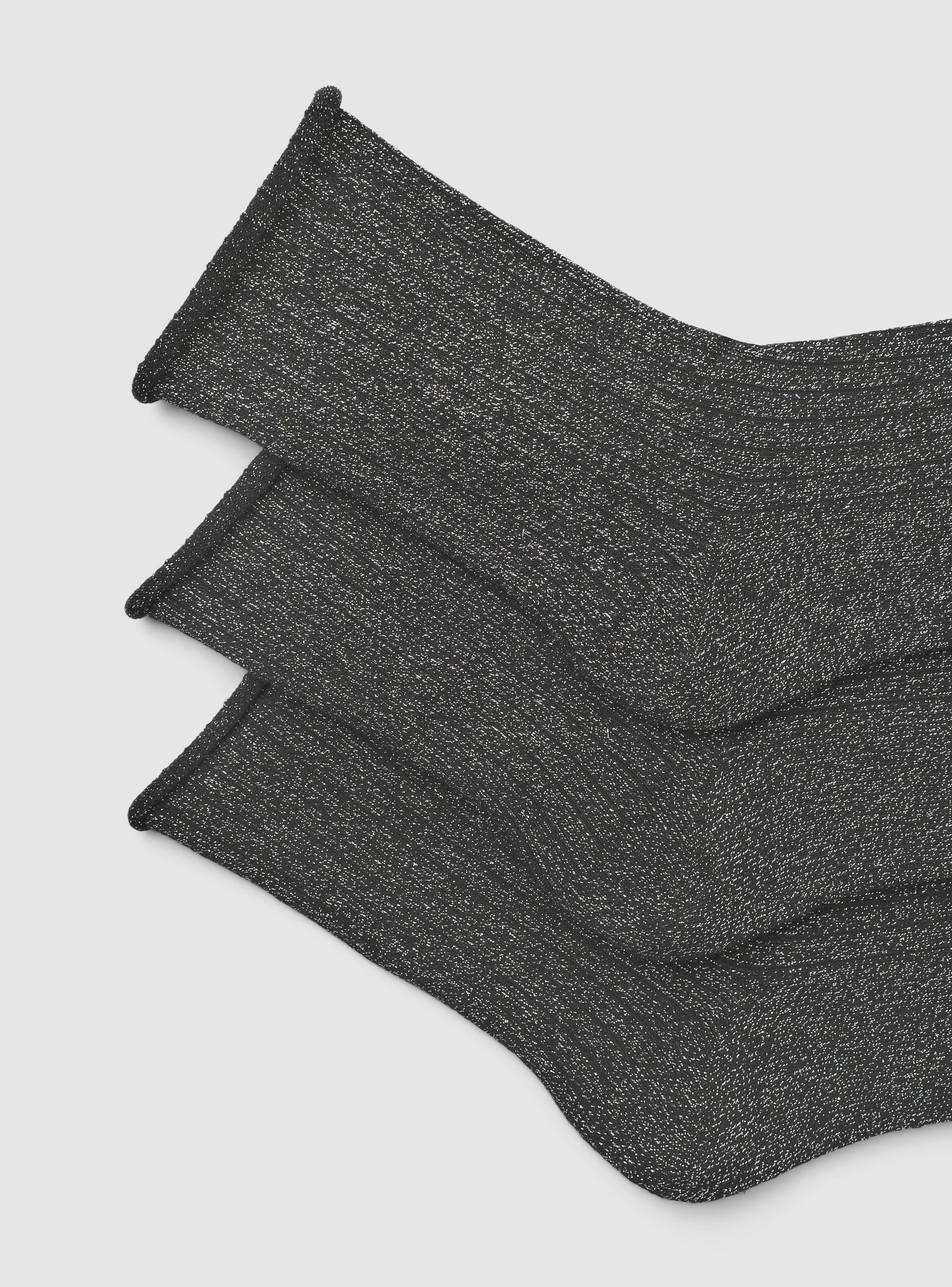 Calze da donna ideali per un look casual e confortevole. Confezione composta da tre paia di calzini a tinta unita effetto luccicante, perfette per completare outfit quotidiani. Design semplice e versatile, con una lunghezza standard che si adatta a diverse calzature. Queste calze offrono una vestibilità comoda e sono ideali per l'uso quotidiano.
