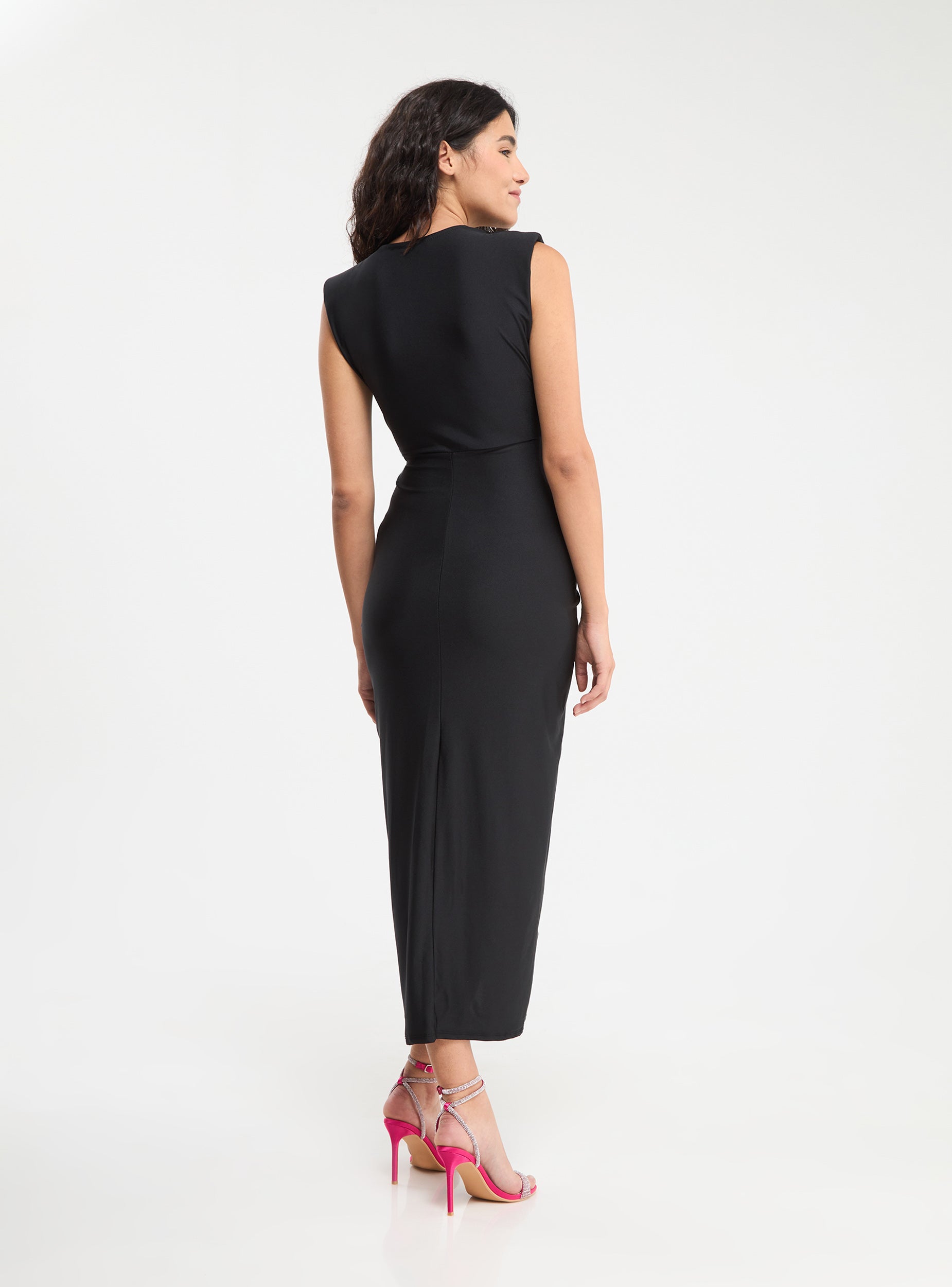 Vestito lungo da donna con spacco laterale. Scollatura profonda con drappeggio. Tessuto elasticizzato a tinta unita.La modella è alta 1,77 e indossa la taglia S.