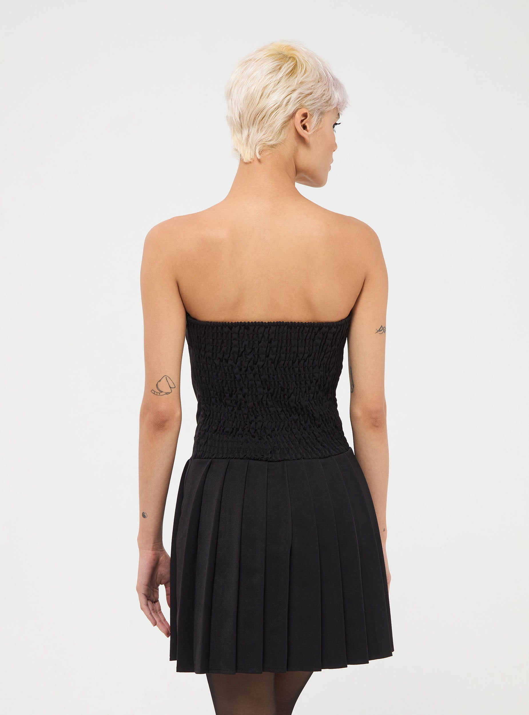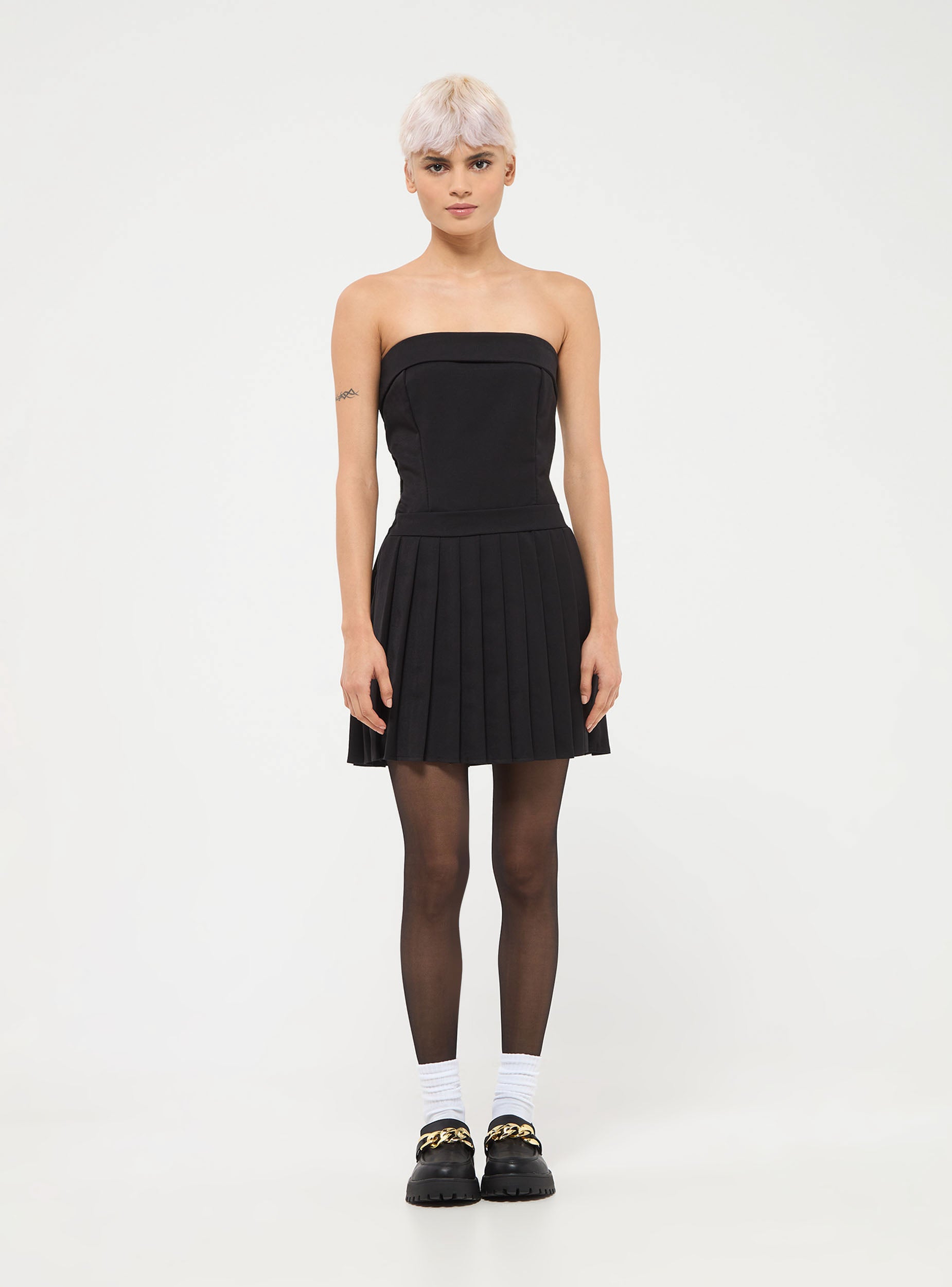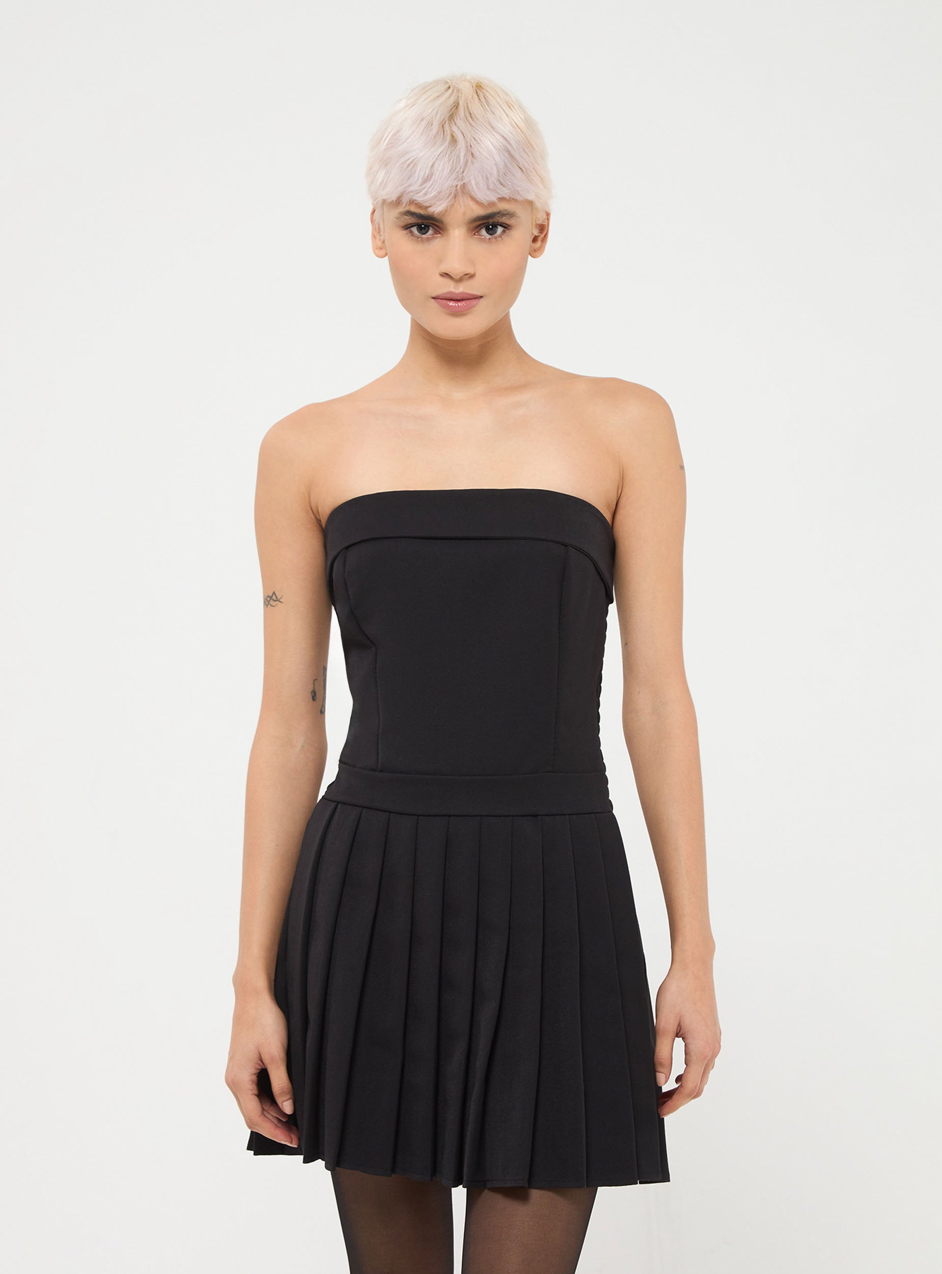 Vestito corto da donna in tessuto elasticizzato tinta unita. Modello a fascia con gonna plissettata.