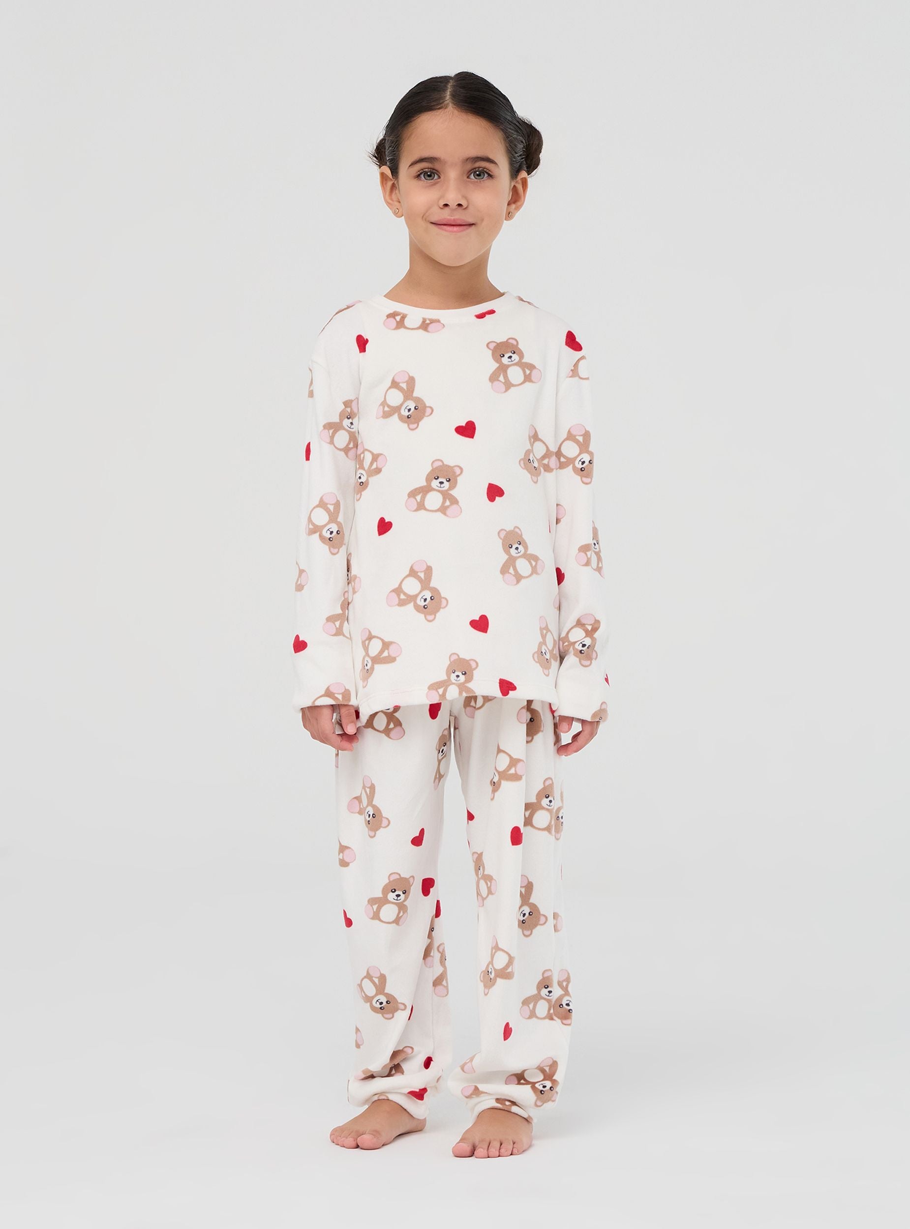 Questo adorabile pigiama da bimba, composto da una maglia a maniche lunghe e pantaloni, è perfetto per rendere ogni notte accogliente. Color crema con una fantasia di teneri orsetti e cuoricini rossi, è impreziosito da cuciture sottili per un comfort ottimale. La vestibilità è comoda e rilassata.