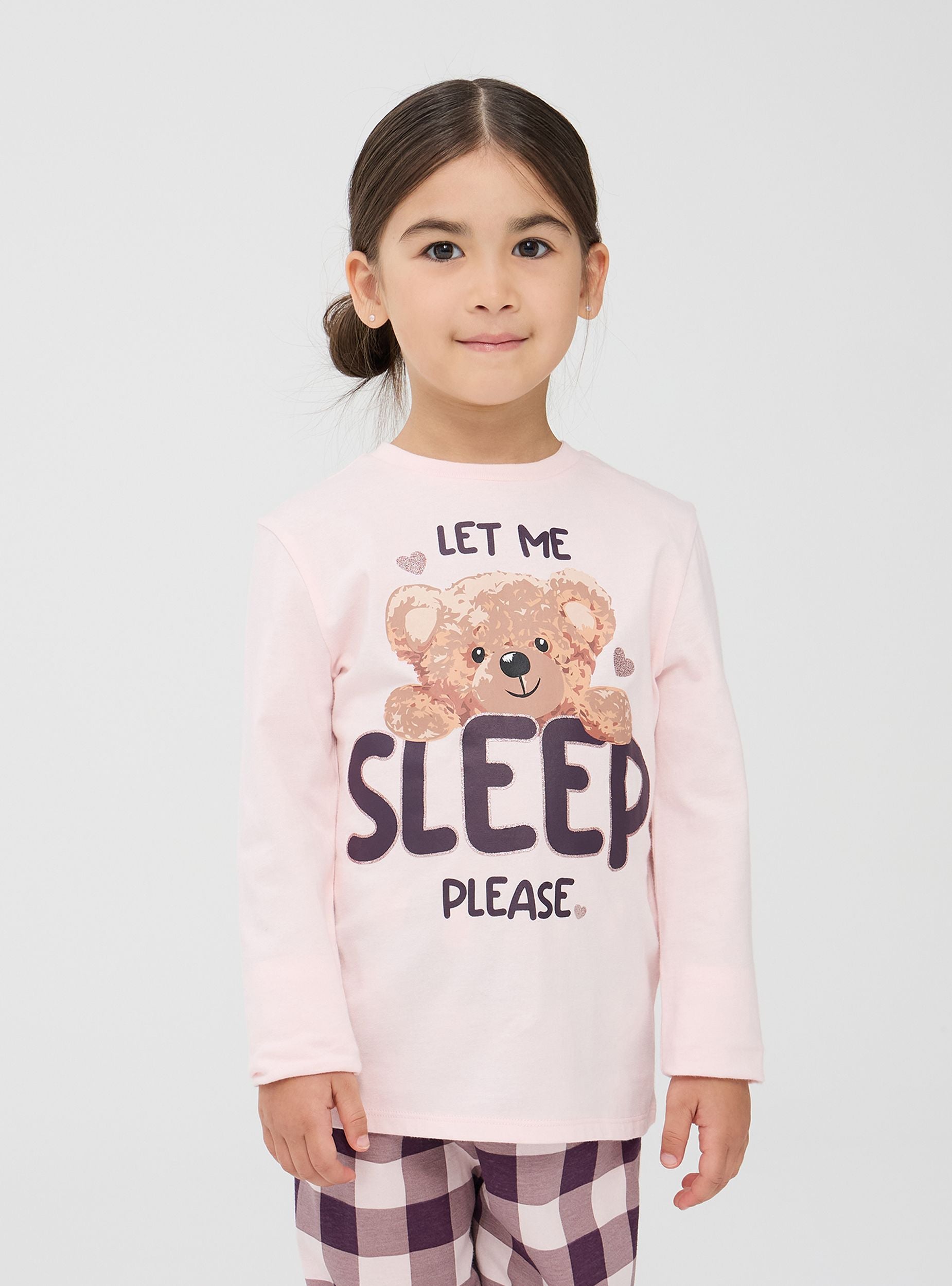 Pigiama da bimba composto da maglia a maniche lunghe e pantaloni lunghi. La maglia presenta una stampa frontale con un dolce orsetto e la scritta "Let me sleep, please." I pantaloni hanno un motivo a quadri, aggiungendo un tocco di stile al completo. Realizzato in tessuto di cotone morbido e confortevole, è ideale per garantire un riposo sereno e piacevole.