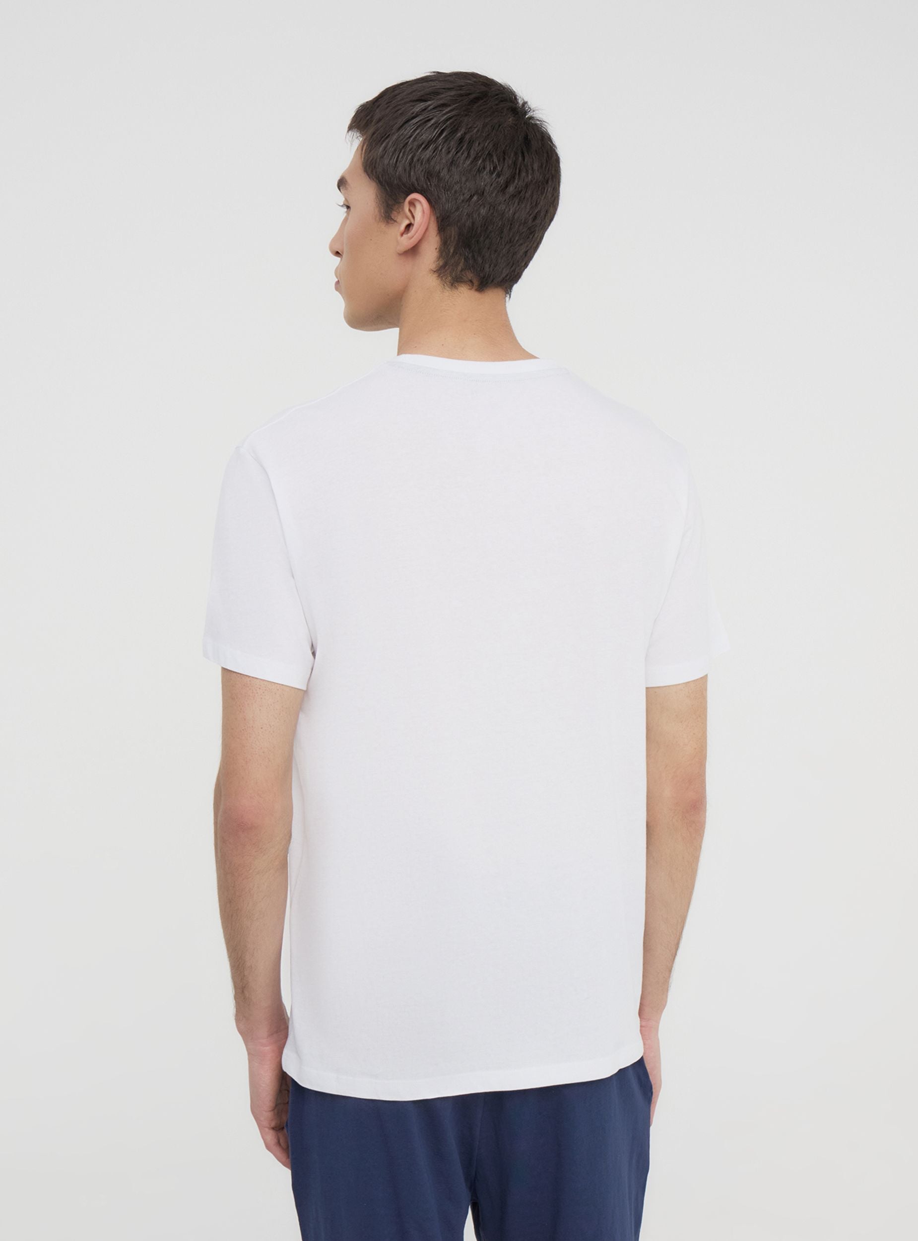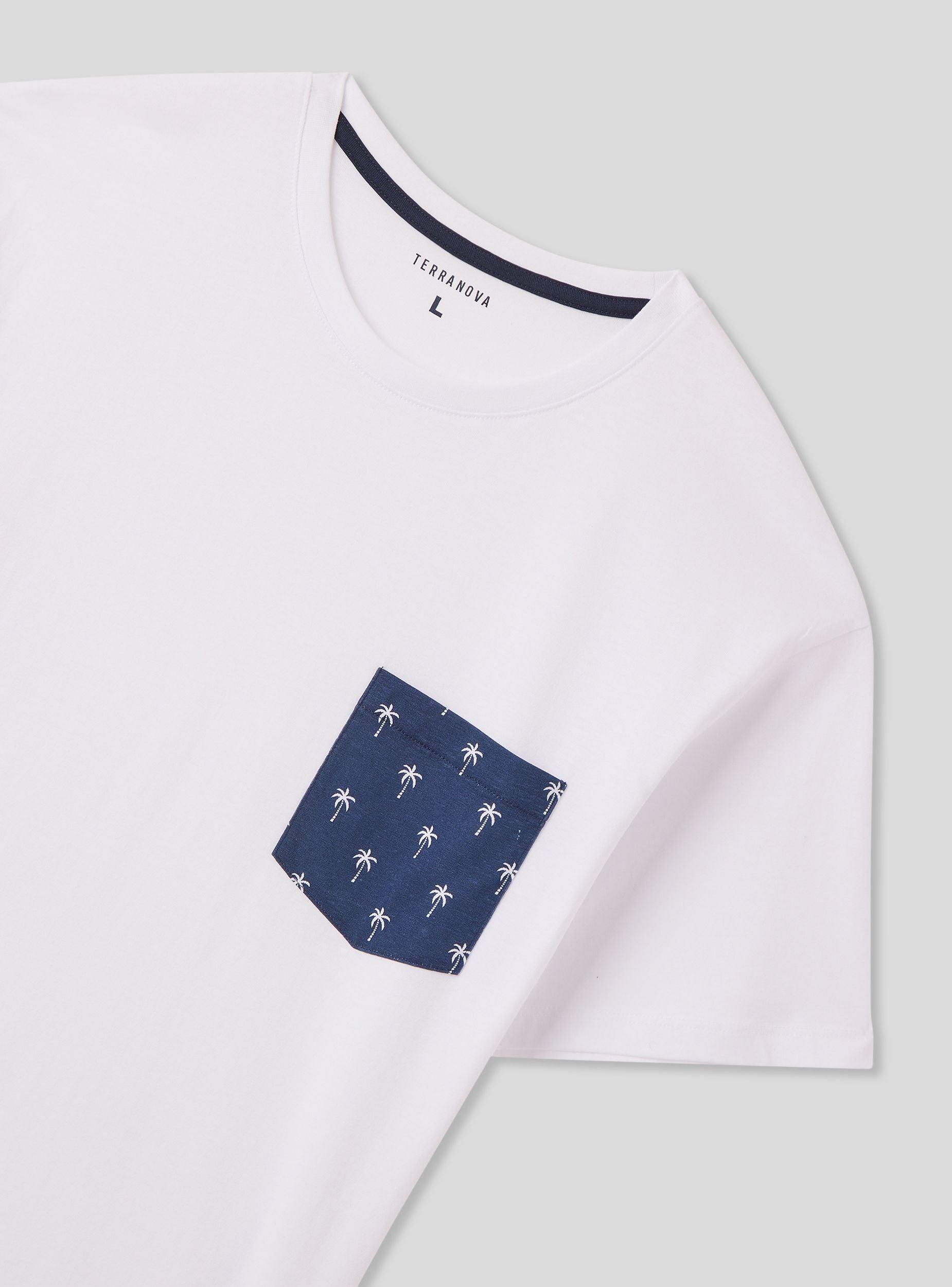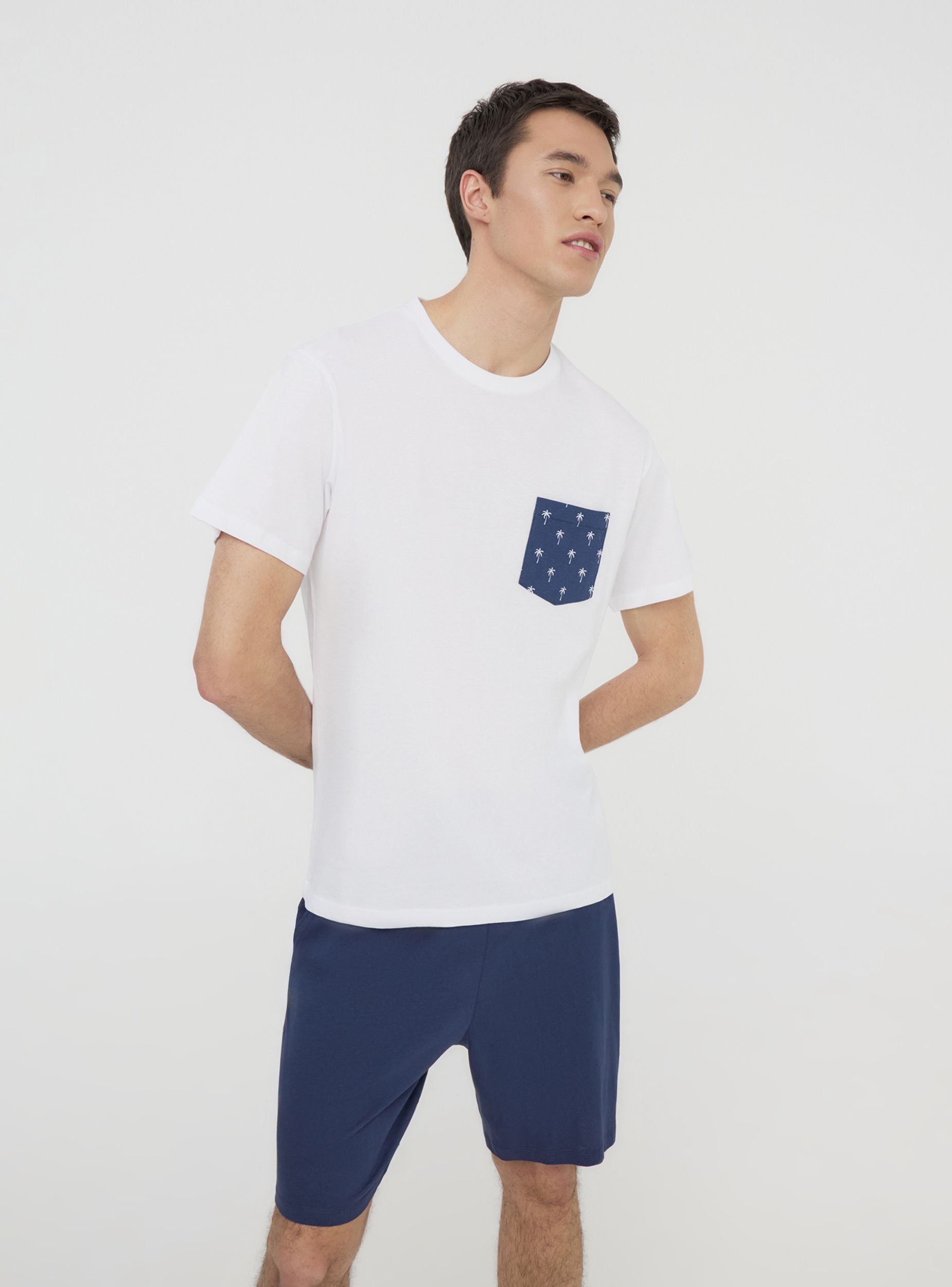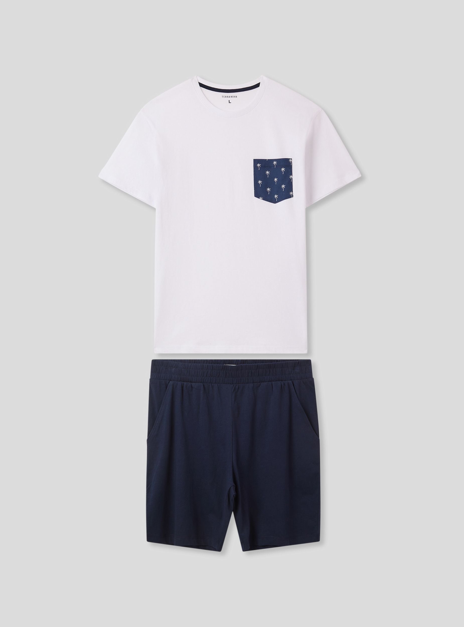 Pigiama da uomo composto da una maglietta a maniche corte e pantaloncini corti coordinati. La maglietta presenta un design essenziale arricchito da una tasca decorata con una stampa di palme, che aggiunge un tocco di freschezza e dinamismo. I pantaloncini, in tinta unita, garantiscono un fit comodo e pratico, perfetto per il relax serale. Un completo ideale per un riposo confortevole con uno stile curato e rilassato.