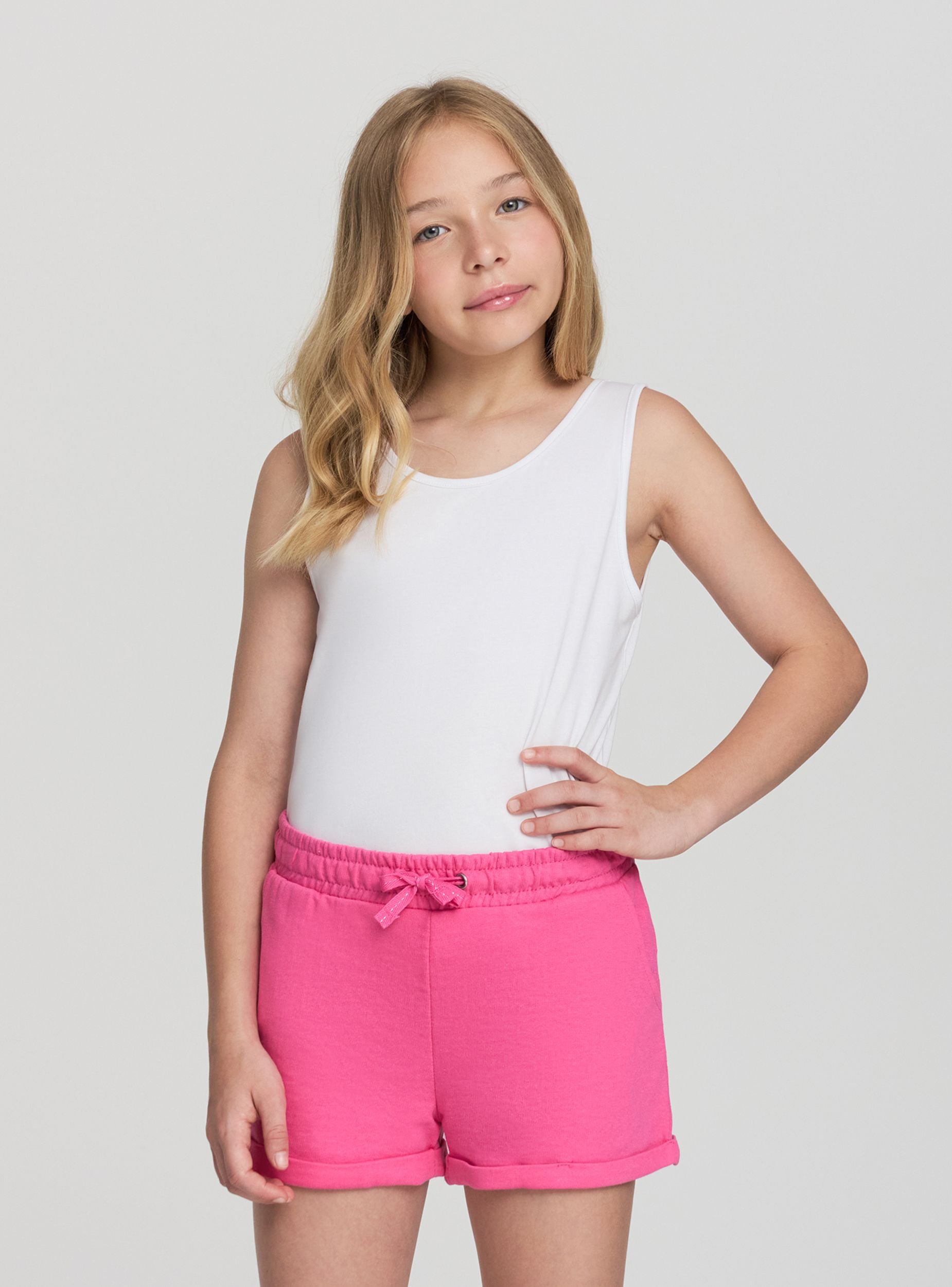Pantaloncini leggeri della tuta da bambina ideali per il tempo libero e le giornate più attive. Con elastico in vita e pratica coulisse regolabile, offrono un fit comodo e sicuro. La tinta unita e il dettaglio del risvolto aggiungono un tocco moderno, mentre le tasche laterali sono perfette per piccoli oggetti. Perfetti da abbinare a t-shirt colorate e sneakers per un look dinamico e versatile.