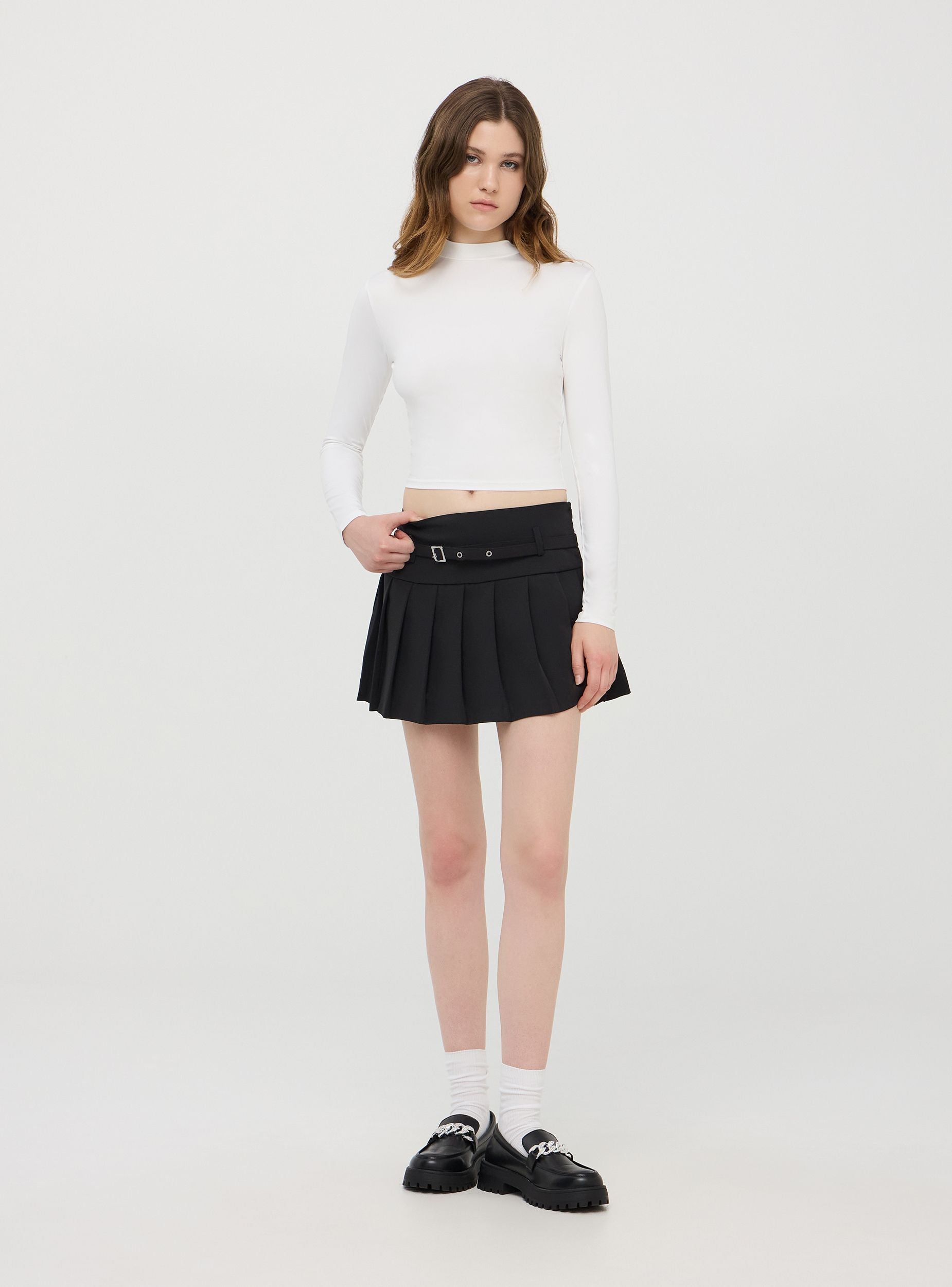 Gonna-pantaloncini da donna a pieghe a tinta unita, perfetta per un outfit dal tocco elegante e moderno. Presenta una cintura in vita con fibbia metallica e passanti, aggiungendo un dettaglio raffinato. La vestibilità è aderente in vita e leggermente svasata sul fondo, per un look casual ma sofisticato. Chiusura con zip laterale nascosta. Ideale per occasioni informali, uscite serali e appuntamenti. Abbinabile sia con top che maglioncini.