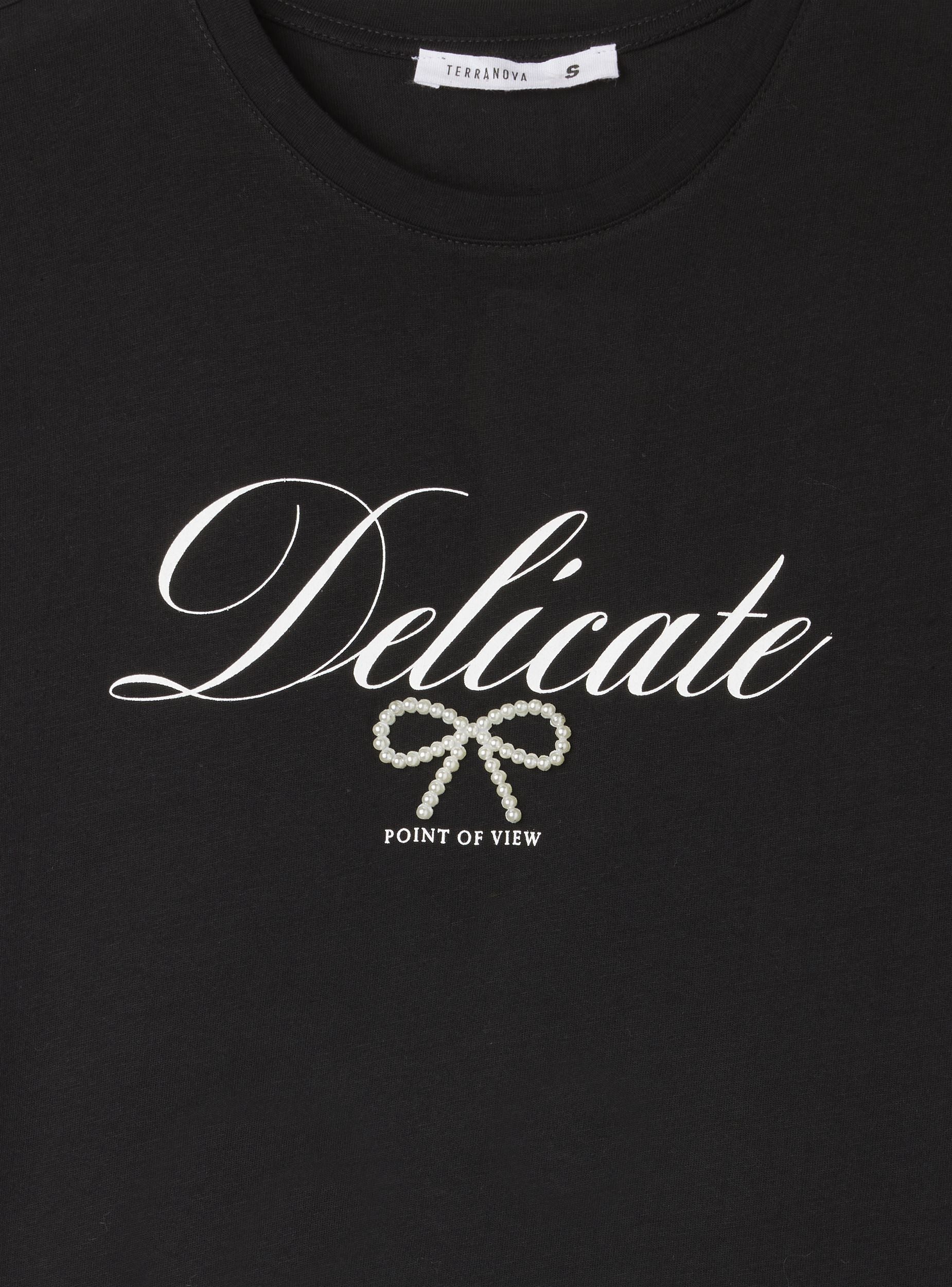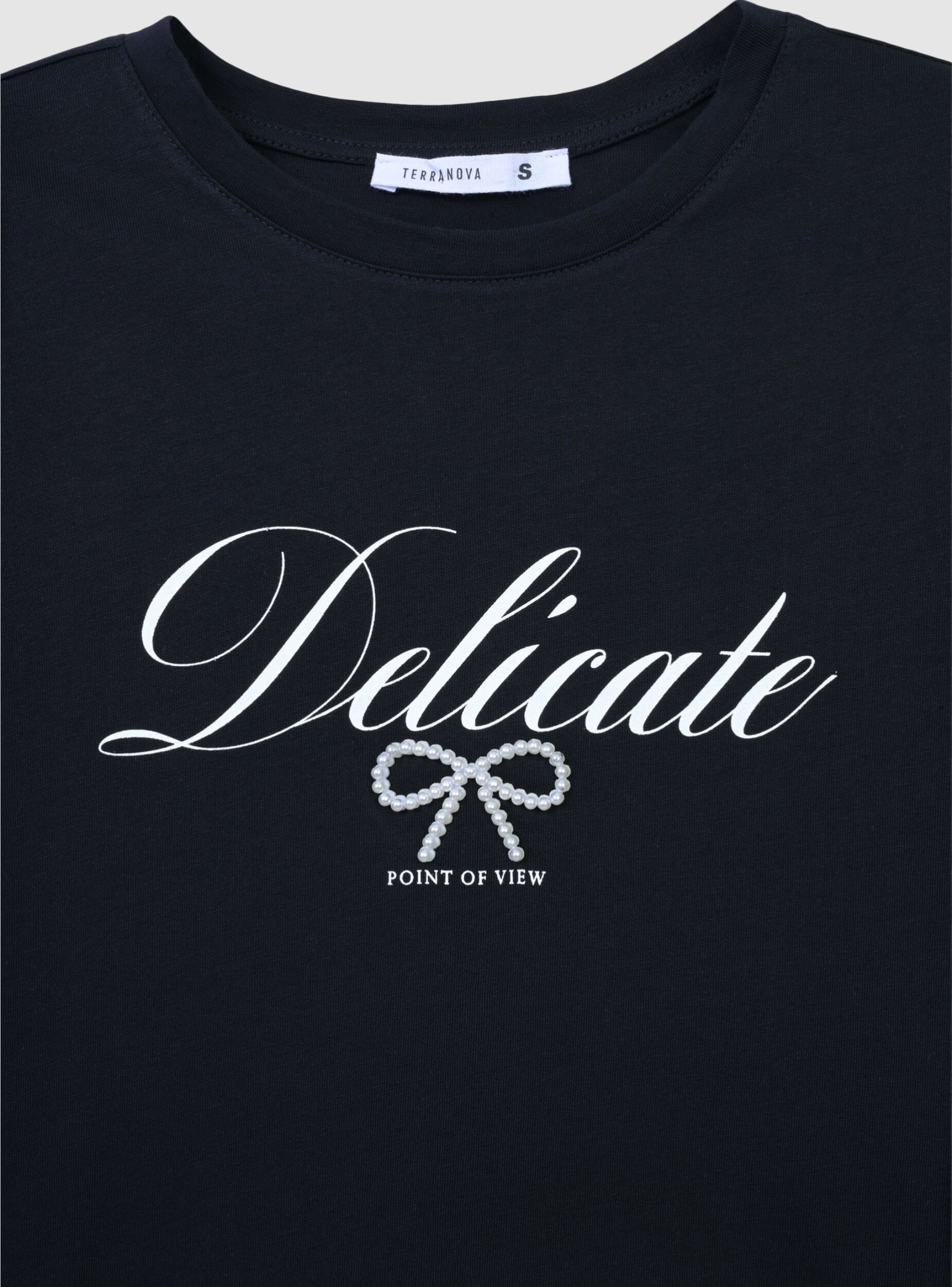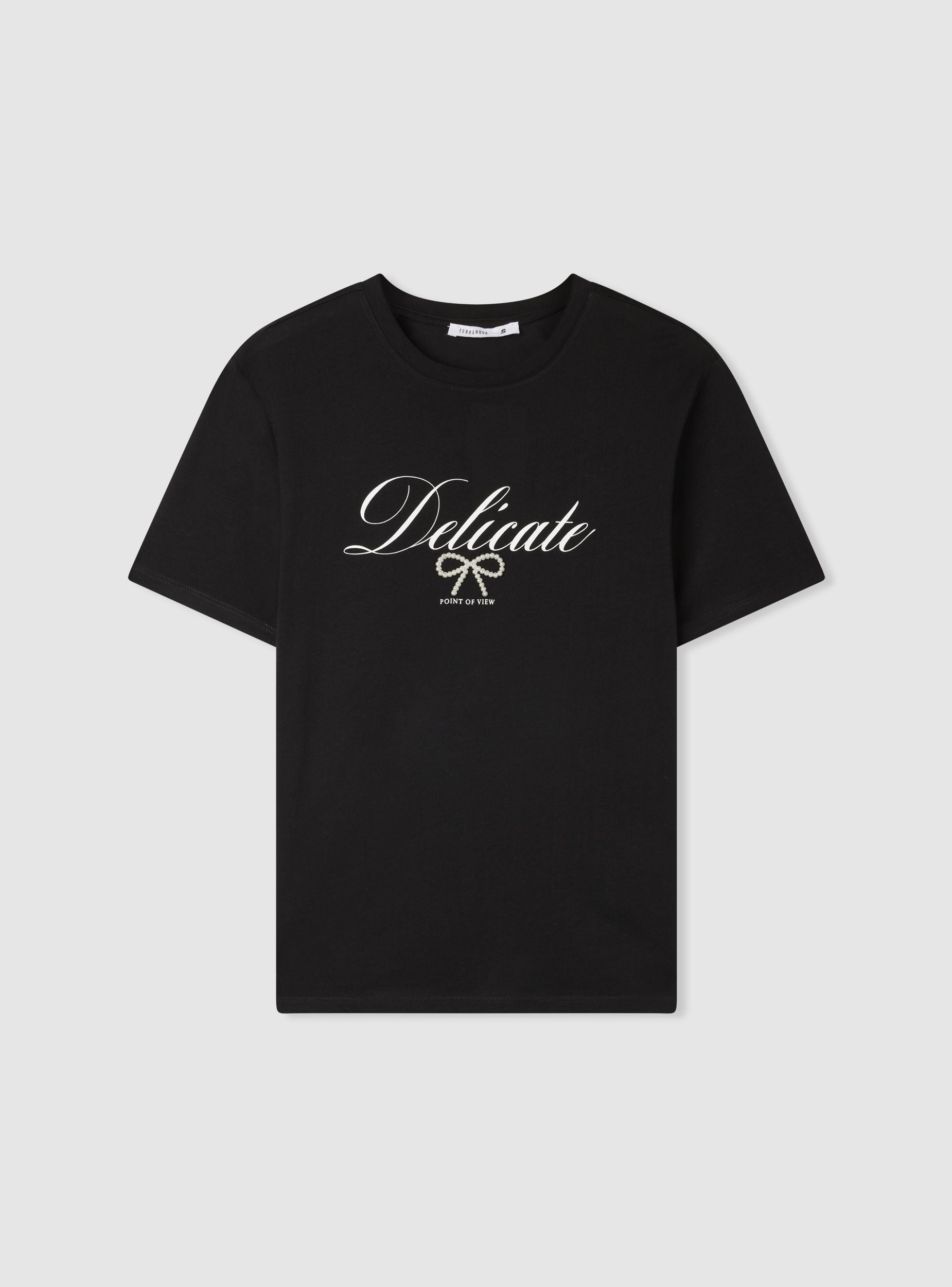 Maglietta da donna con scritta decorativa, ideale per un look casual e alla moda. Perfetta per essere abbinata a jeans o pantaloni, questa maglietta offre un fit ampio che garantisce comfort e stile. La scritta aggiunge un tocco distintivo mentre le perle applicate a forma di fiocco offrono un dettaglio originale, rendendola adatta per il tempo libero o per un outfit casual chic. Un capo versatile per arricchire il guardaroba quotidiano.